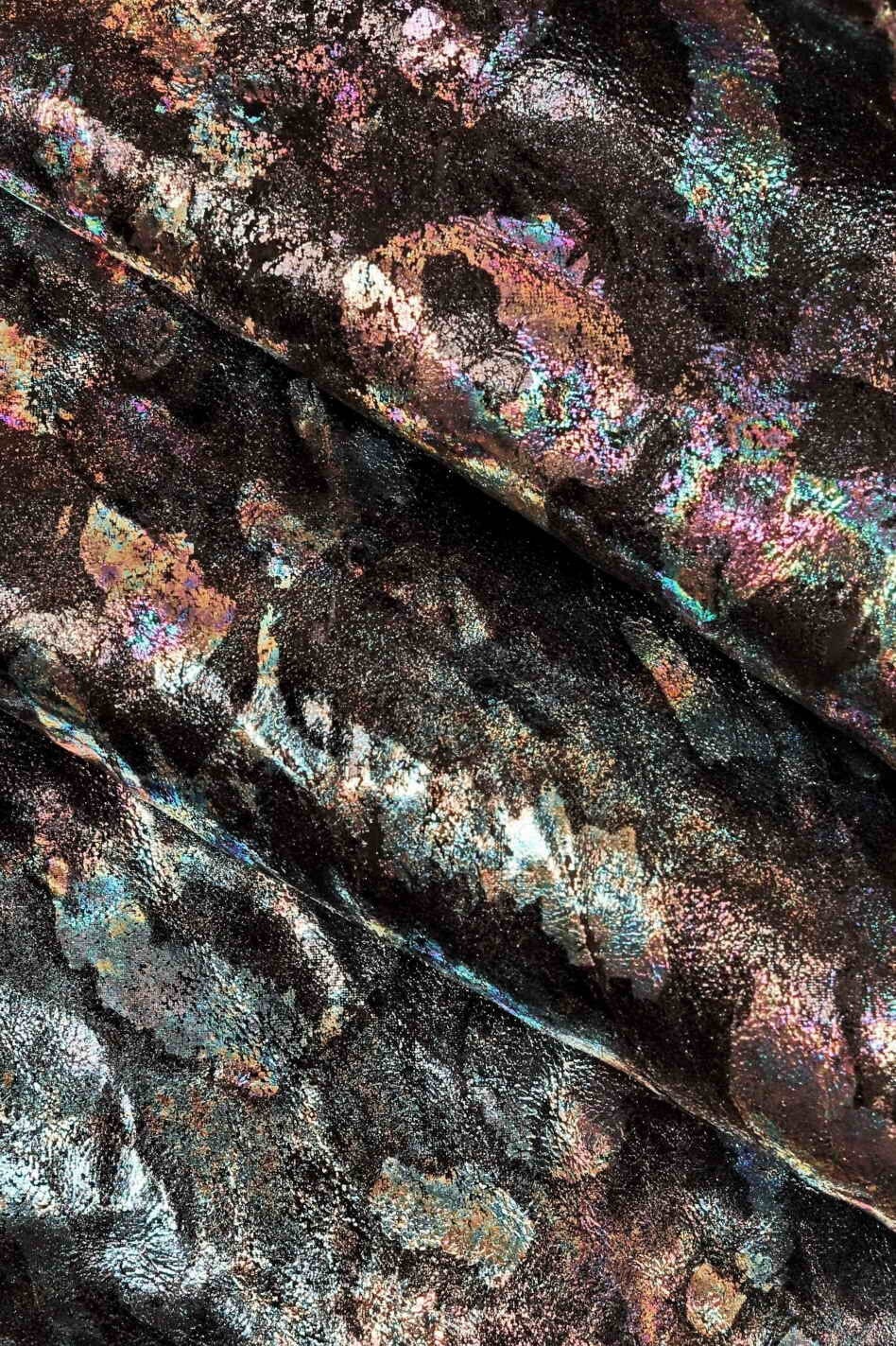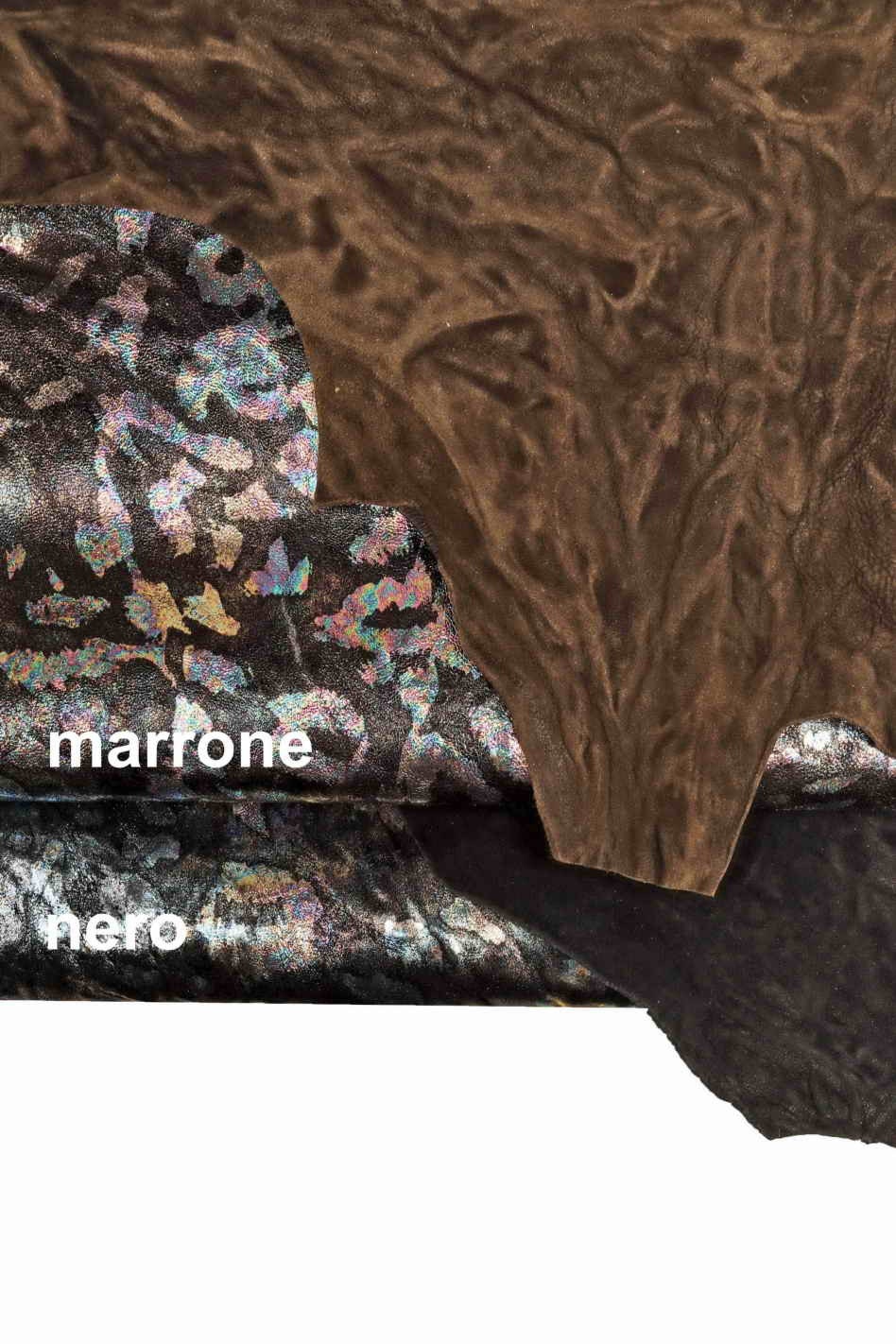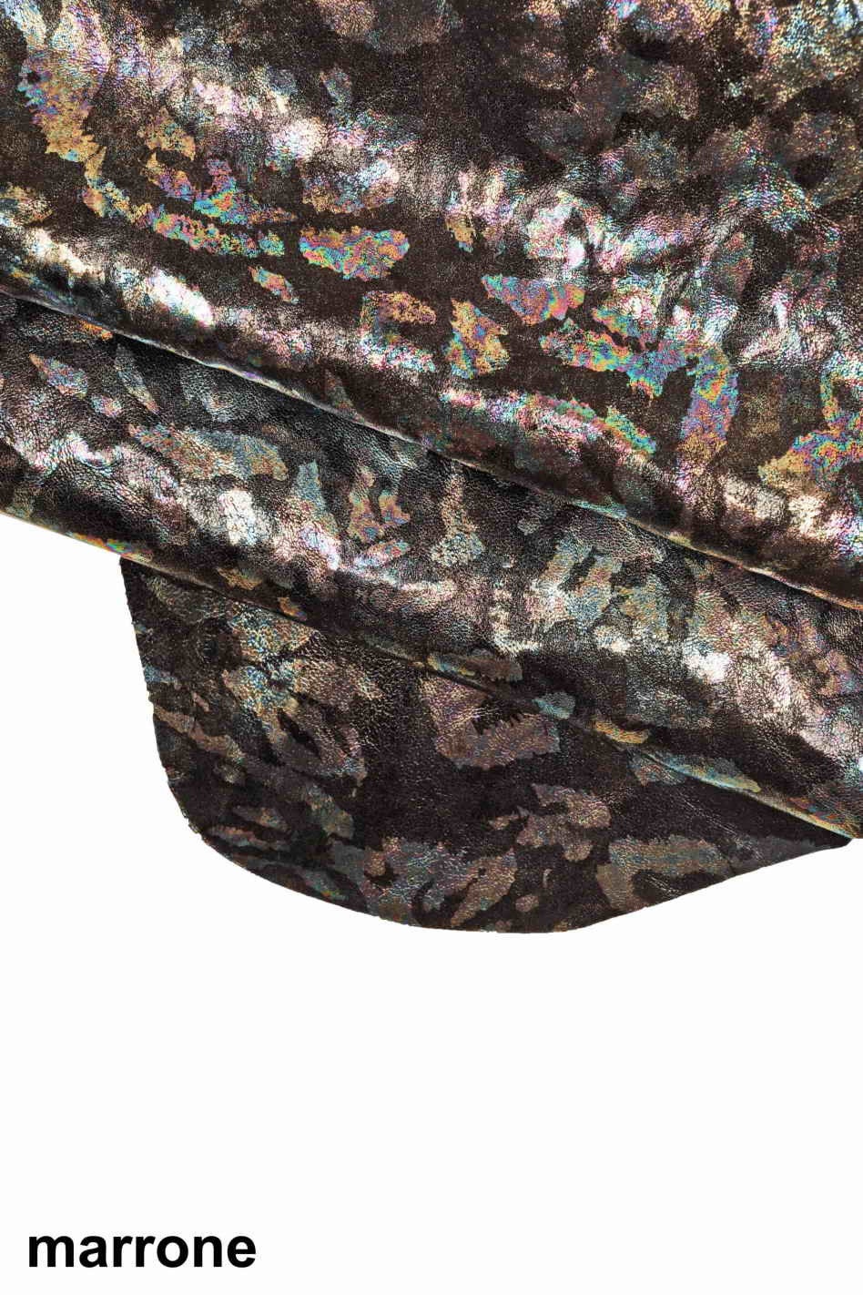 Italian leather, vegetable nappa leather on metallic sheepskin with oleographic effect leopard print, wrinkled, very shiny, very soft, sporty look, available in two bases, marrone and nero.