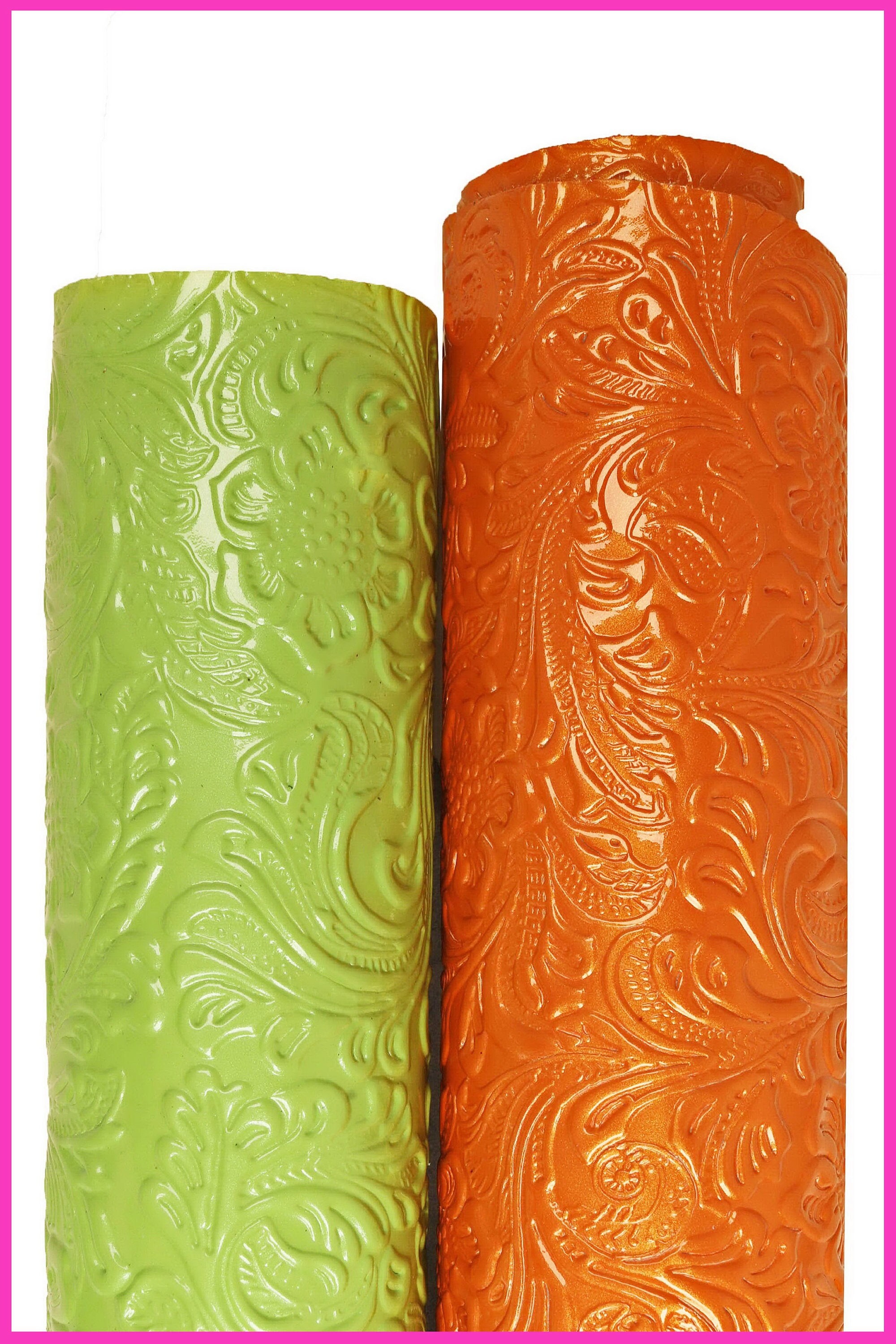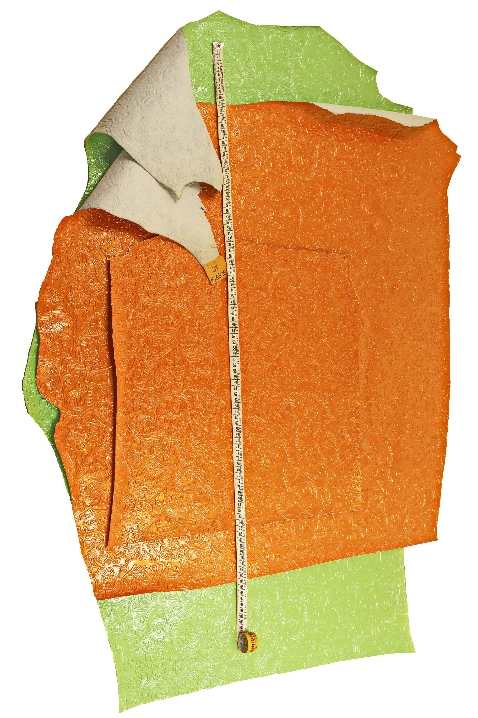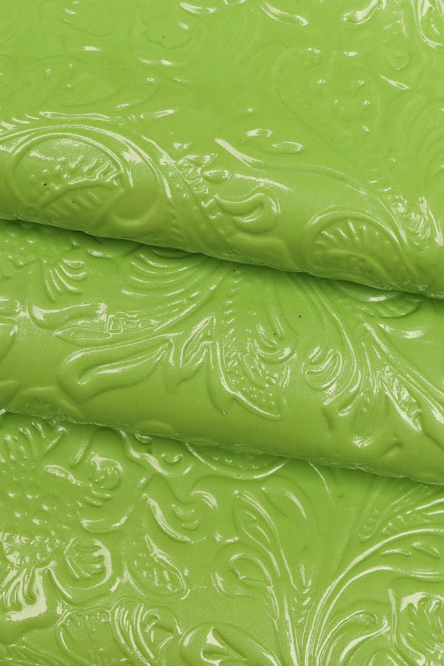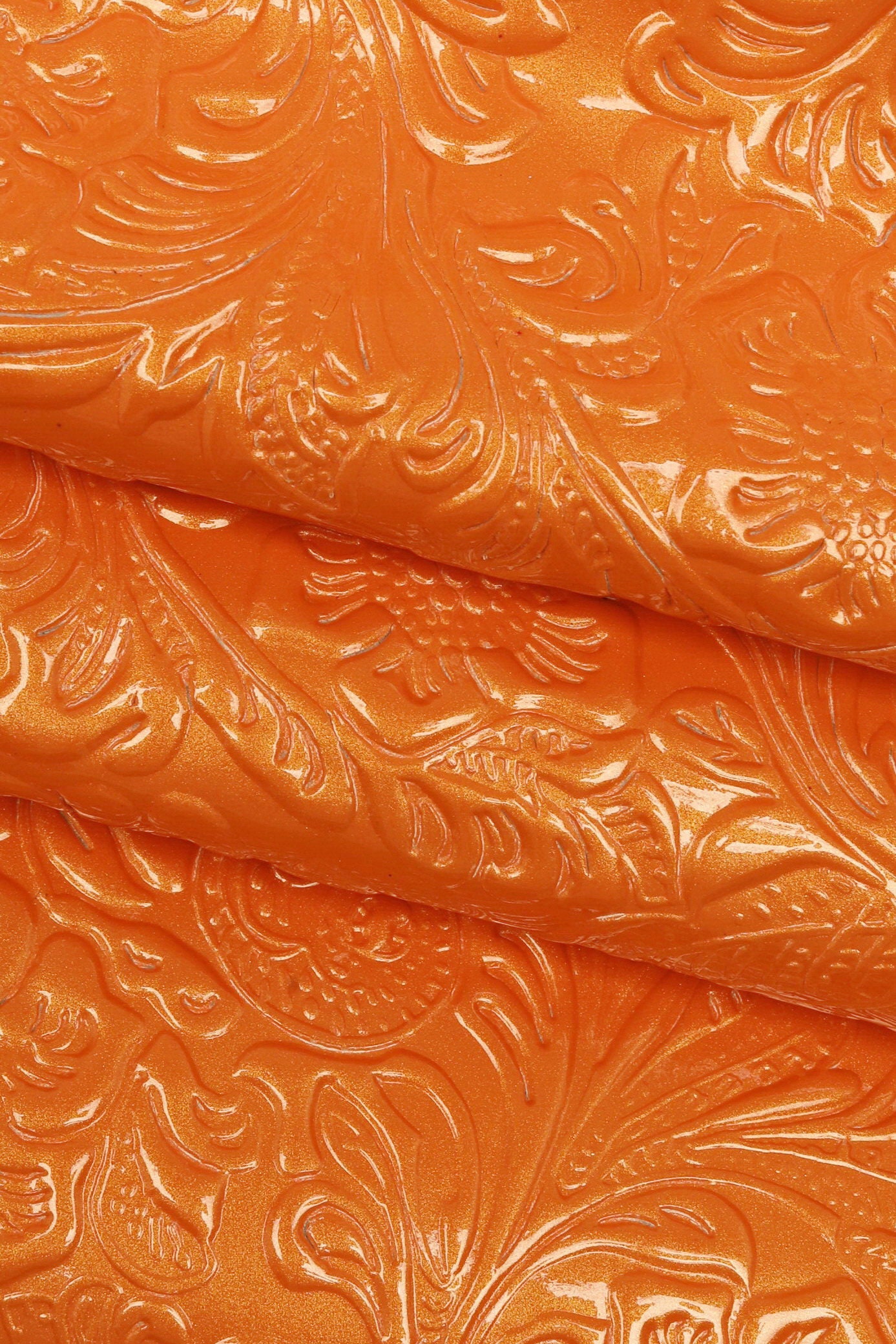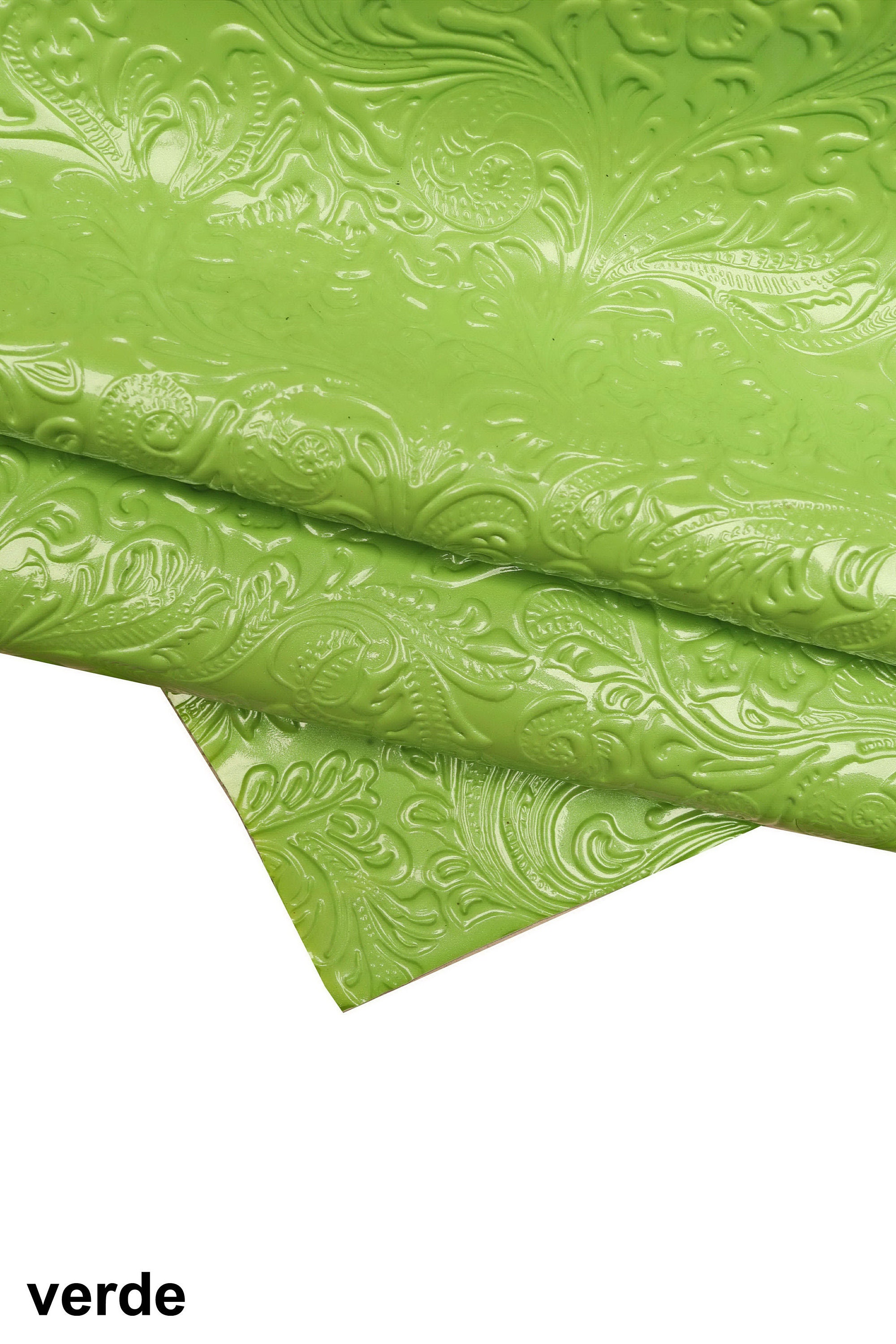 Beautiful green and orange patent cowhide with embossed floral print, glossy, medium softness.