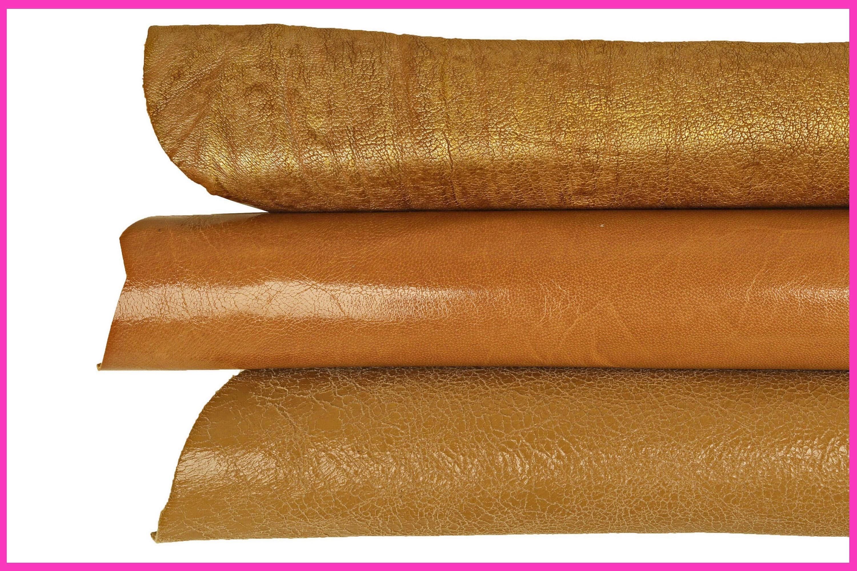 Wonderful assortment of 3 beige, goat leather and gold leathers, smooth, laminated and printed, combined as shown in the photo.