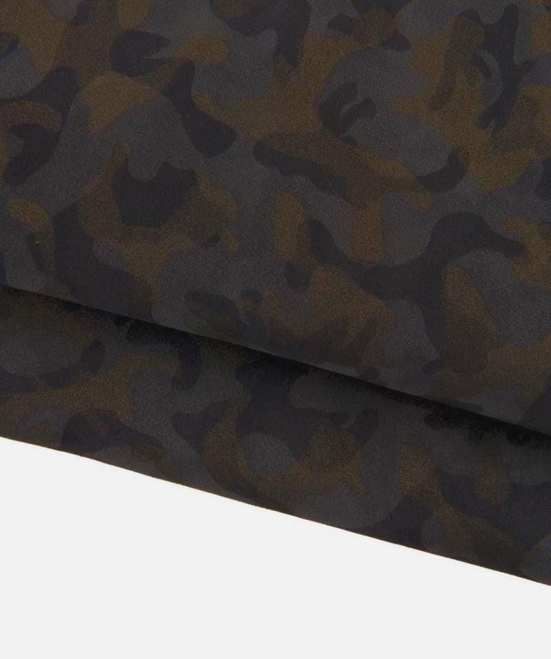 Fantastic suede calfskin with grey military print and bronze glitter.
