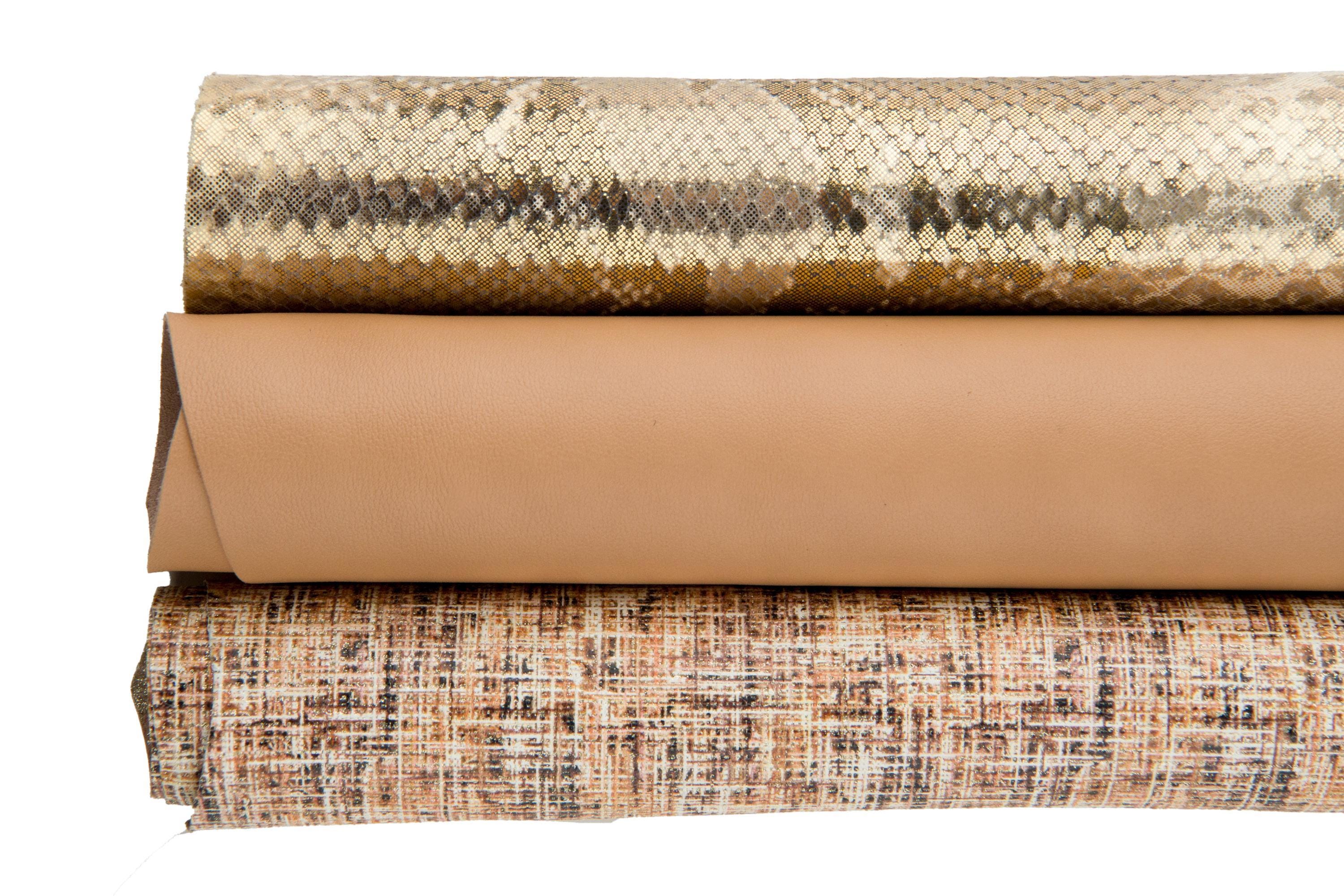 Beautiful set of 3 assorted beige gold leathers, 1 smooth calfskin and 2 printed laminated leathers as shown in the photo.