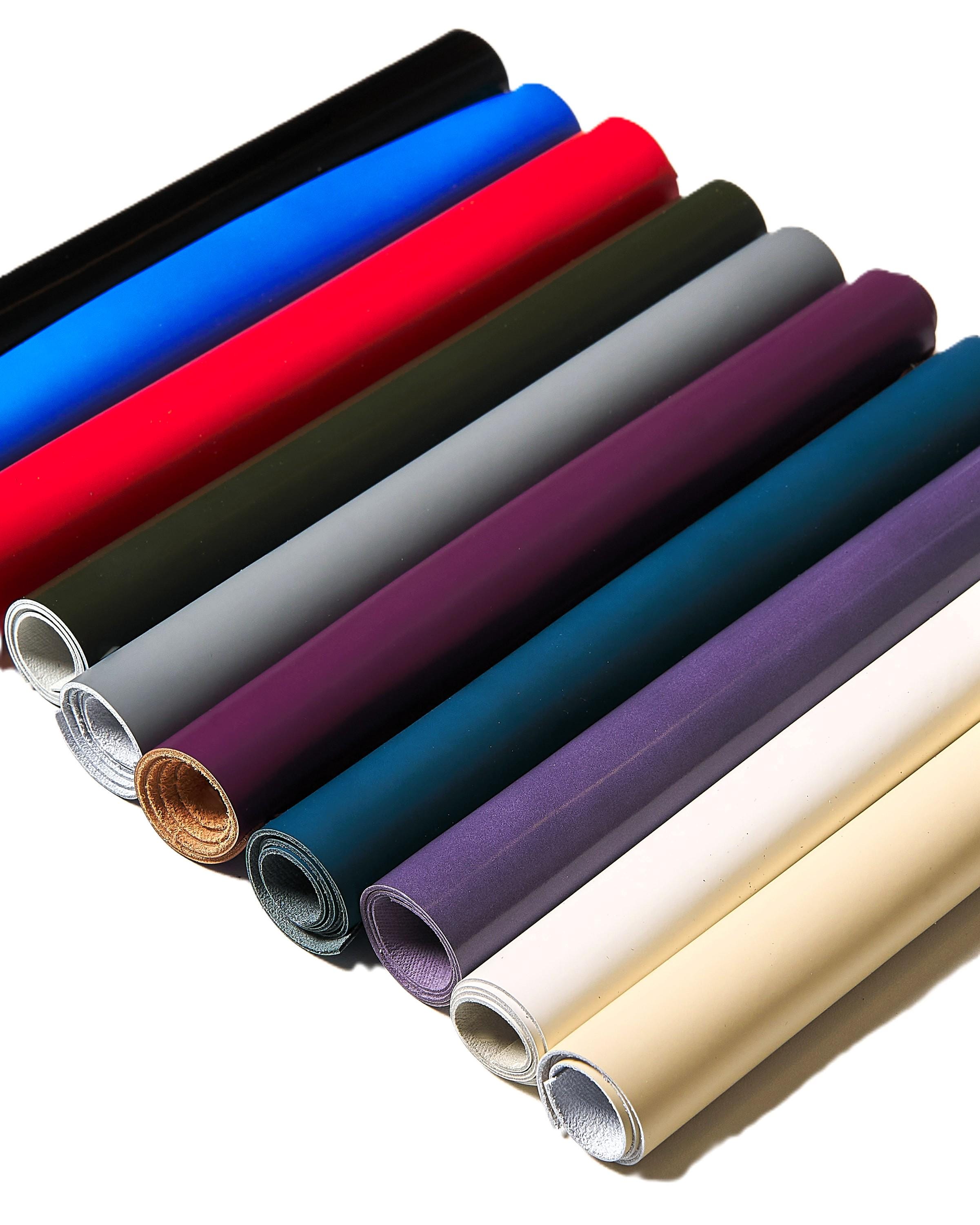 10 fancy leather pieces, brushed, colors various, solid colors, smooth with different thicknesses and softness. Cutouts of genuine Italian leather.