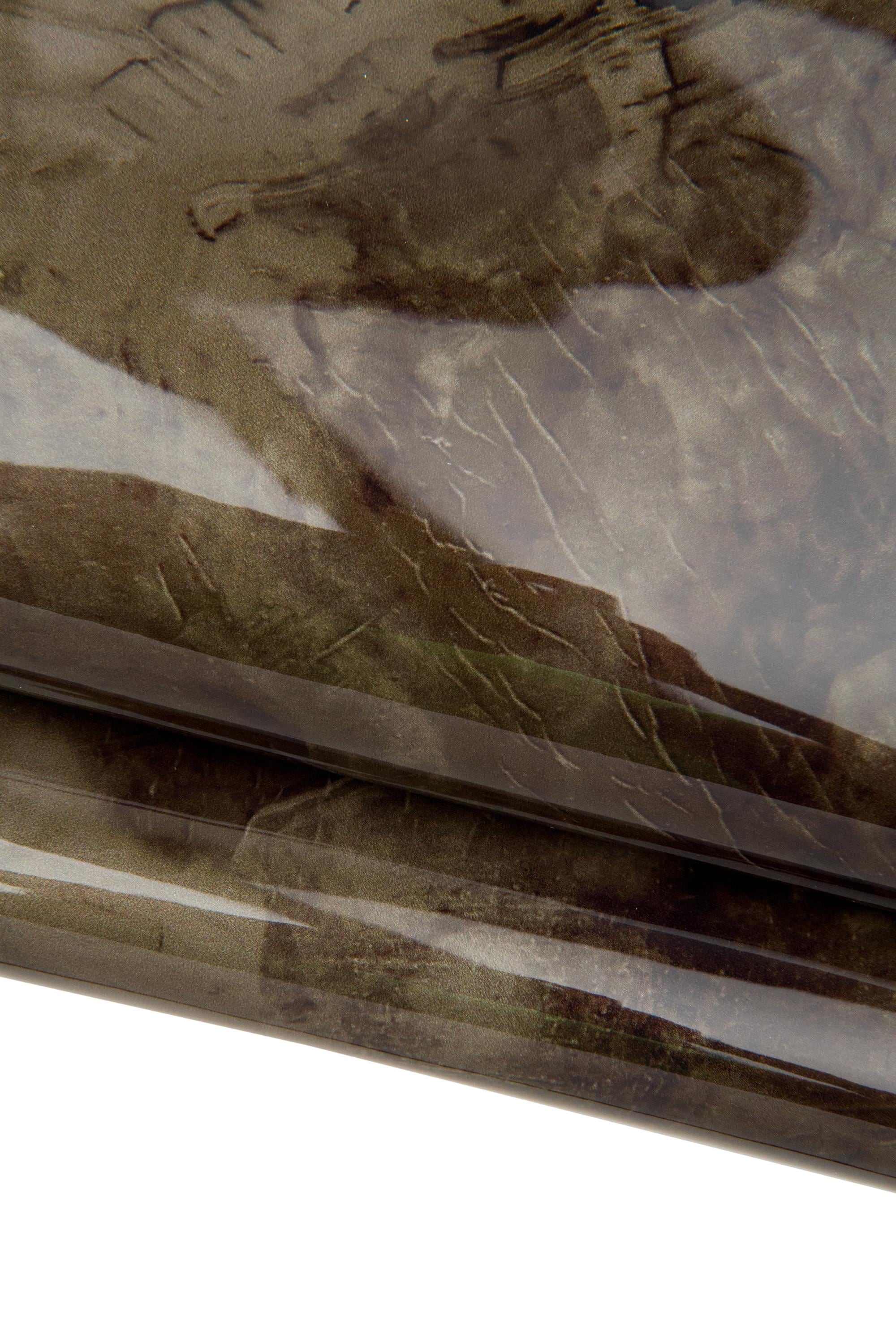 Elegant mud brown patent cowhide, glossy lacquered leather hide, abstract print on calfskin, medium softness