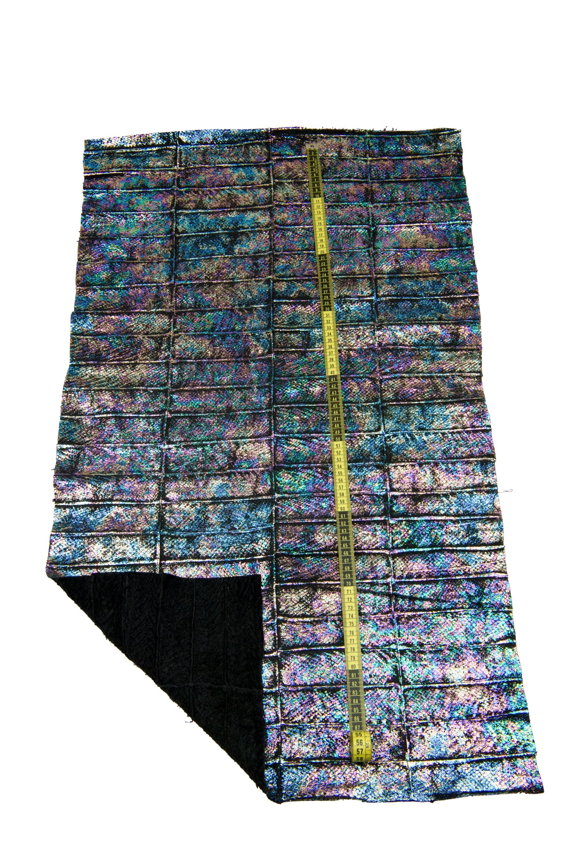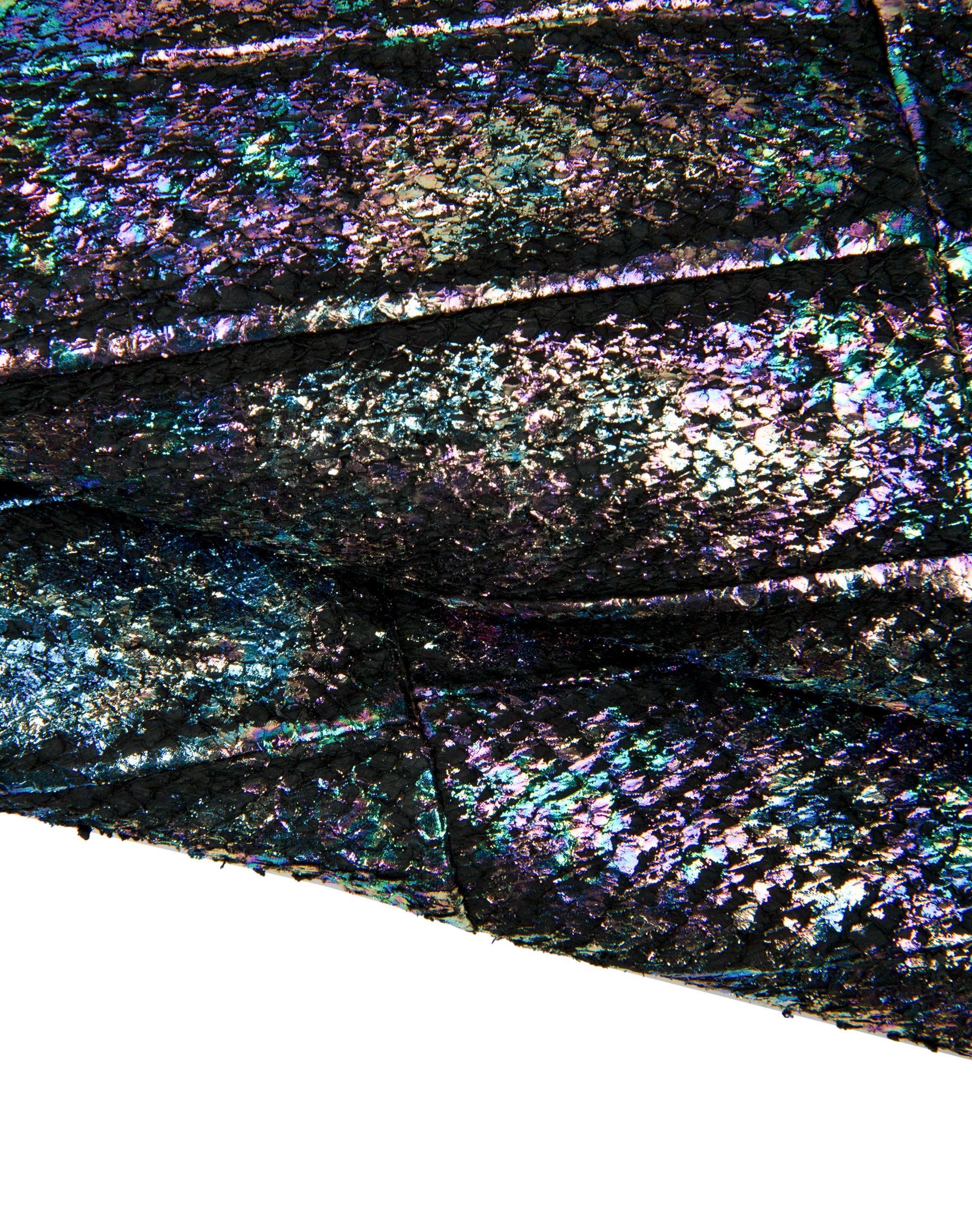 Particular salmon cloth, genuine black leather with multicolor metallic holographic print.