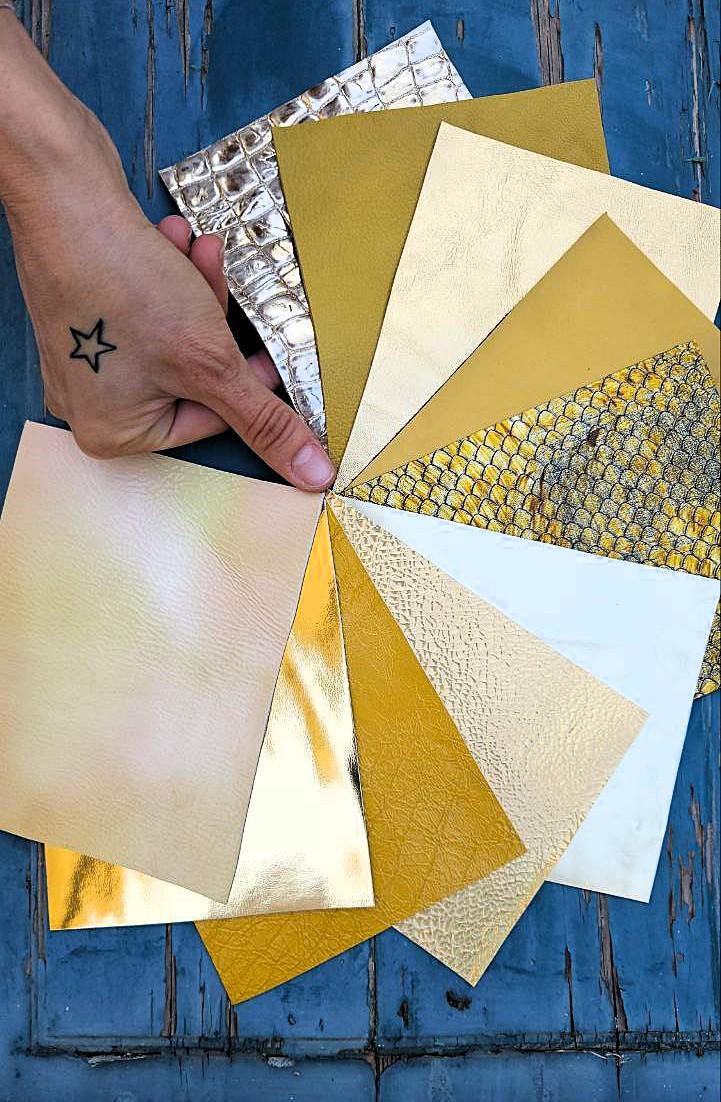 10 leather offcuts of patterned mixed leather with different prints, foils, sporty / refined look. Cutouts of genuine Italian leather. Minimum size 5 x 6 inches (12 x 15 cm)