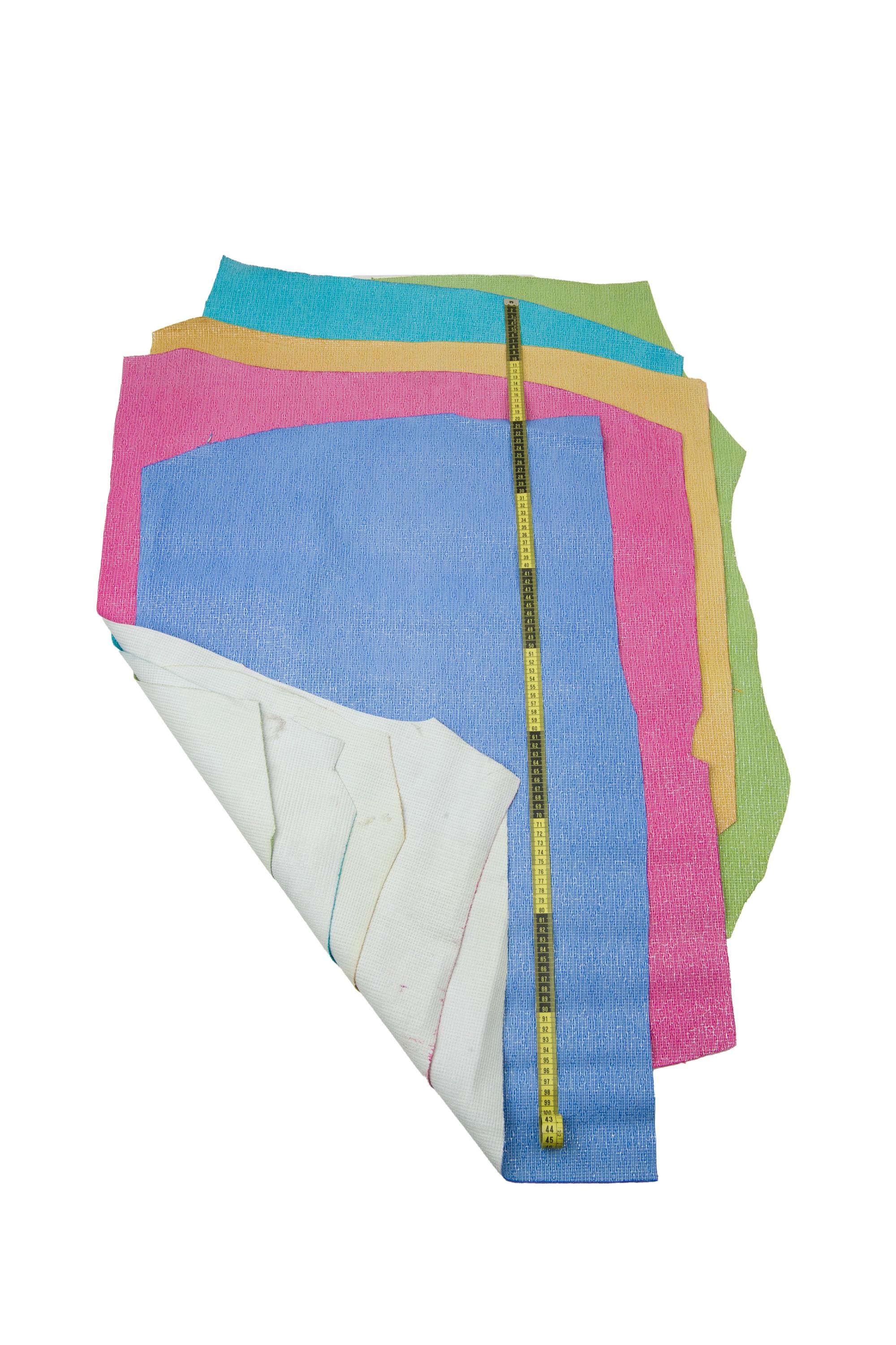Fabulous colorful printed suede leather hides, light blue, yellow, blue, fuxia, green, metallic calfskins for hobbyists.