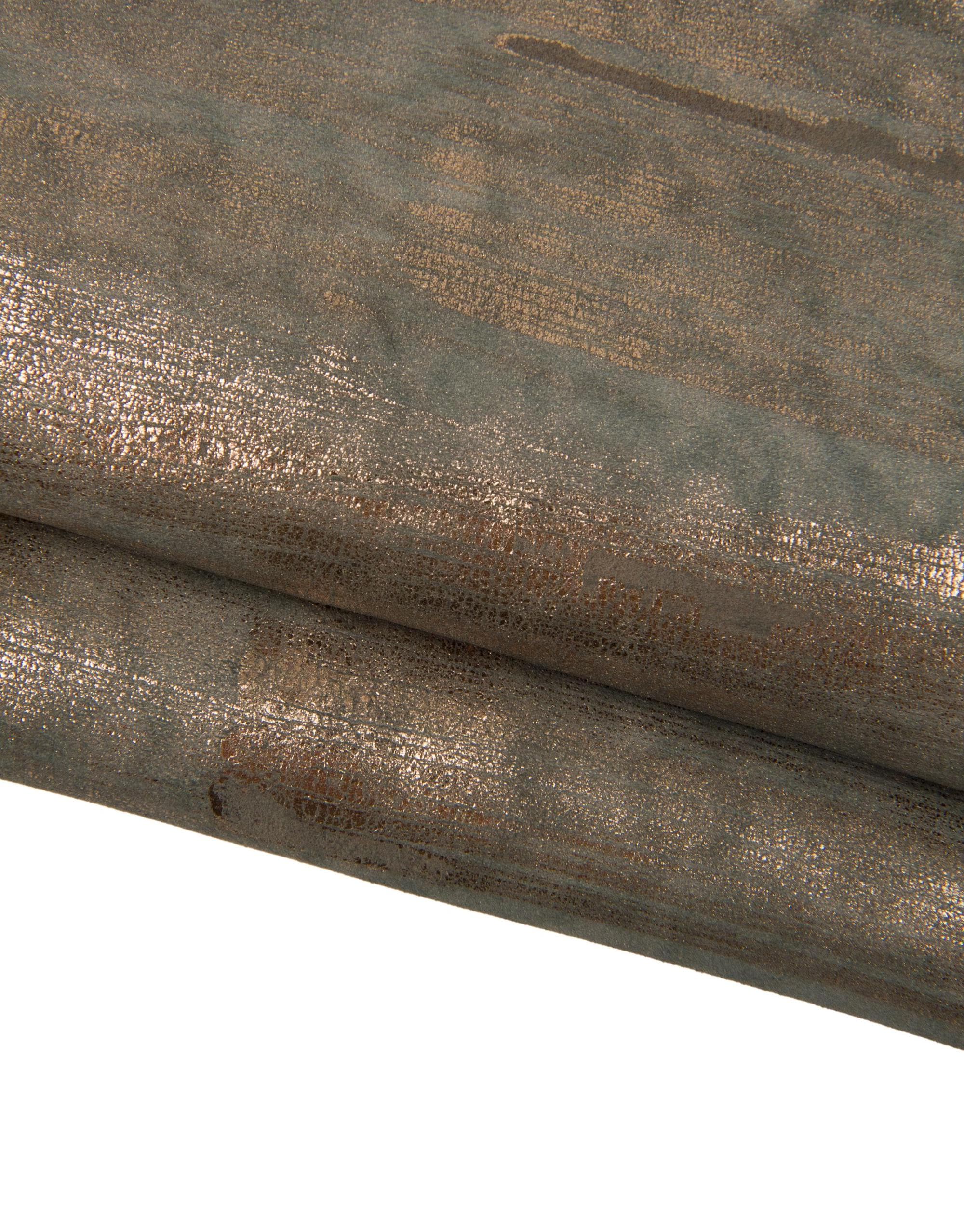 Incredible grey bronze leather skin, metallic strokes print on suede goatskin, sporty soft hide.