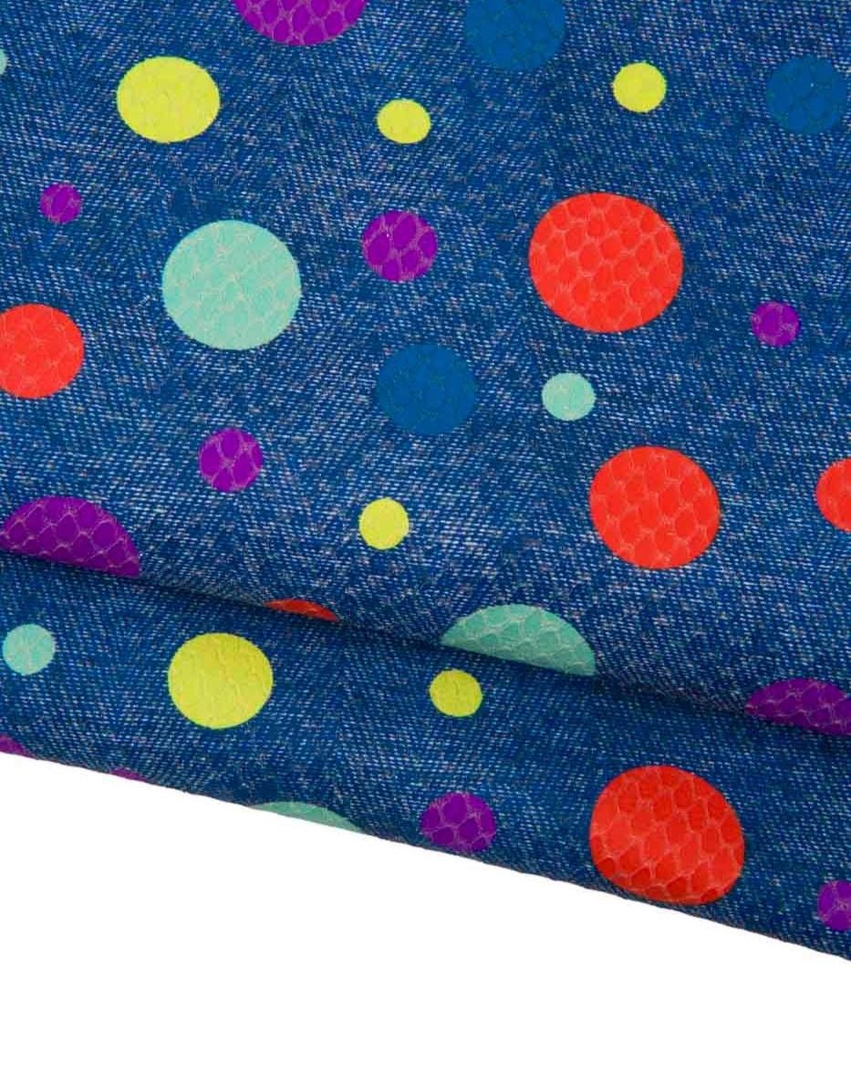 Unique multicolor polka dots textured leather skin, colorful circles print on blu jeans base goatskin hide for crafting.