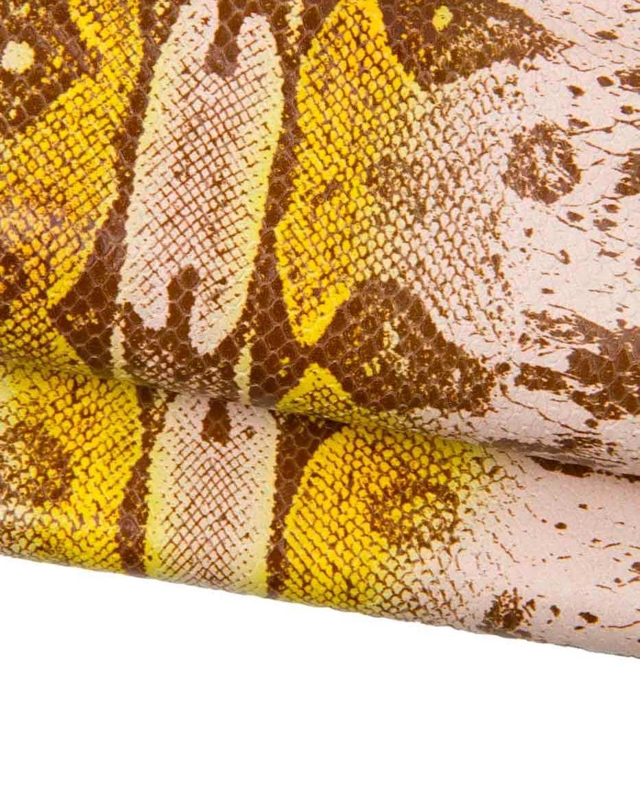 Incredible reptile printed leather hide, yellow - brown - powder pink snake textured cowhide, glossy soft skin for crafters.