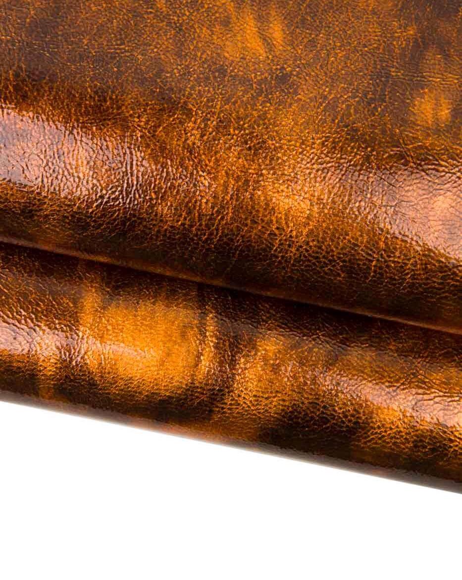 Particular glossy shaded goatskin leather, orange - black metallic patent skin, grainy wrinkled soft hide for hobbyists