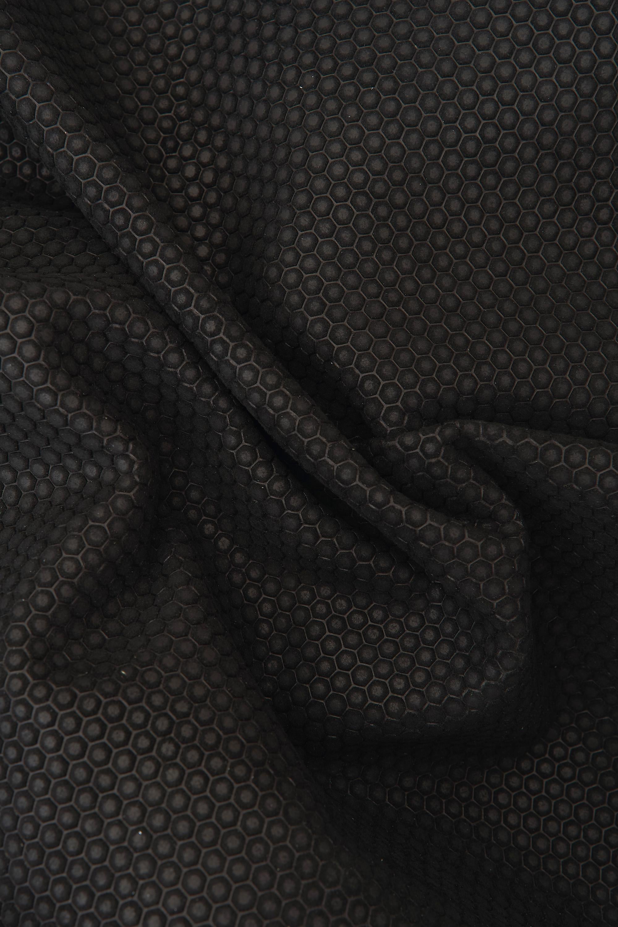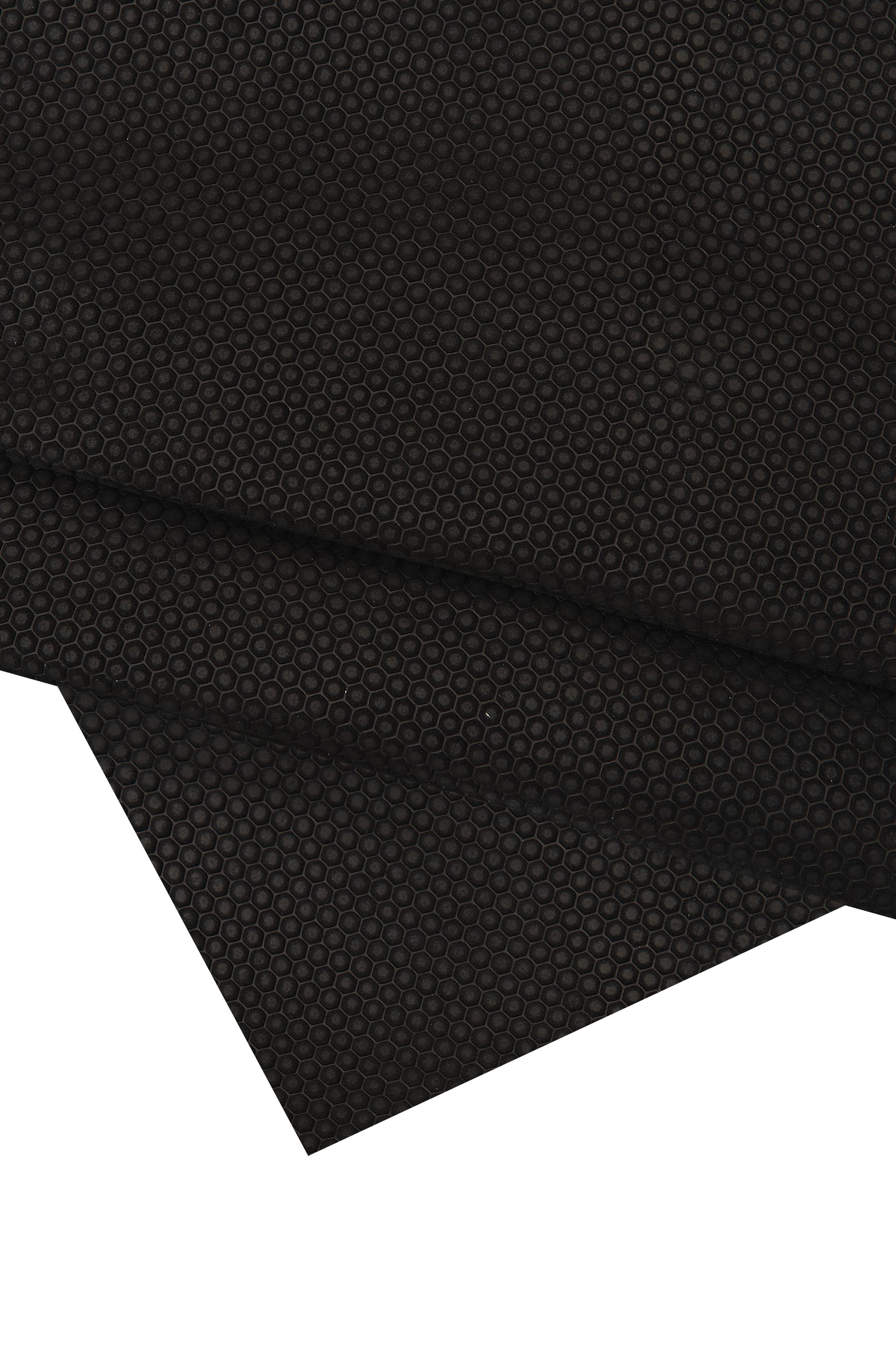 Fantastic black suede goatskin hide with an hexagonal relief print on skin for DIY projects.