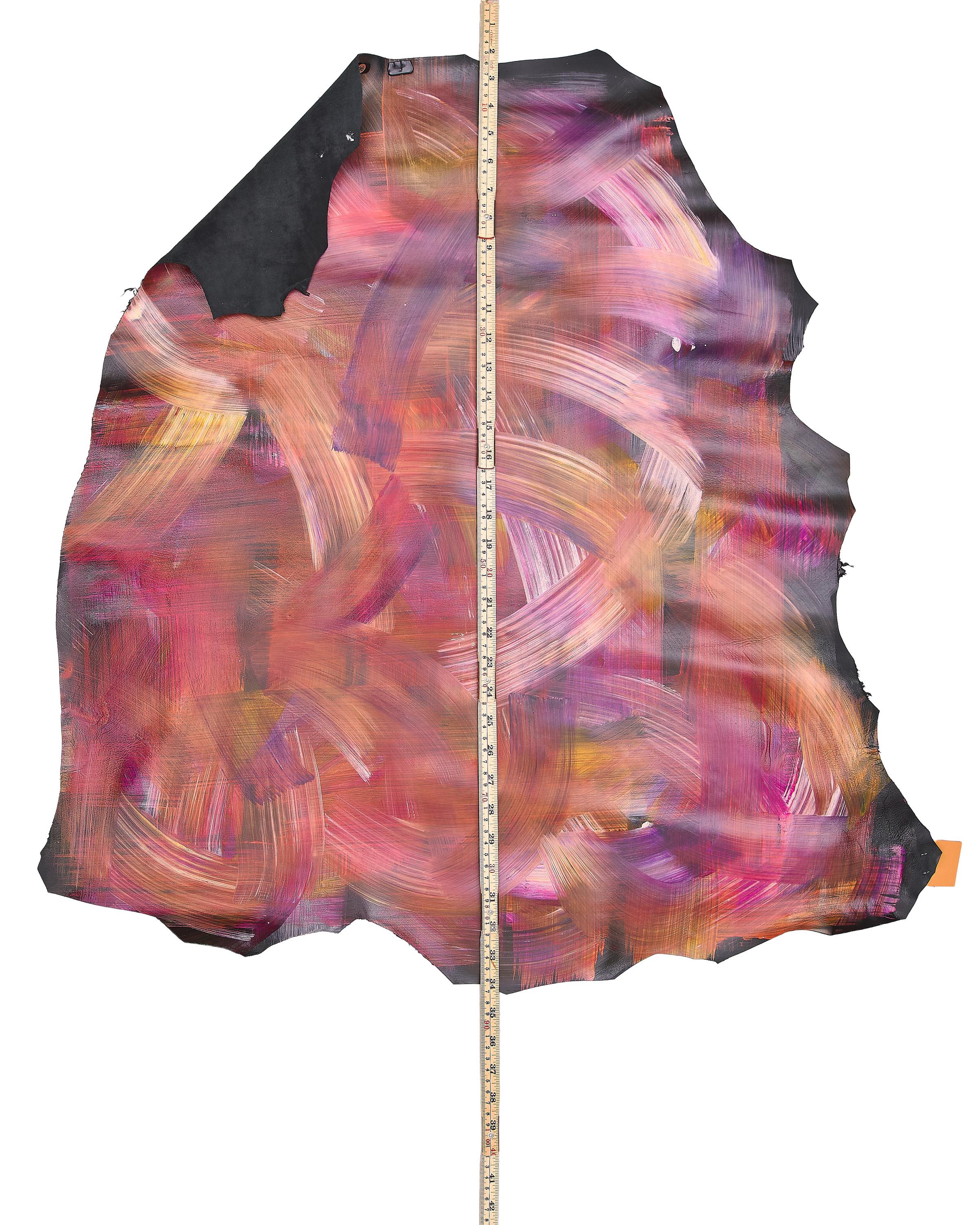 Multicolor glossy leather skin, soft rubbery smooth hand paineted goatskin, strokes pattern on hide.
