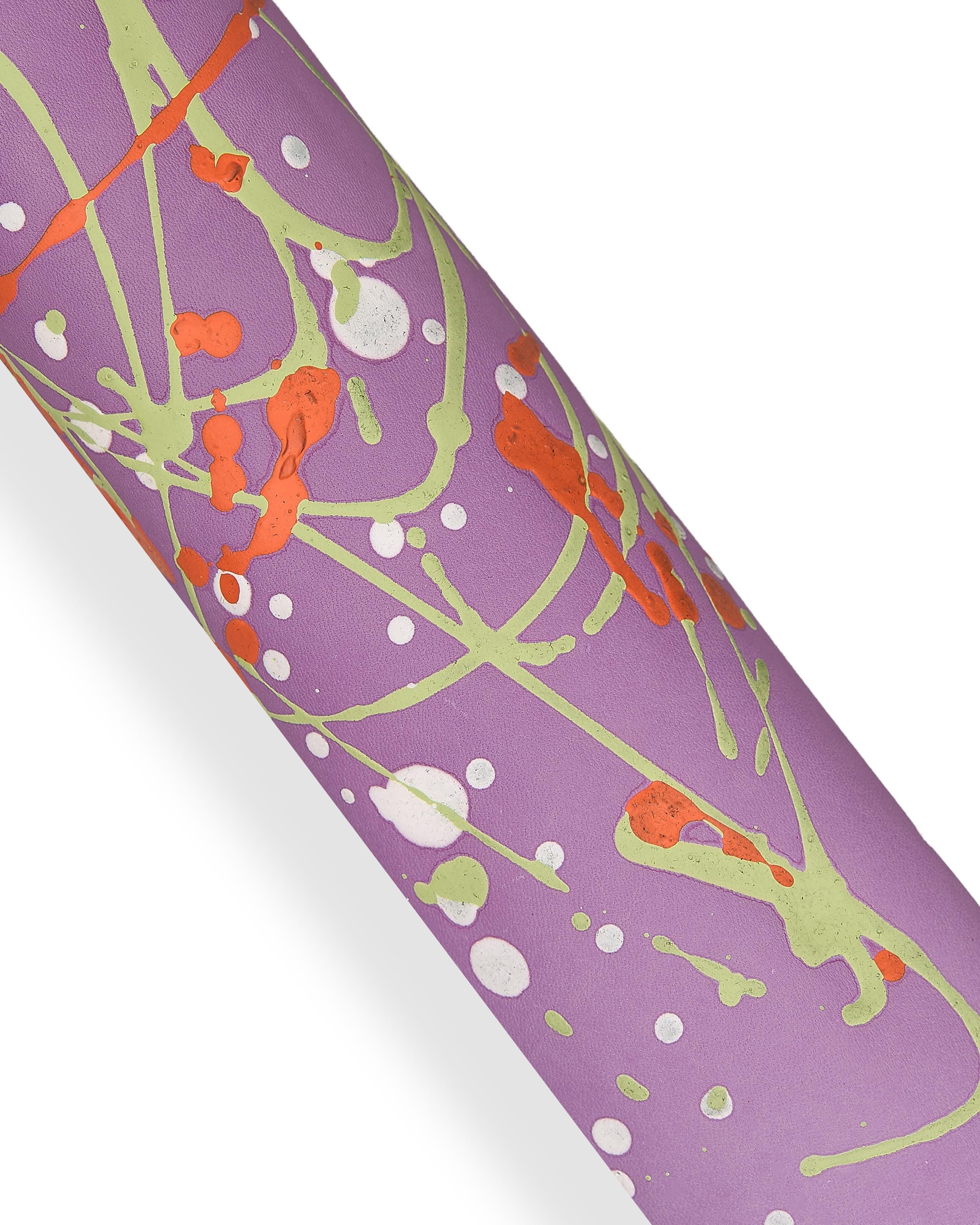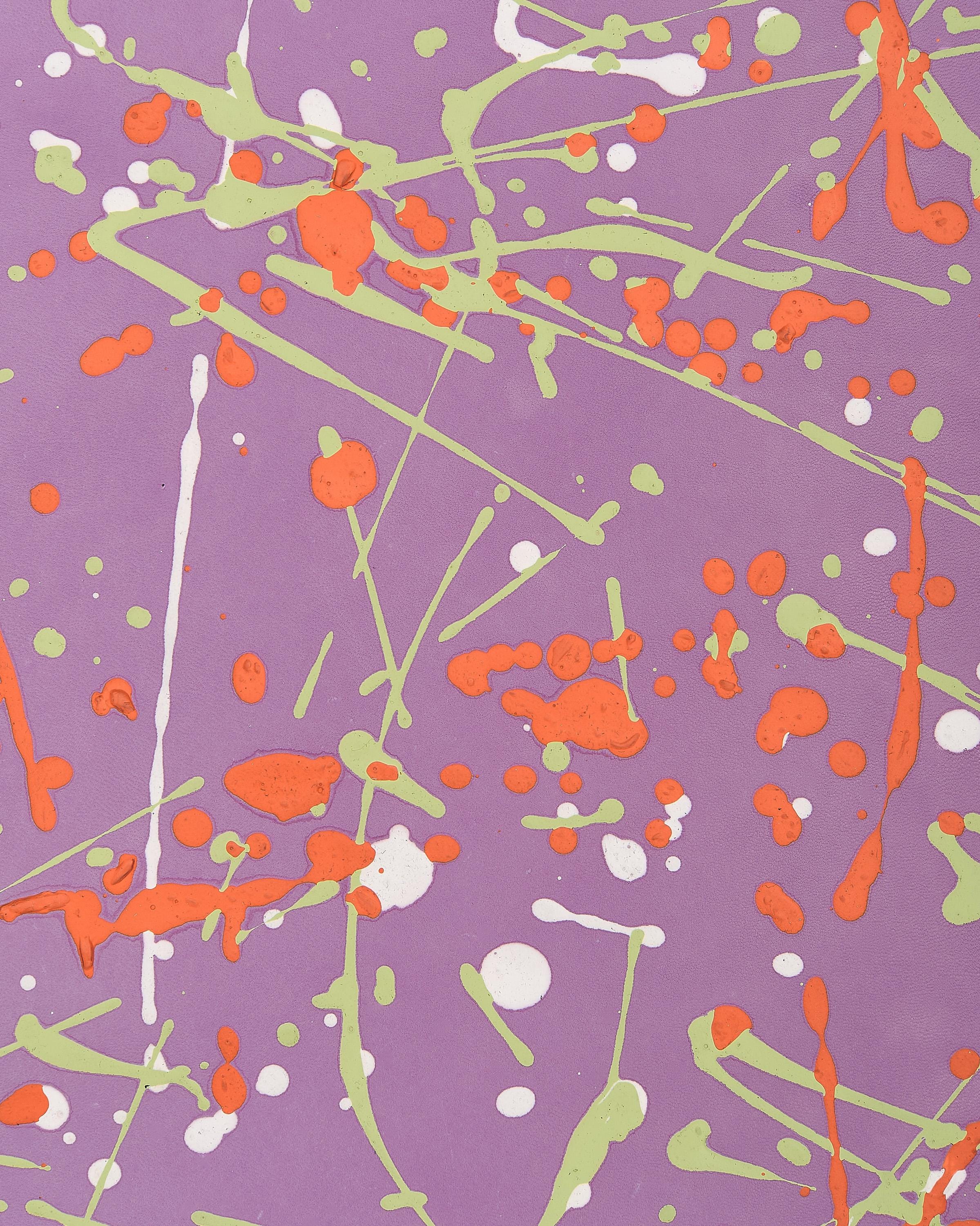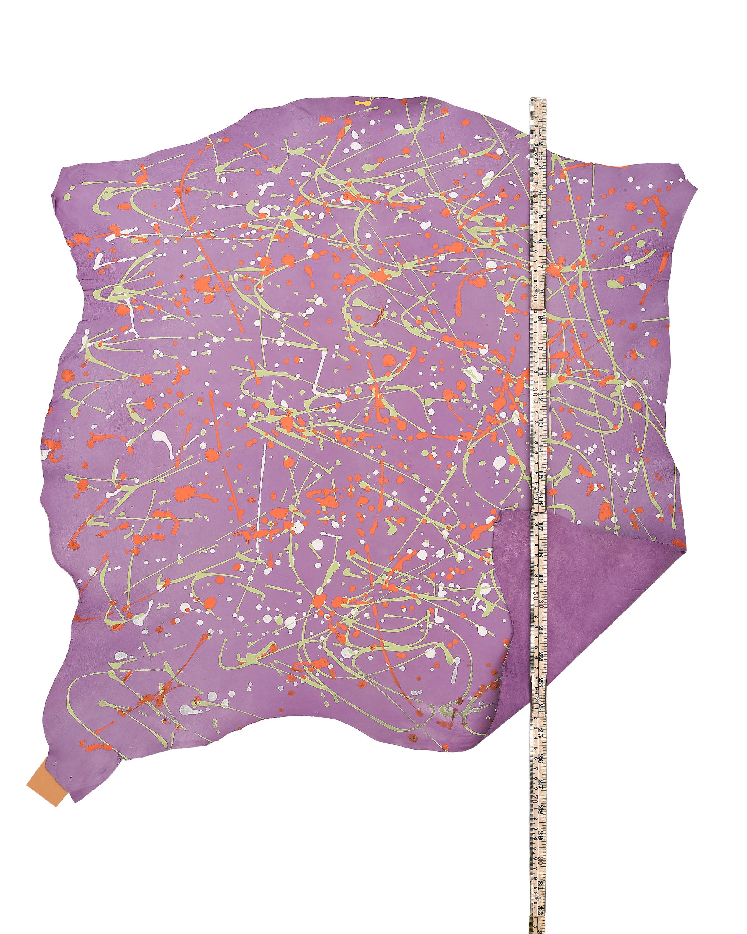 Unique lavender purple sheepskin leather - green, orange, white sketch print - hand decorated lambskin nappa for hobbyists.
