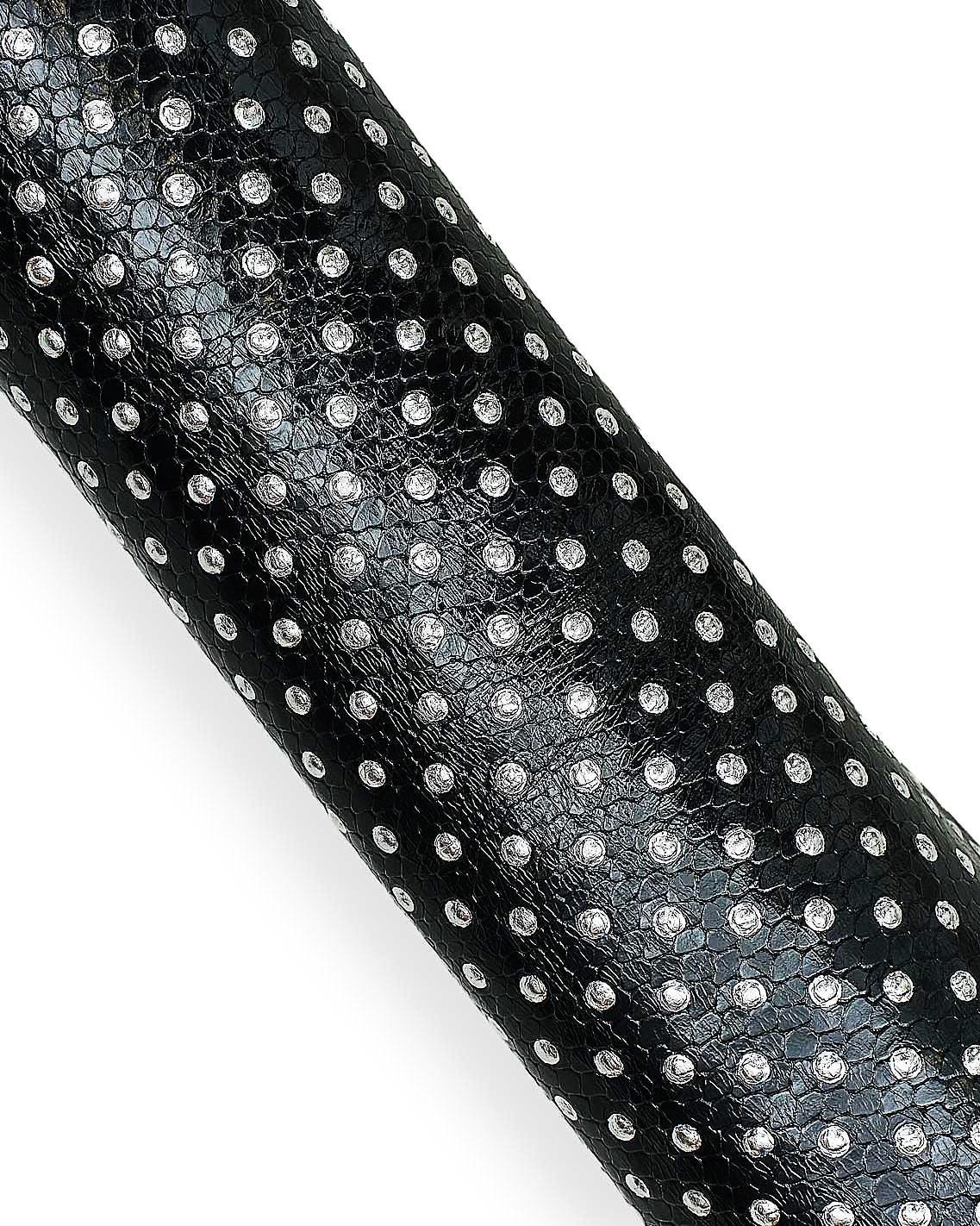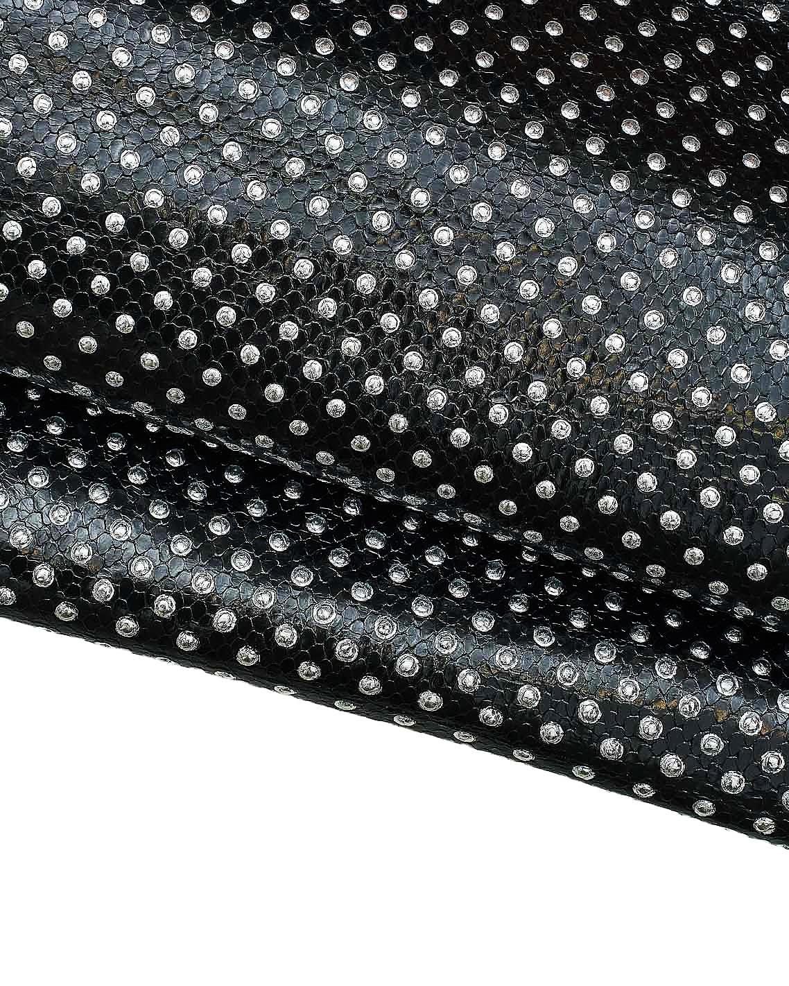 Stunning black glossy reptile printed hide with silver studs, cowhide snake print, soft for crafters.