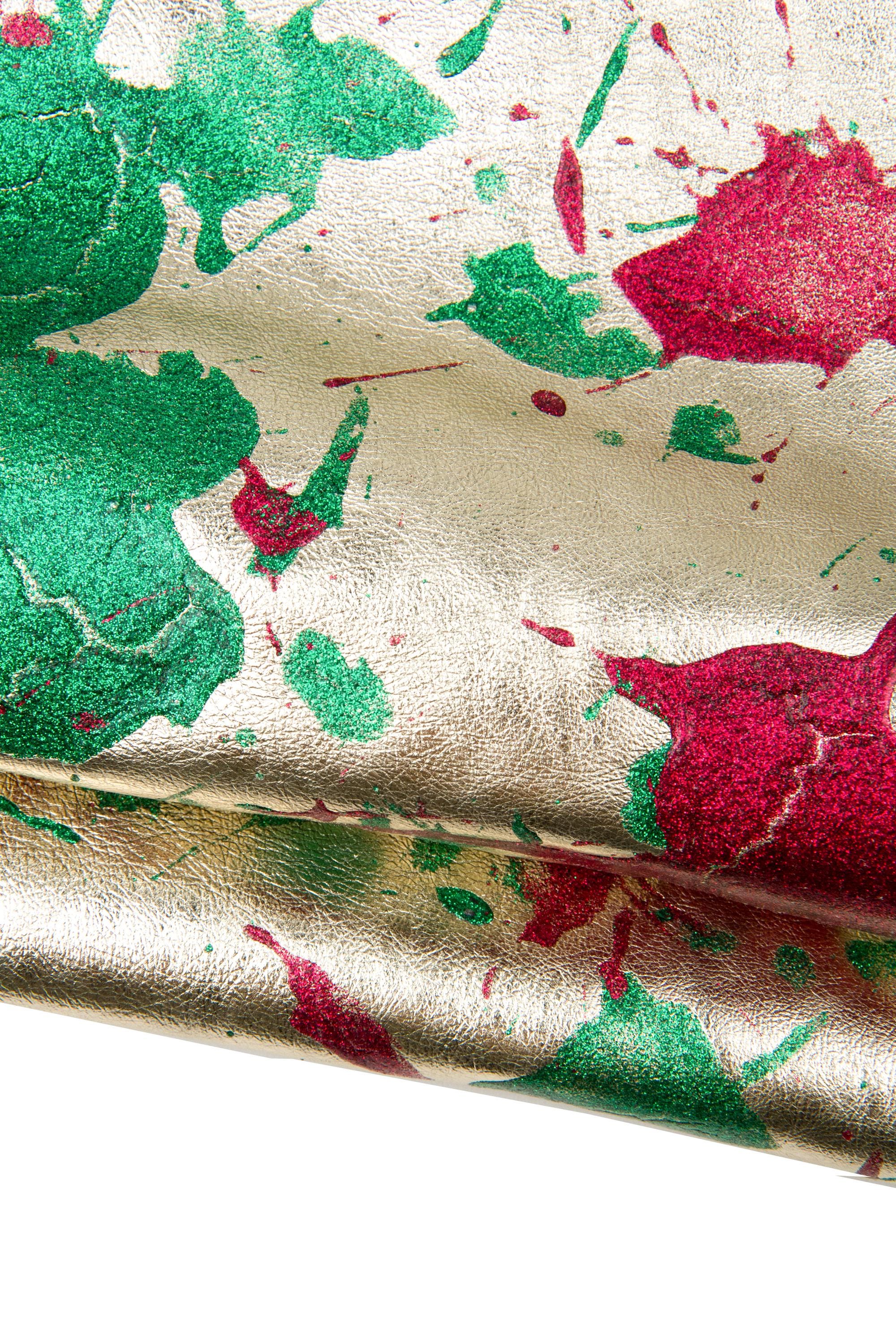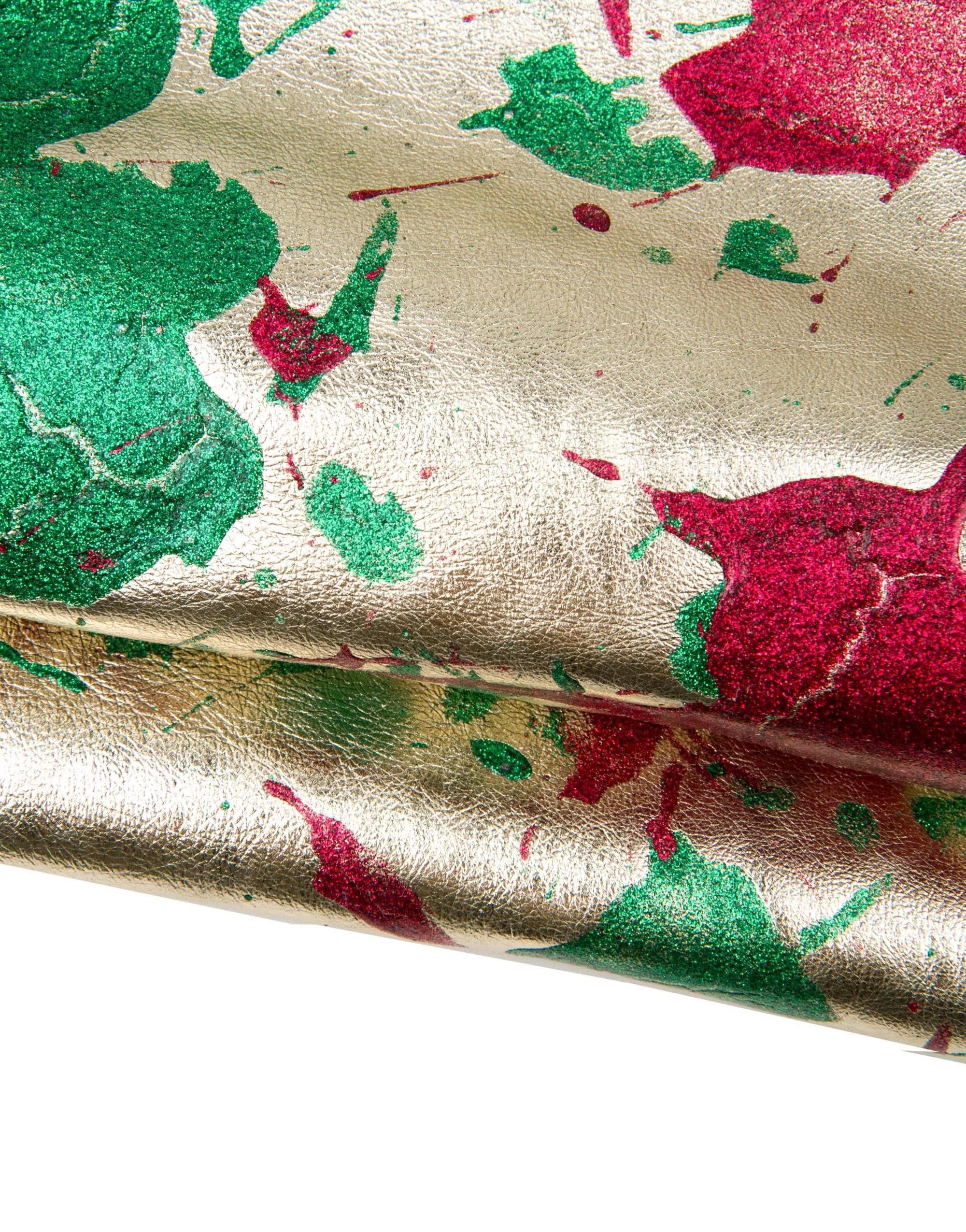 Upcycled luxurious metallic glittered leather skin, light gold goatskin - green / red splash print, soft hide. Perfect for bags, wallets, purses, earrings, necklaces and other handcrafted creations.