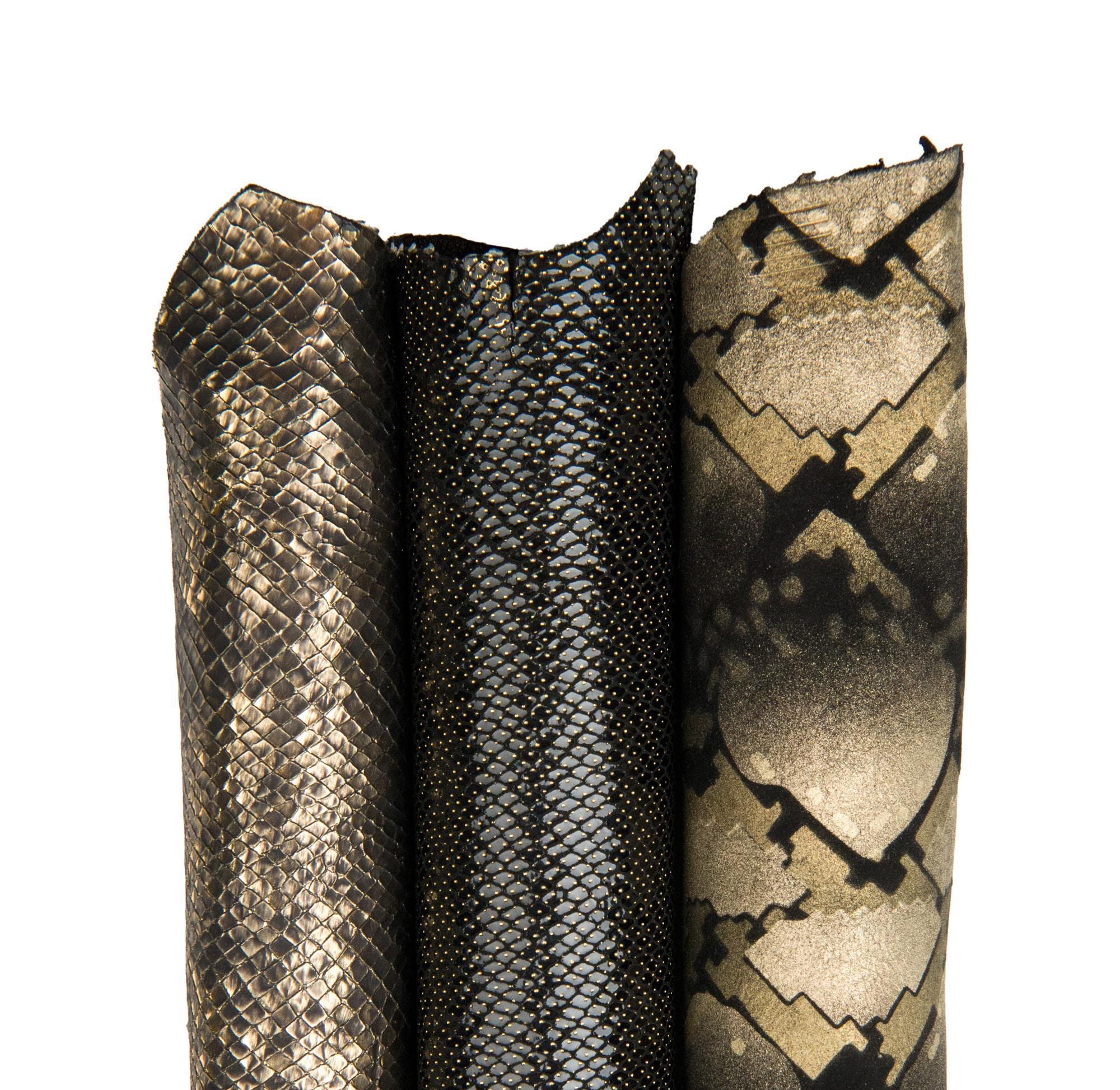 Wonderful set of 3 grey, bronze, steel metallic leather skins, reptile python textured printed goatskin hides, as per picture.