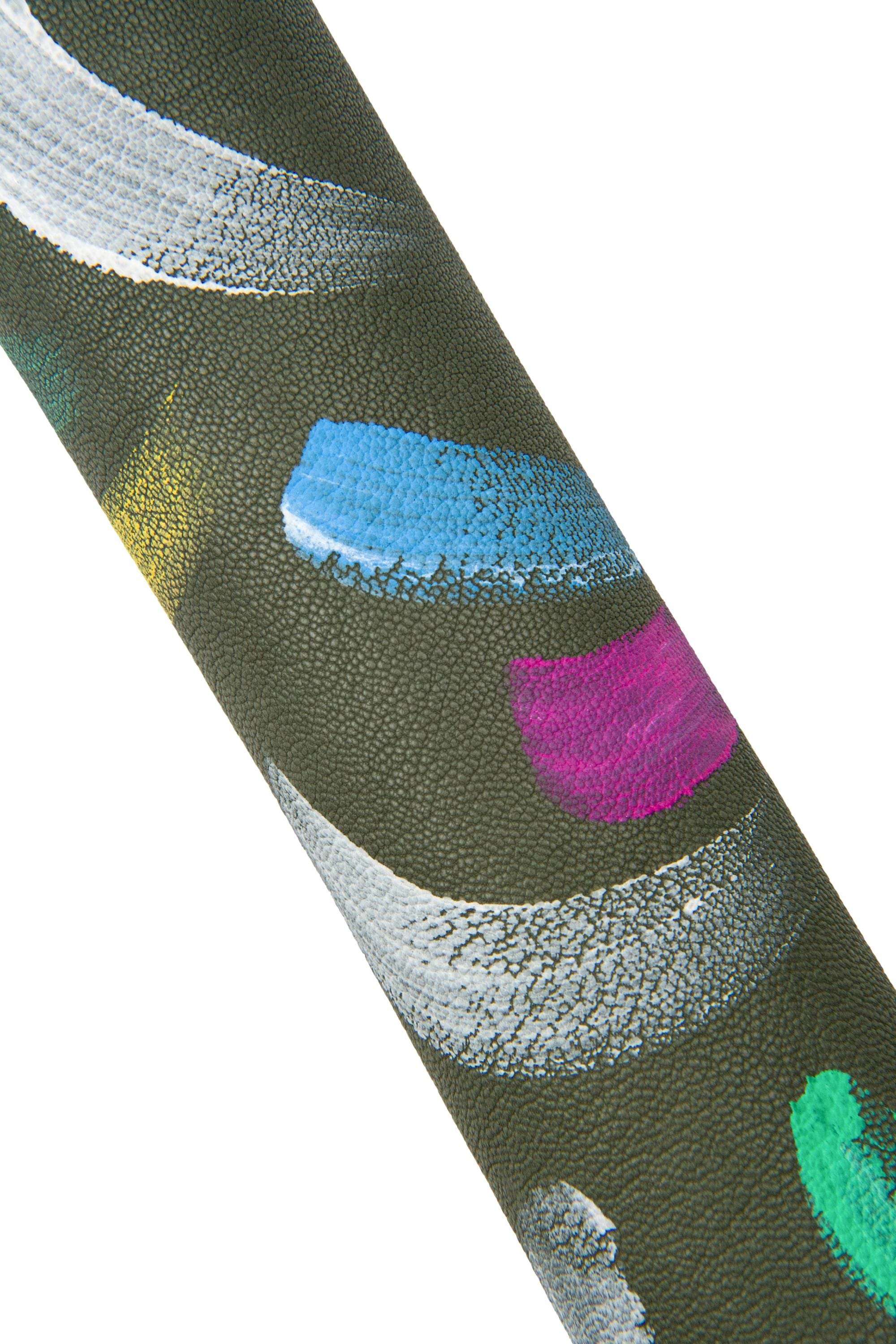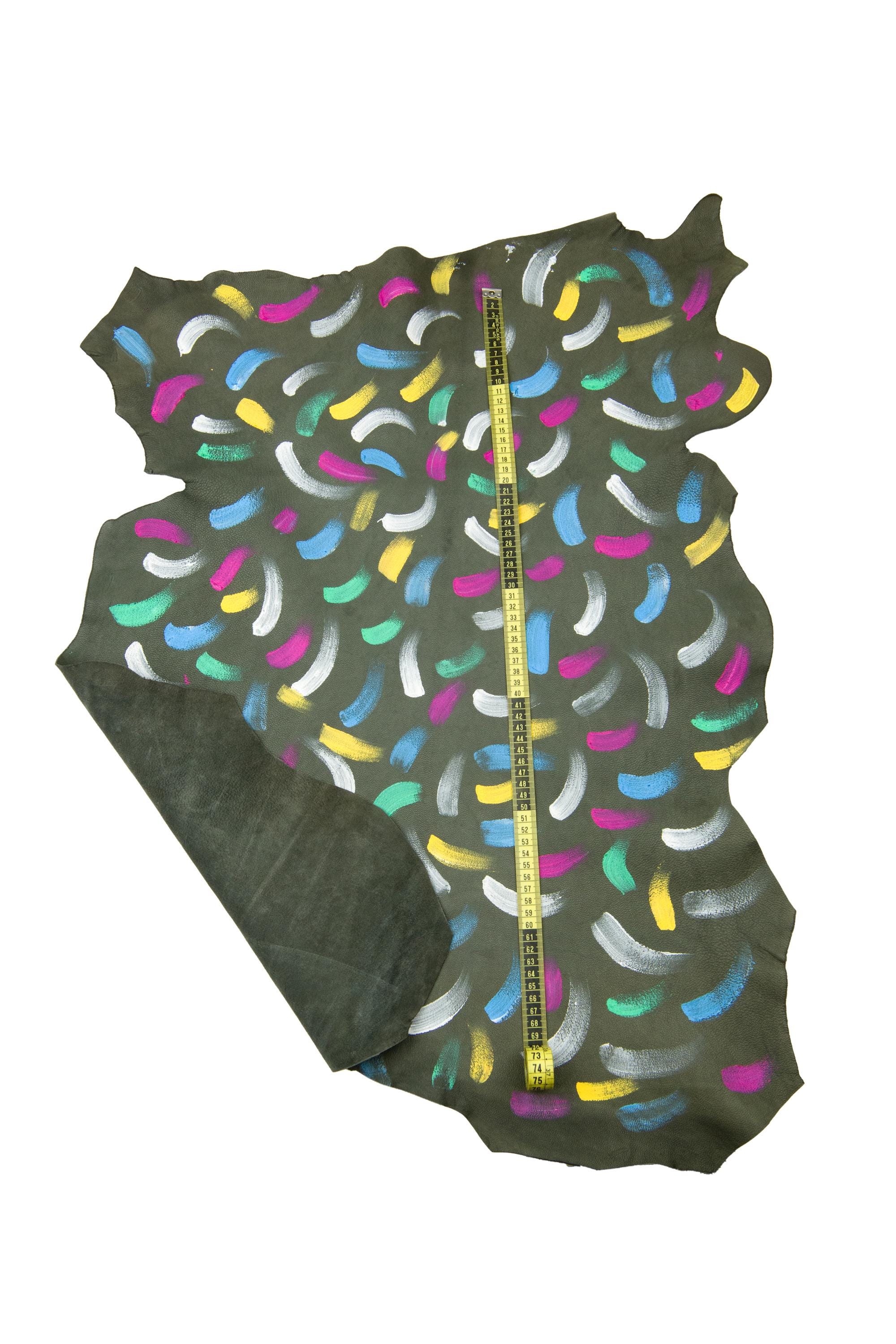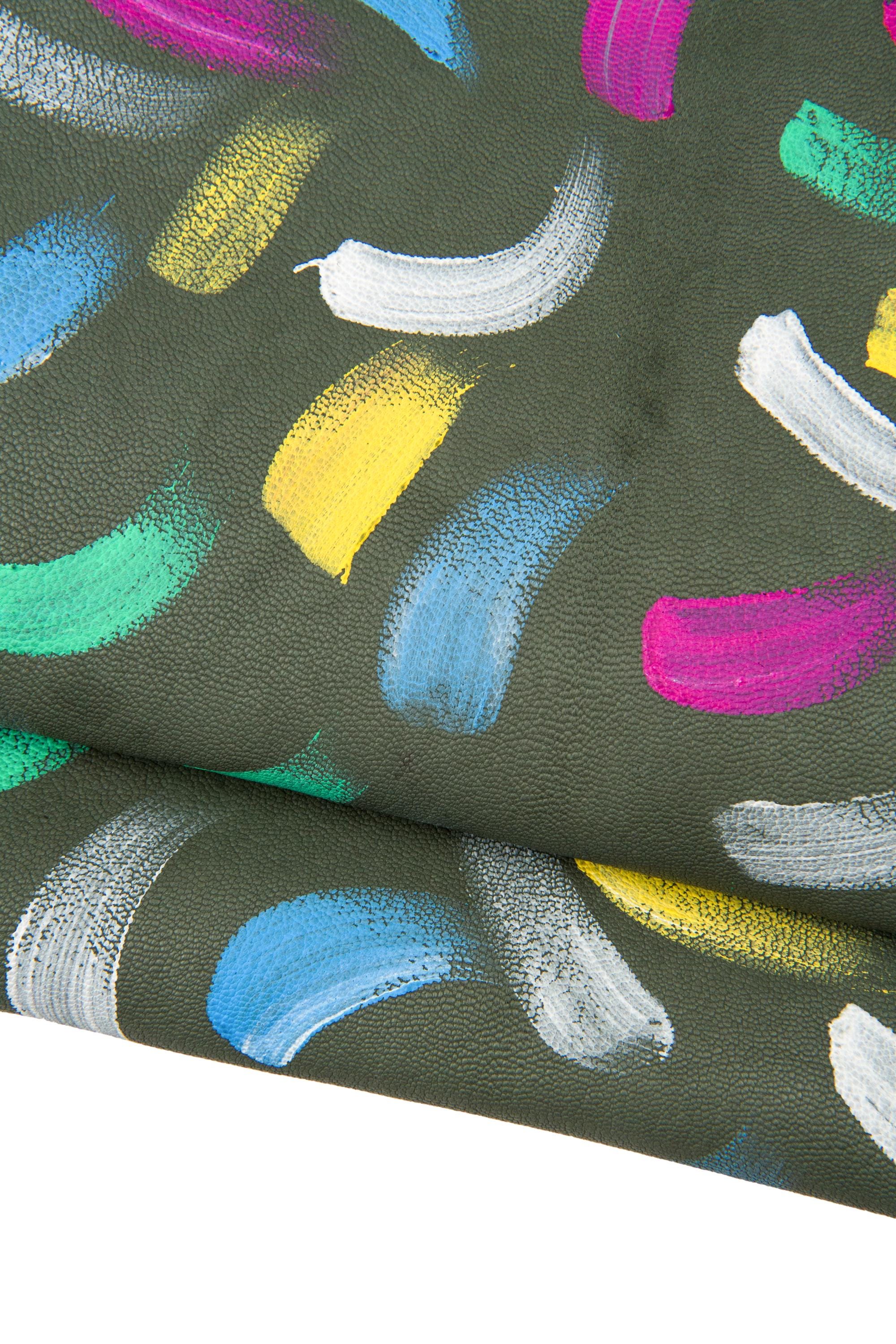 Original multicolor hand-painted leather skin, greyish green tiny pebble grain printed soft goastskin - colorful print. Ideal for DYI projects.