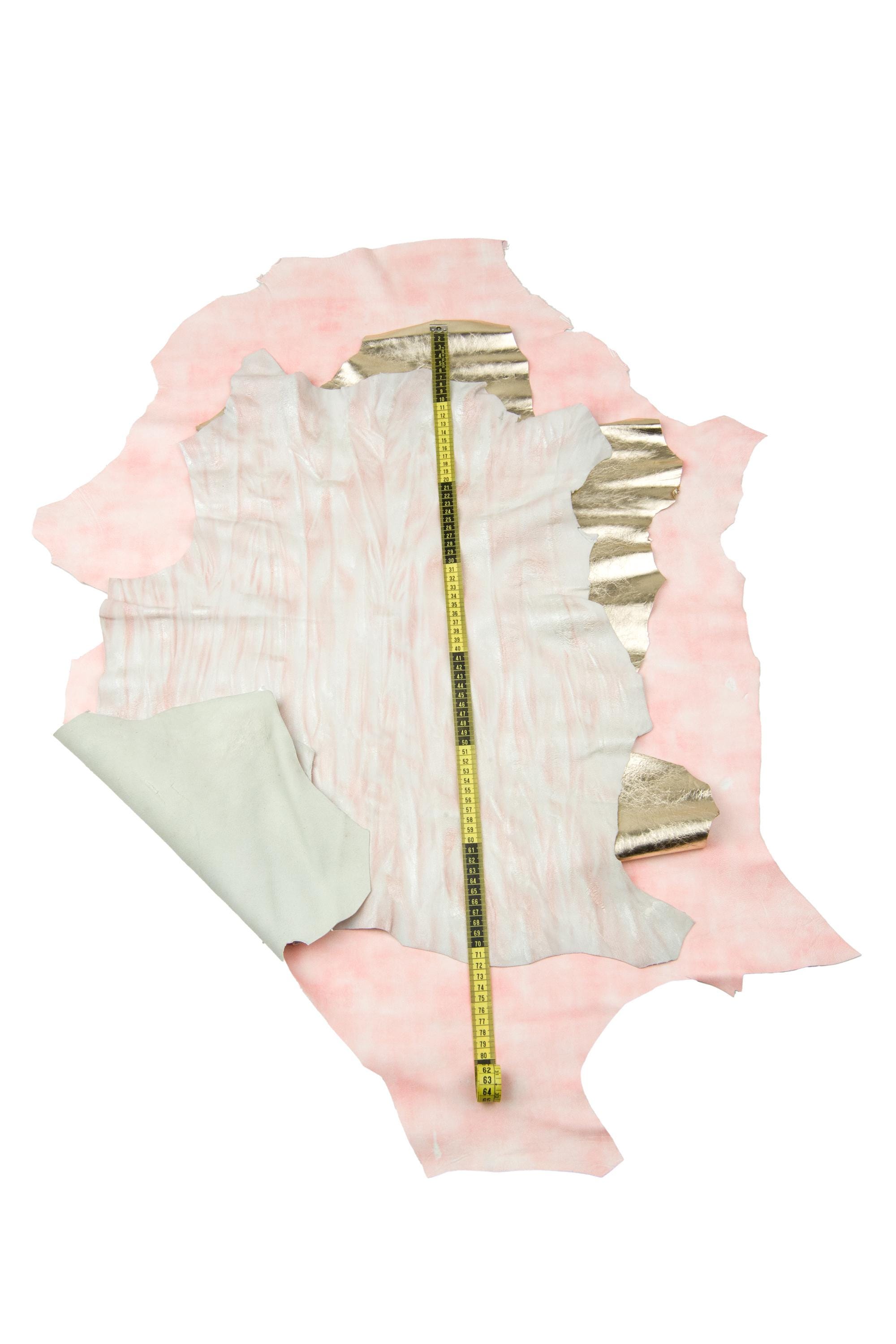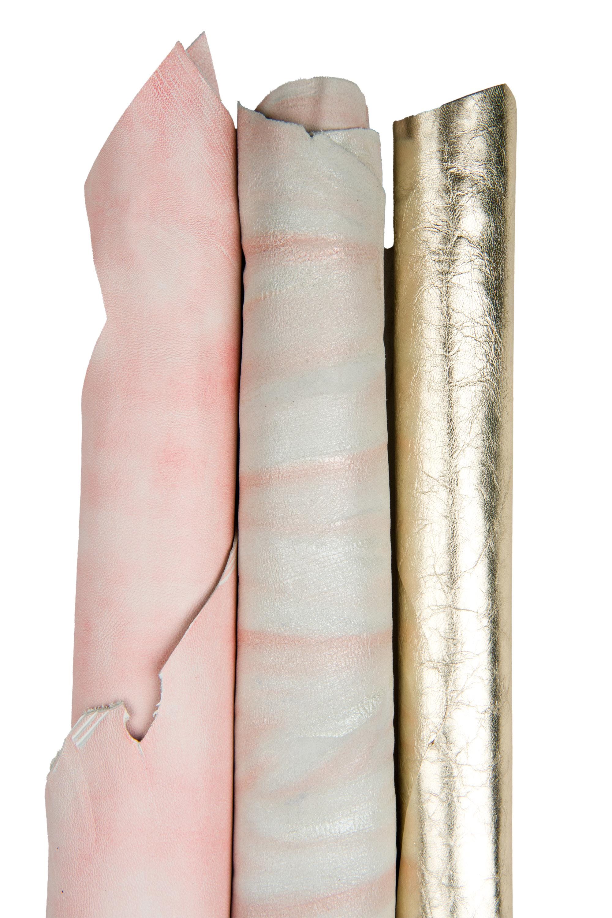 Incredible bundle of 3 pink, light gold soft goatskins, assortment of metallic textured matching leather skins for crafters, as per picture.