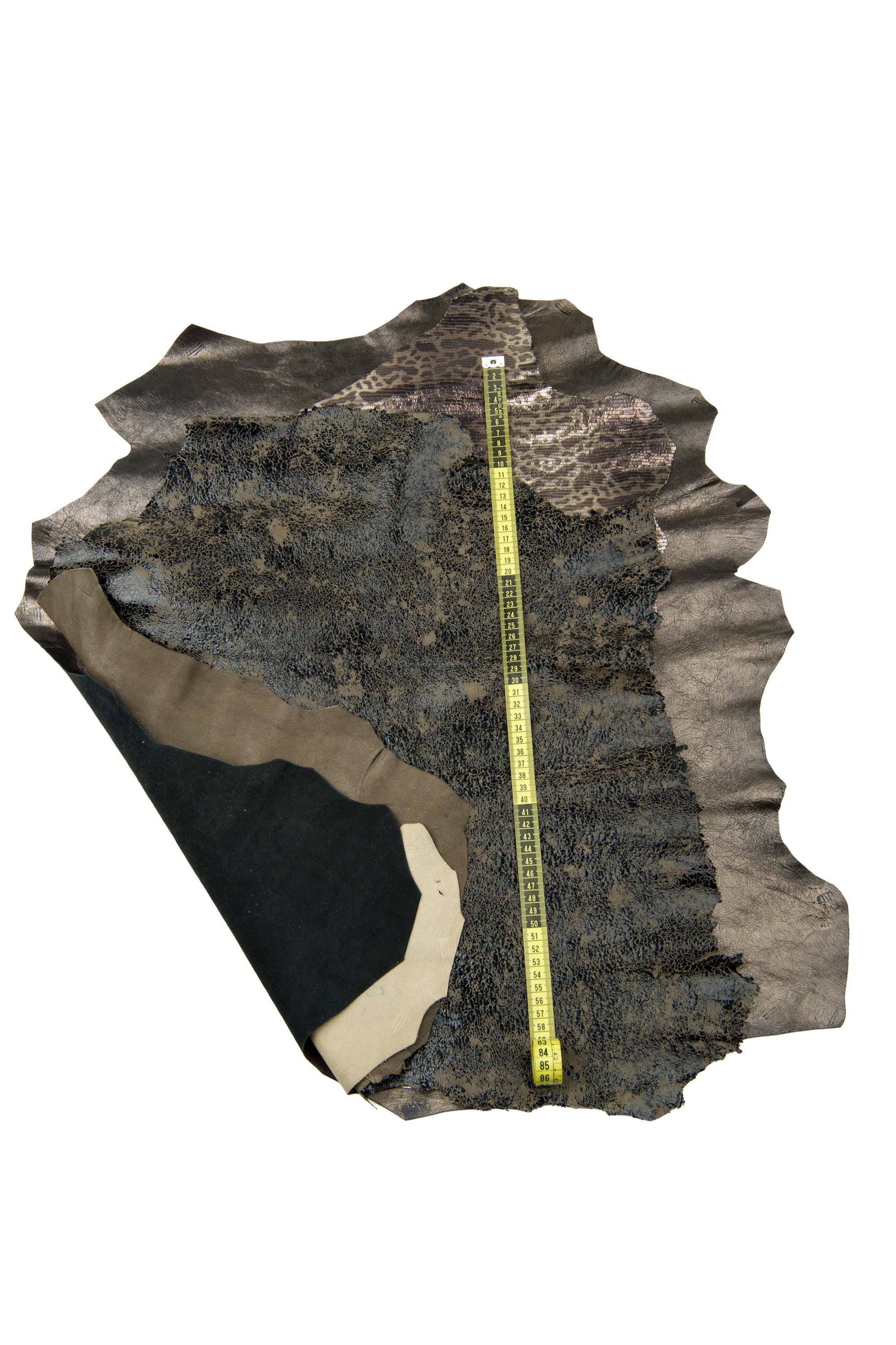 Wonderful set of 3 grey, steelmetal leather skins, assortment of metallic printed textured goatskins as per picture.