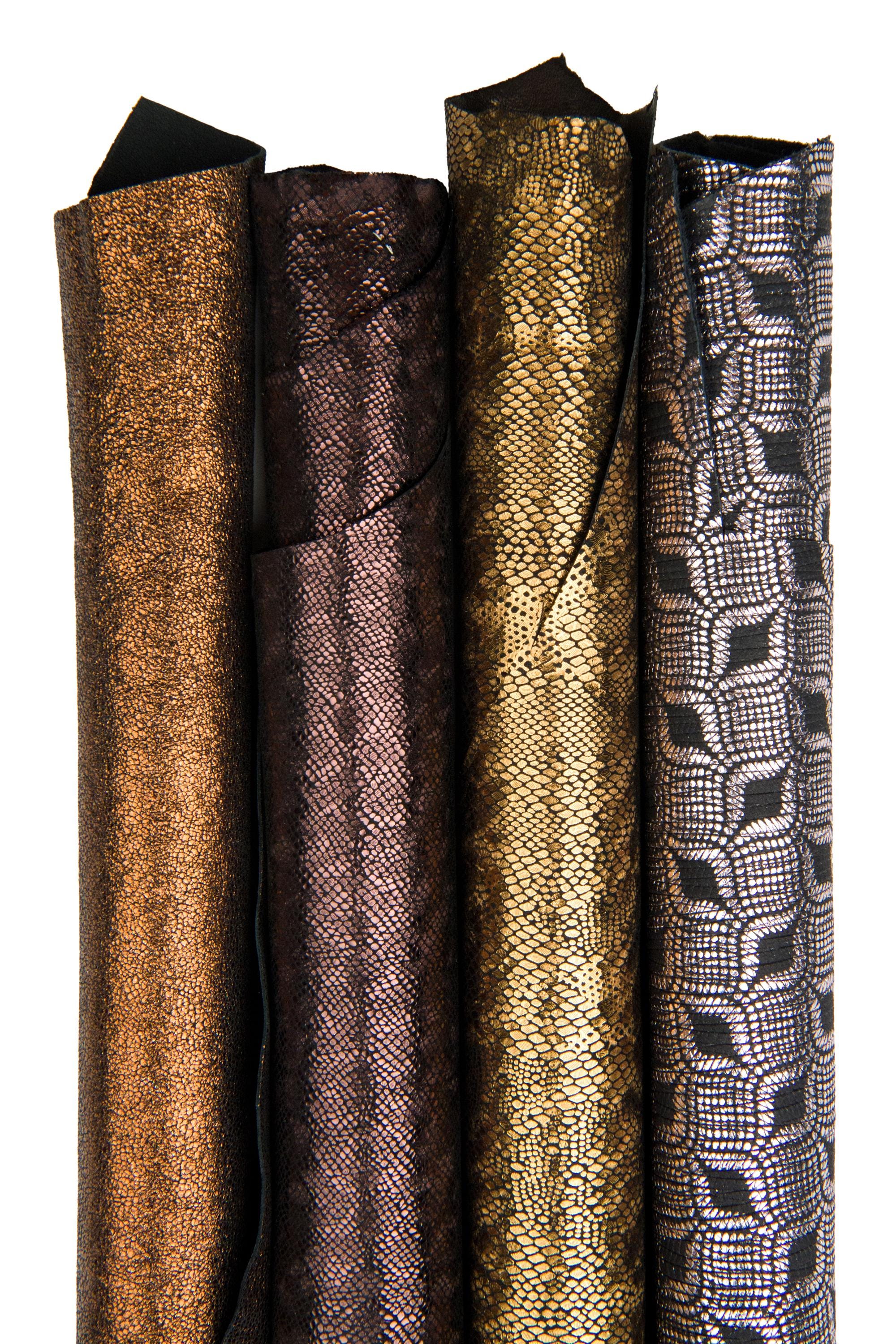 Wonderful bundle of 4 metallic leather skins as per picture, sparkle bright soft goatskins in various textures, ideal for crafters.