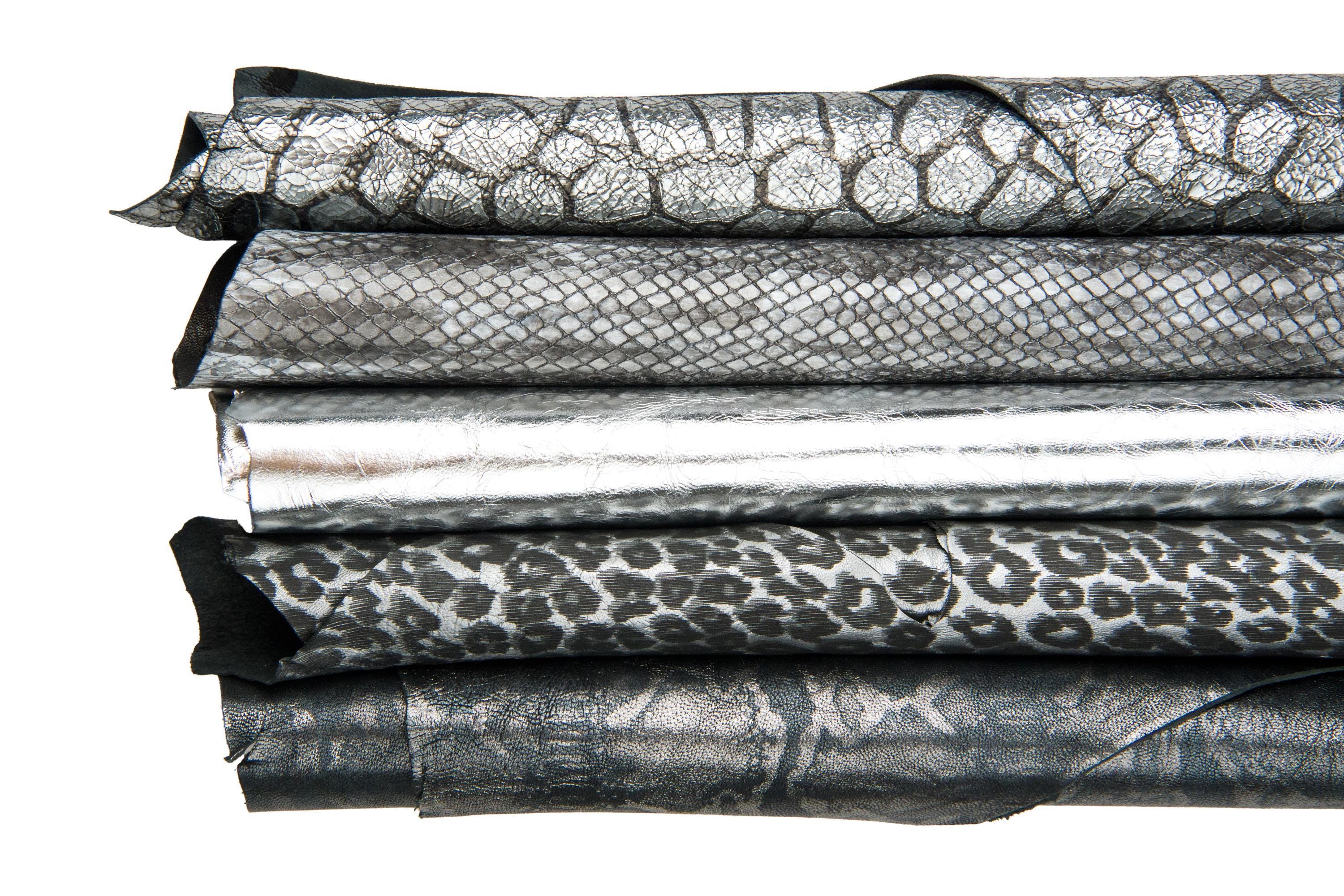 Incredible set of 5 steelmetal, silver leather skins, assortment of metallic wrinkled animal printed goatskins, as per picture.