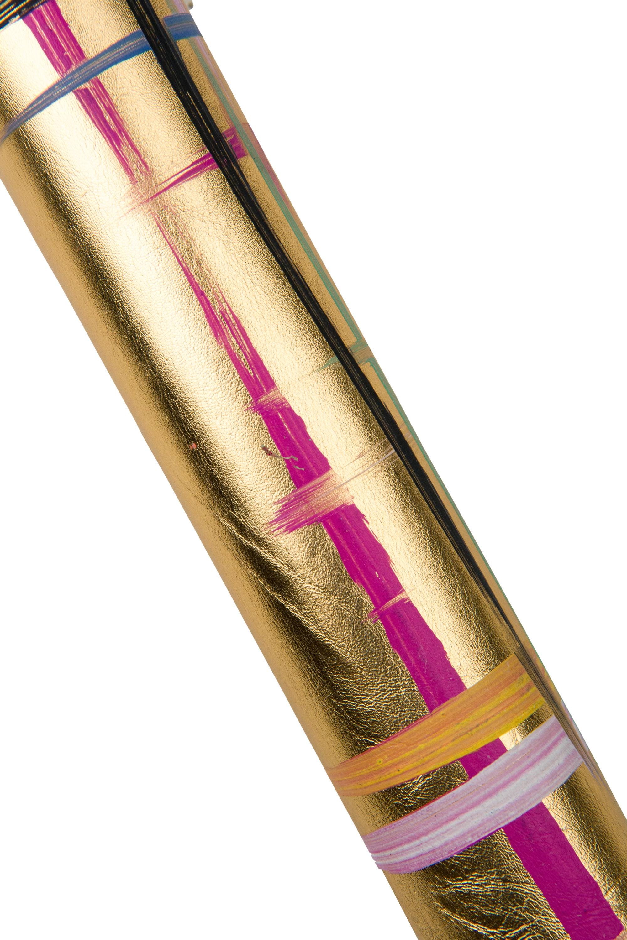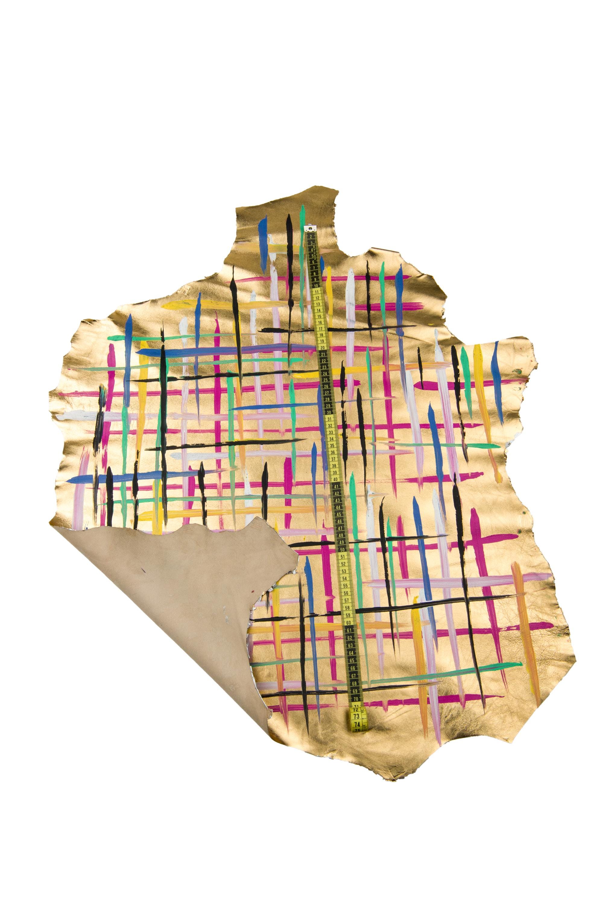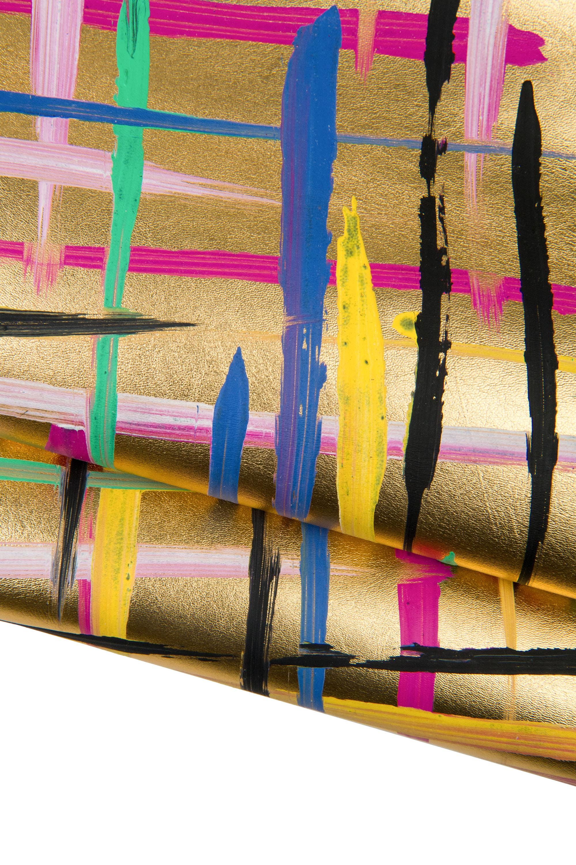 Wonderful multicolor texture on gold leather skin, metallic sheepskin with colorful print, luxurious lambskin for diy projects.