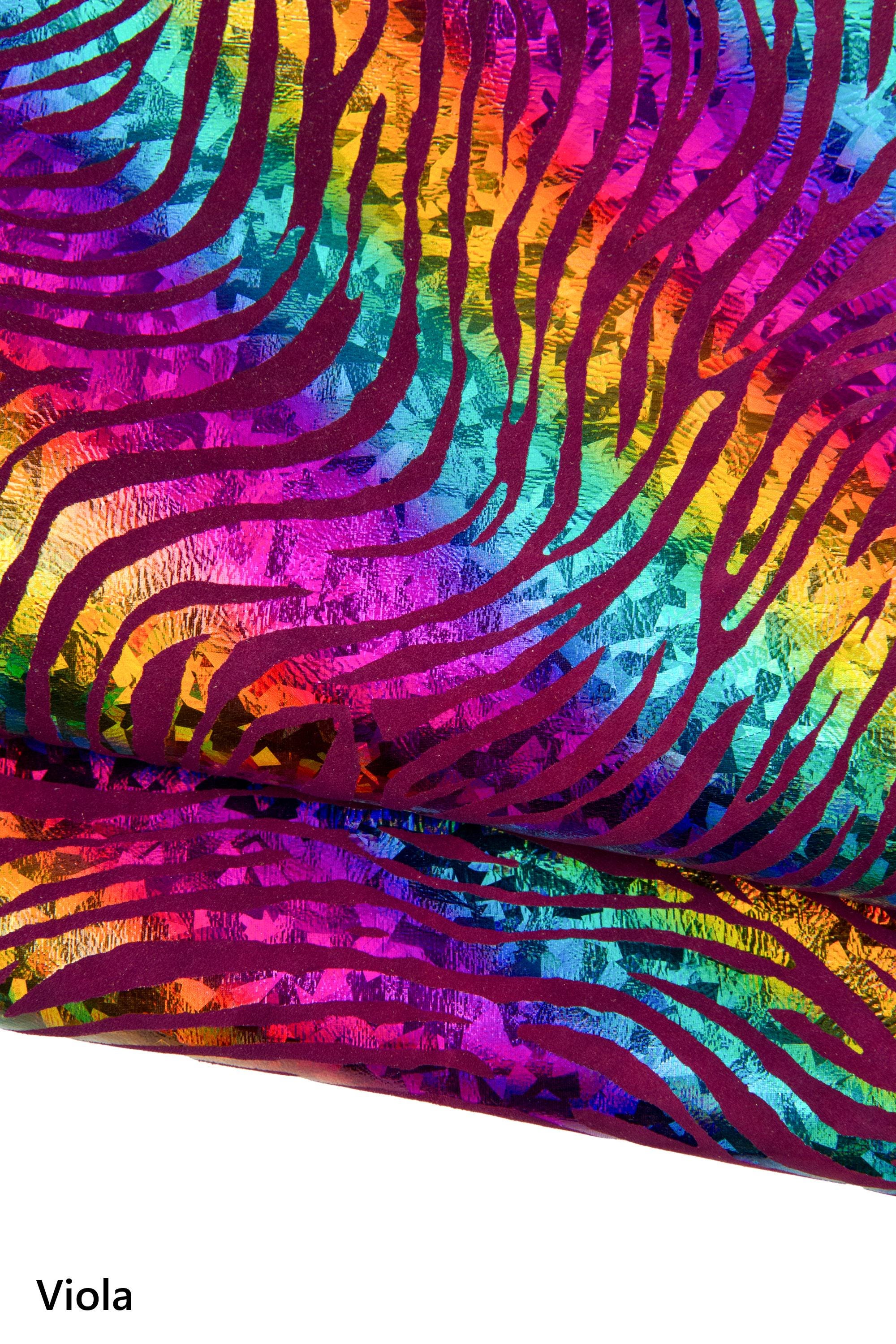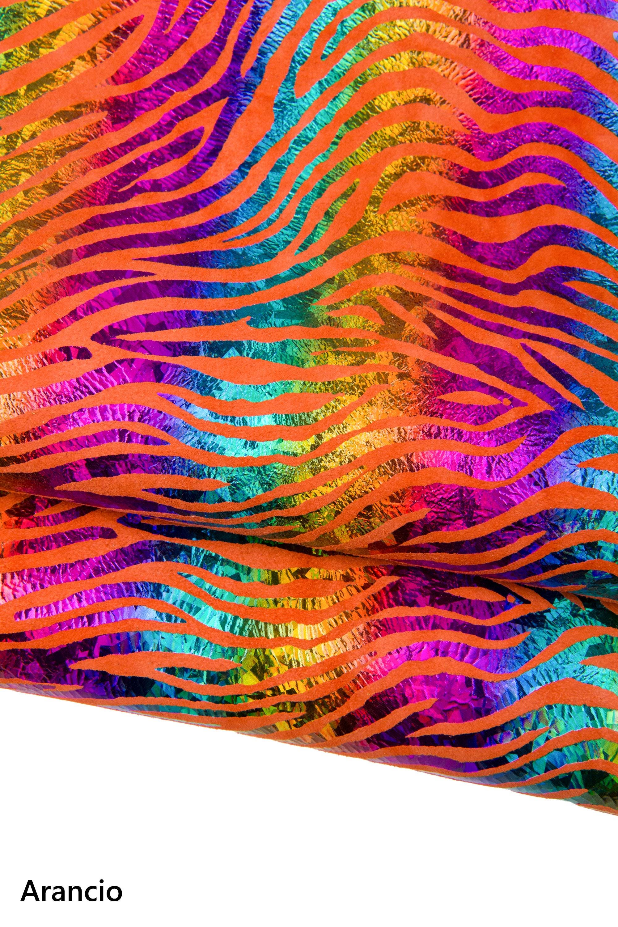 Stunning multicolor zebra textured leather skin, iridescent holographic goatskin, colorful animal printed suede skin, for hobbyists. Available in 3 base colors: arancio, verde, viola