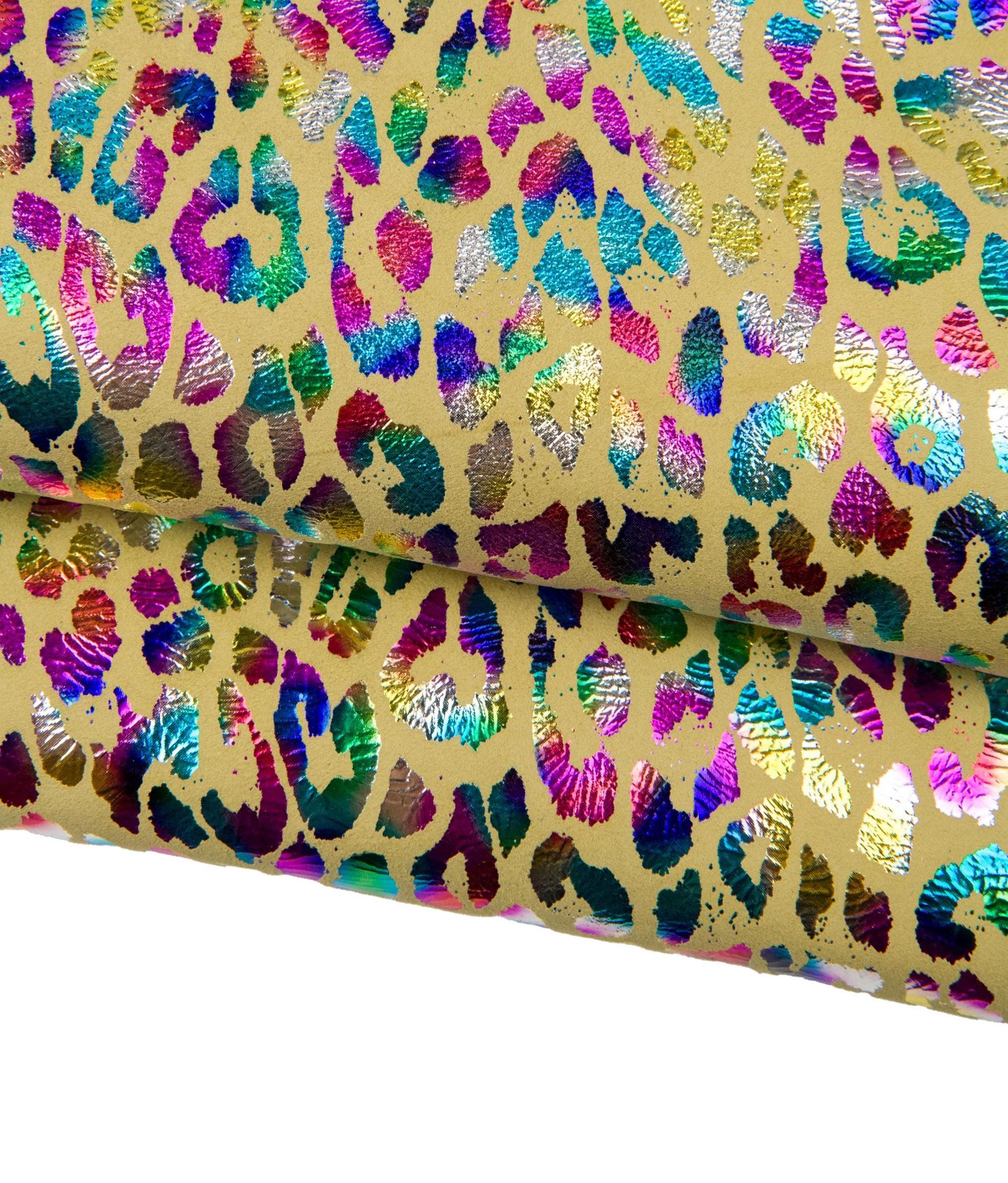 Outstanding multicolor leopard printed leather skin, pale yellow suede goatskin with cheetah texture, soft eccentric material.