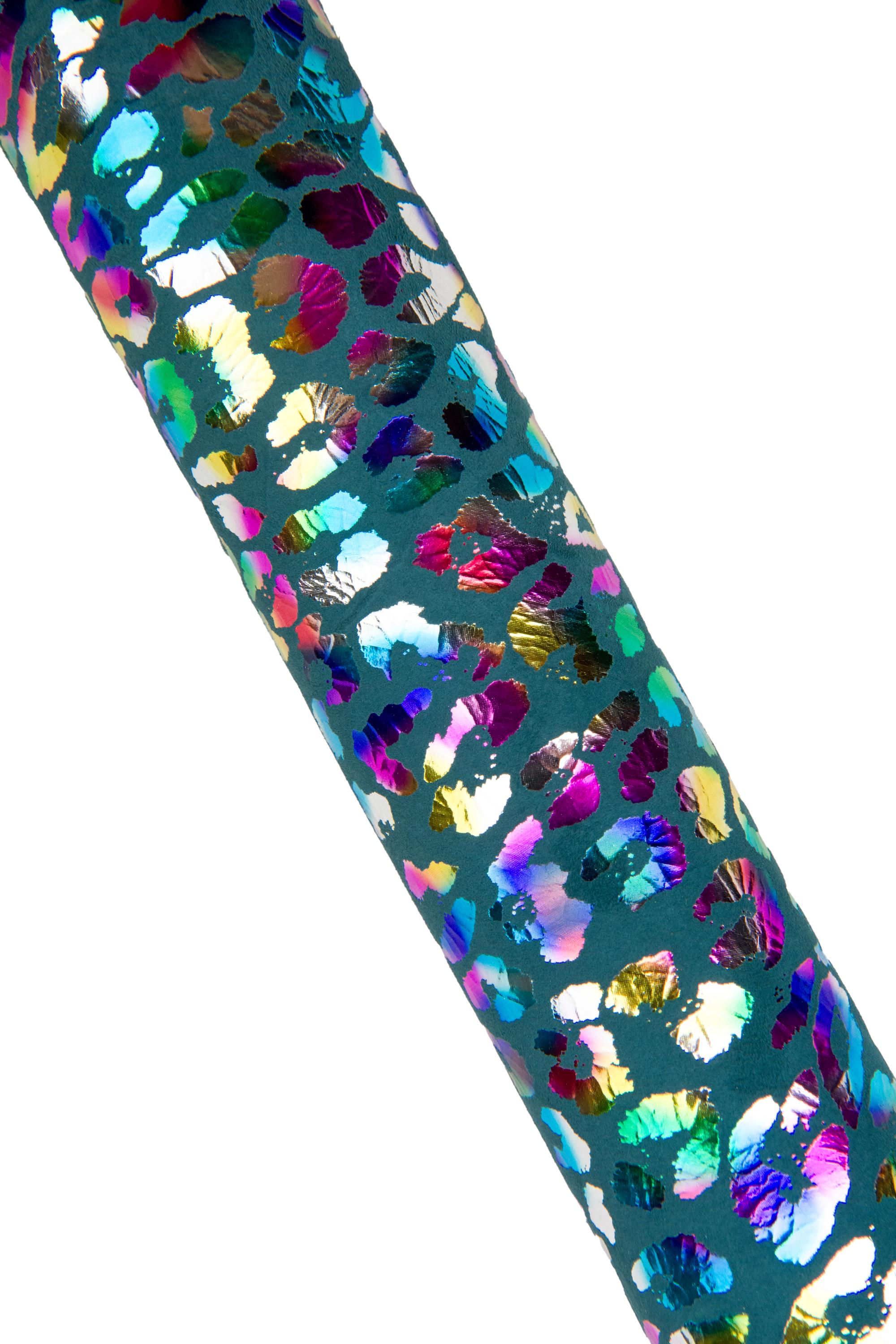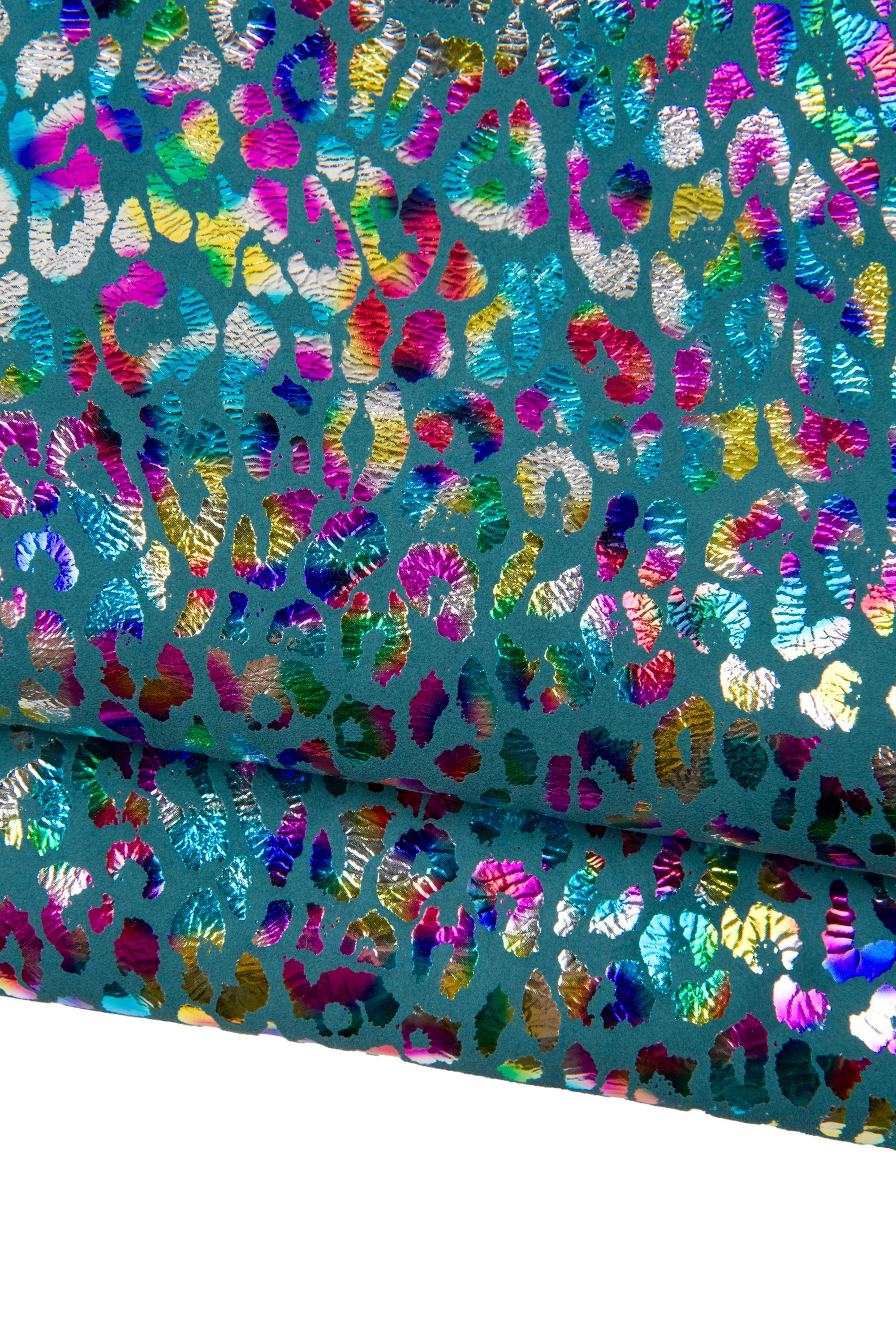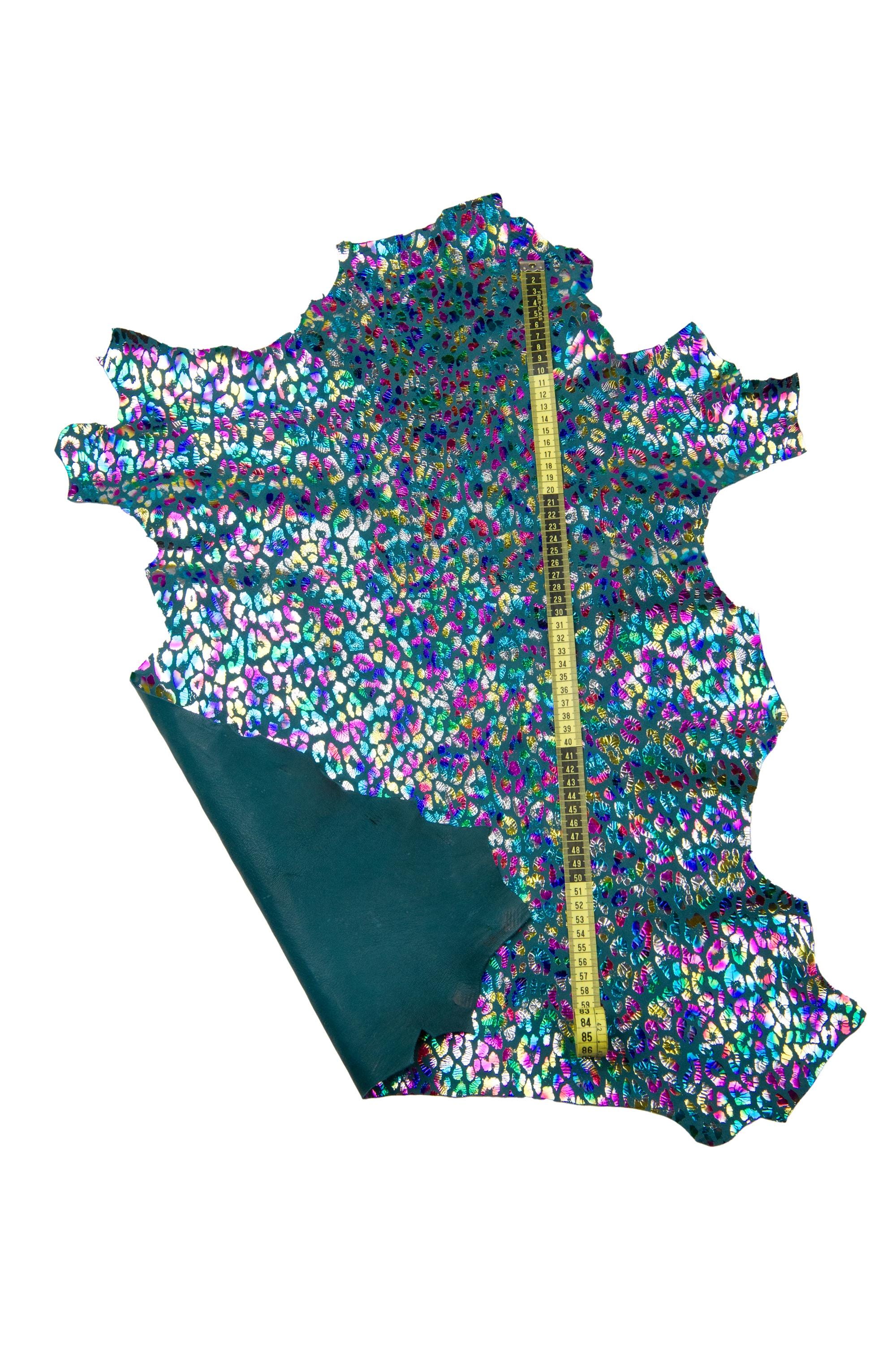 Incredible holographic metallic cheetah textured suede goatskin, multicolor leopard print on petroleum green leather skin, soft bright material ideal for crafters and hobbyists.