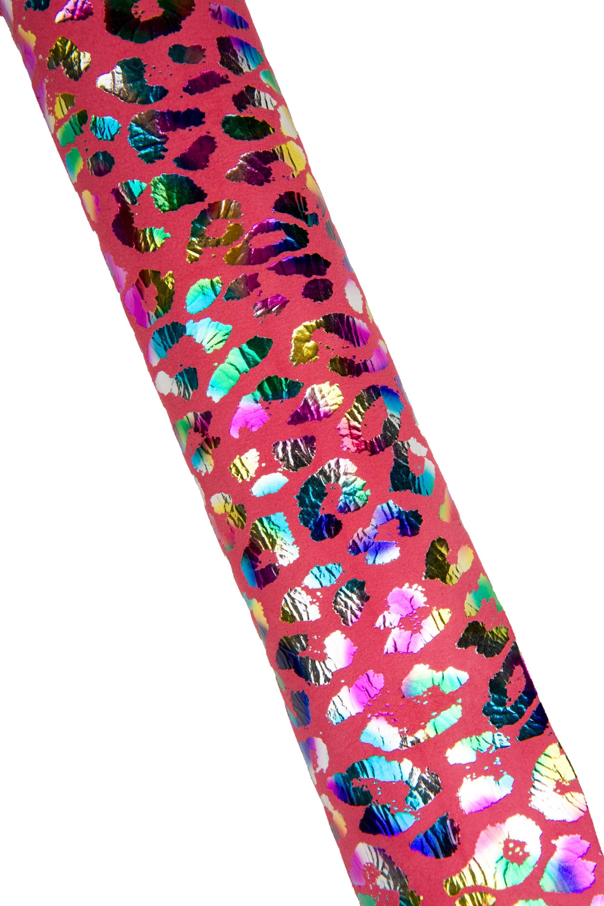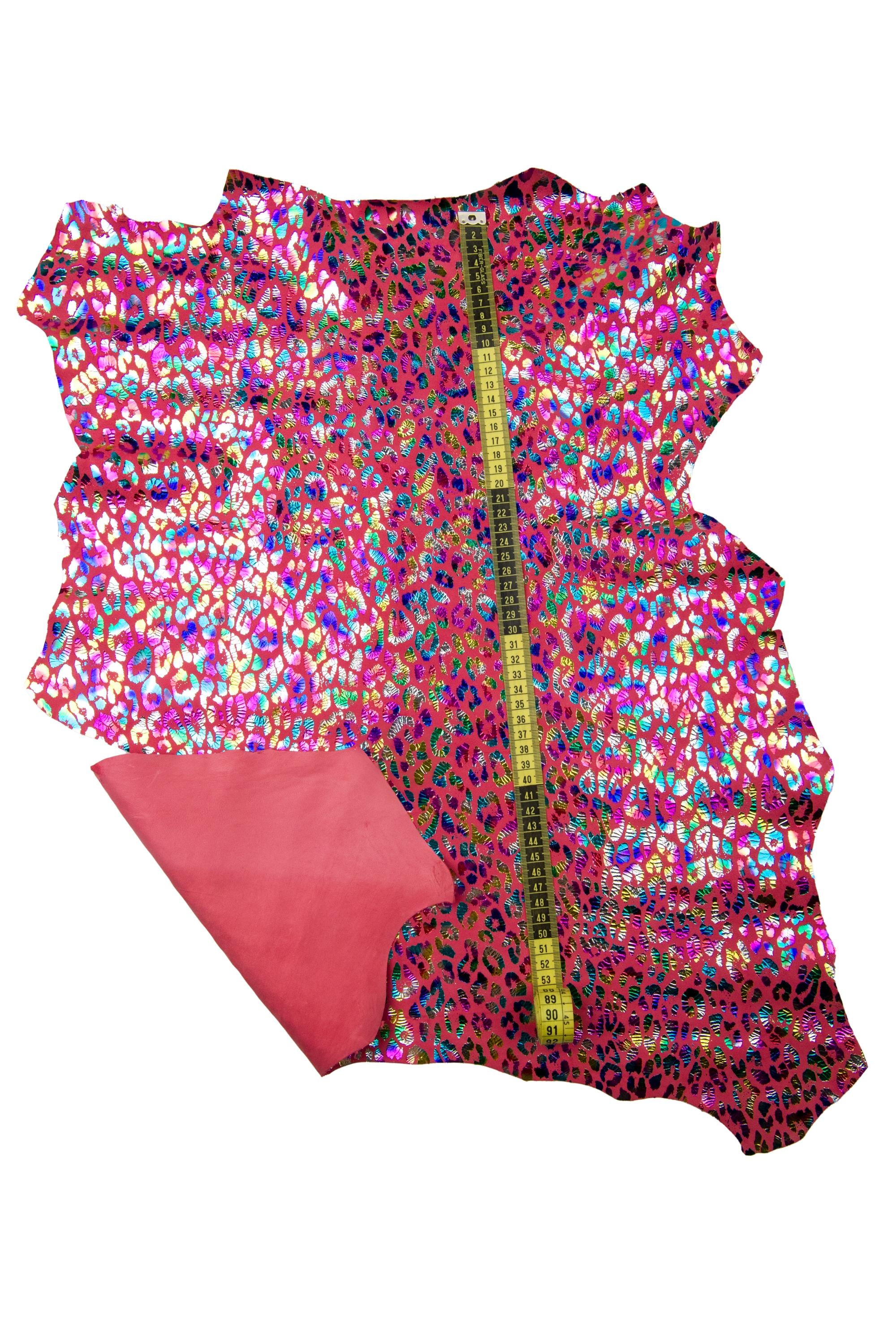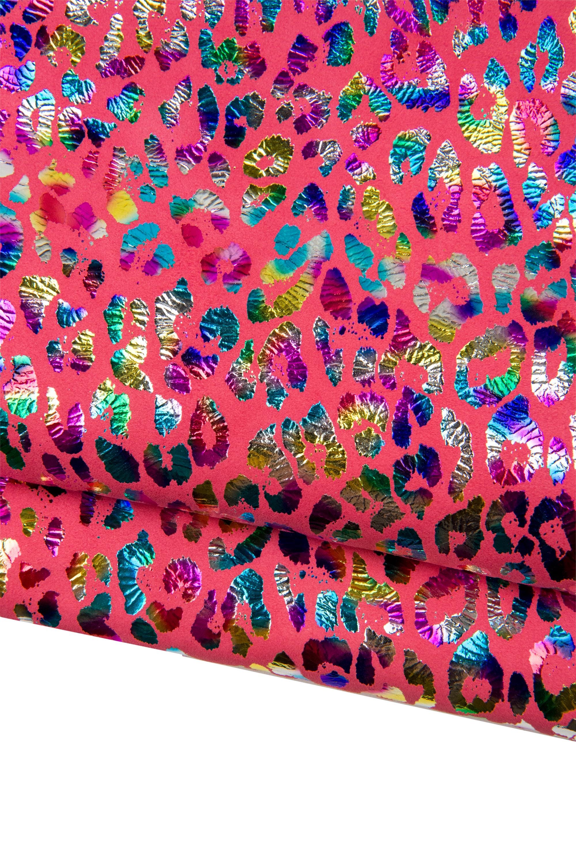 Incredible cheetah textured suede goatskin, multicolor leopard print on pink fuchsia leather skin, soft bright material for crafting.