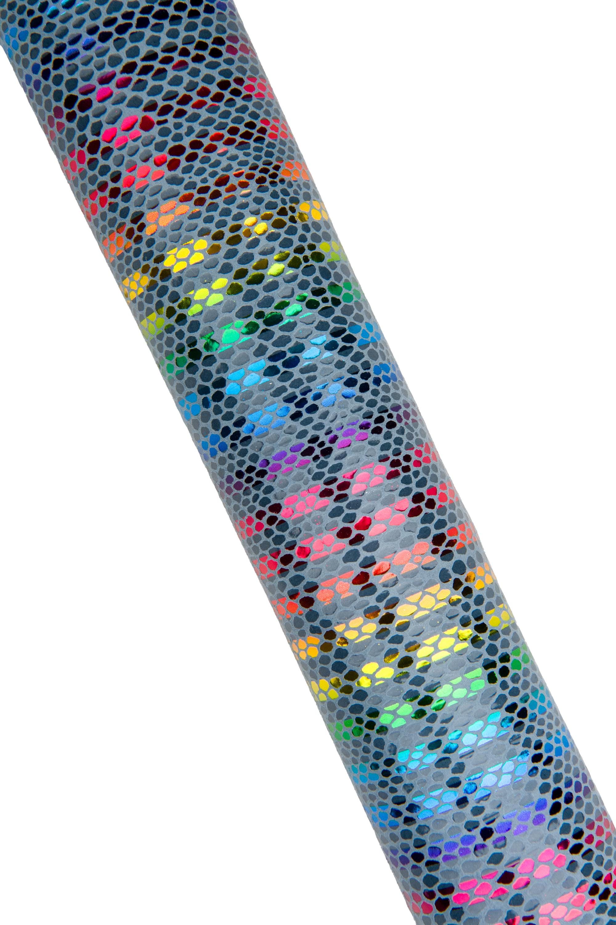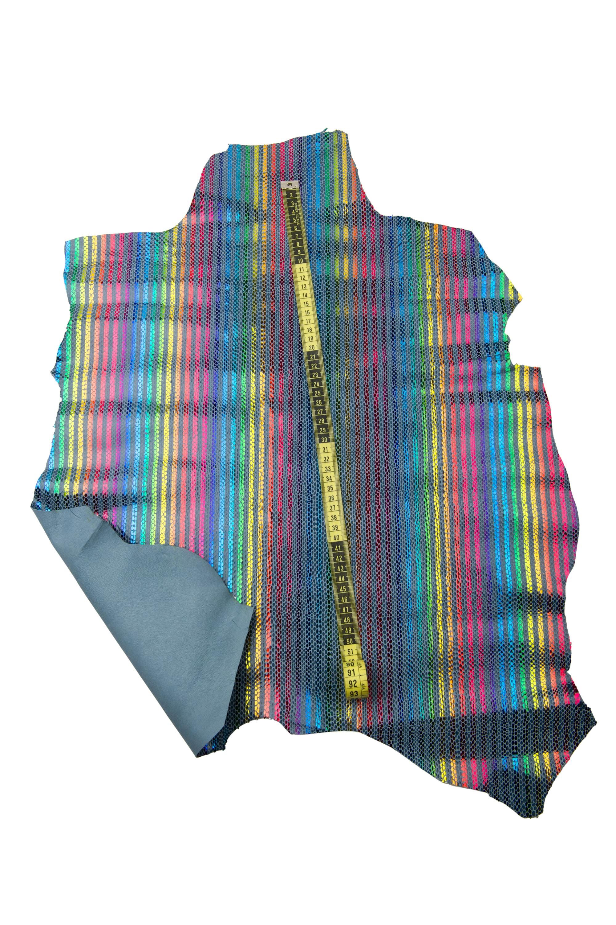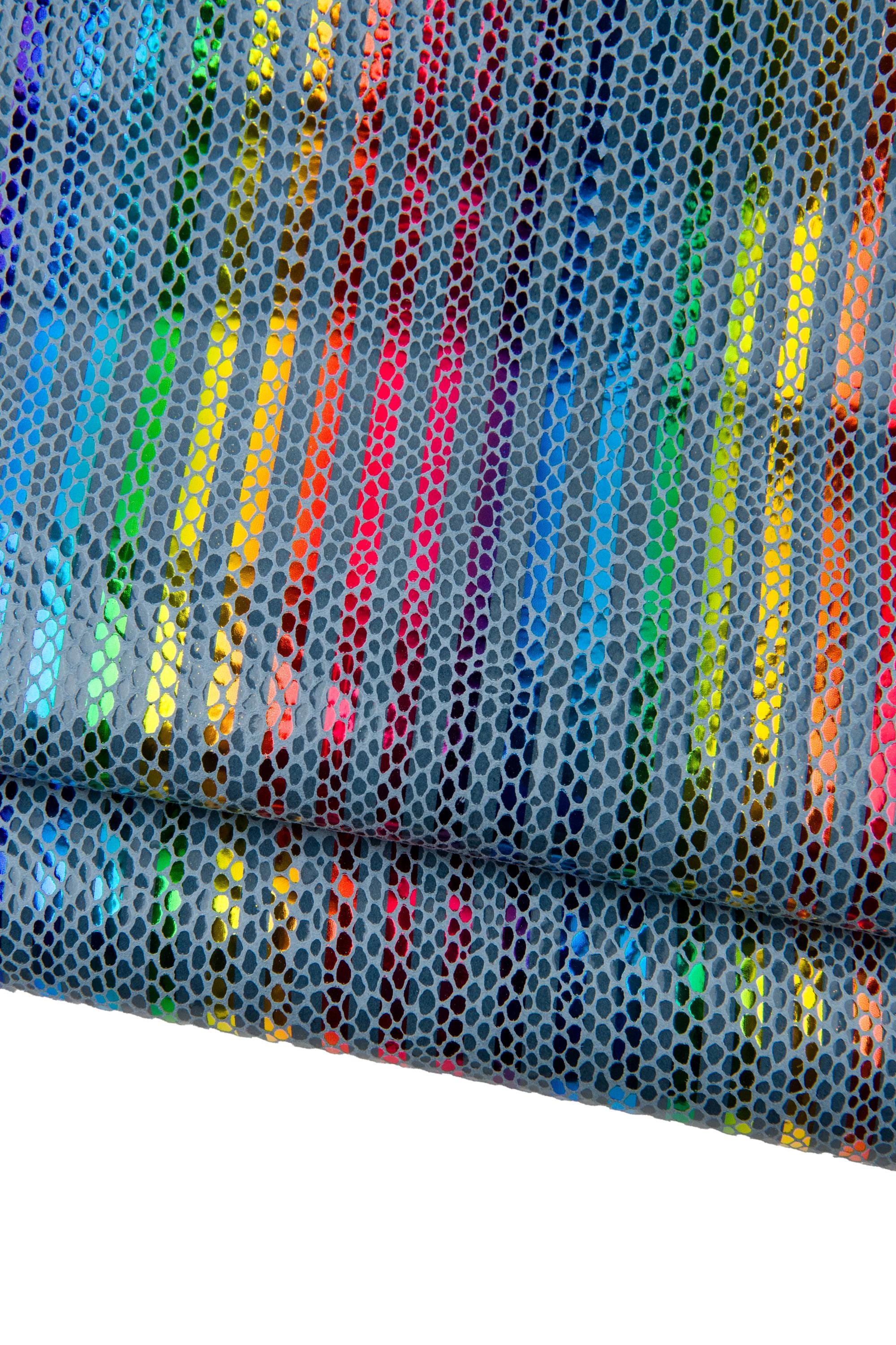 Special multicolor striped printed leather skin, dark green snake textured goatskin, rainbow textured hide for DIY projects.