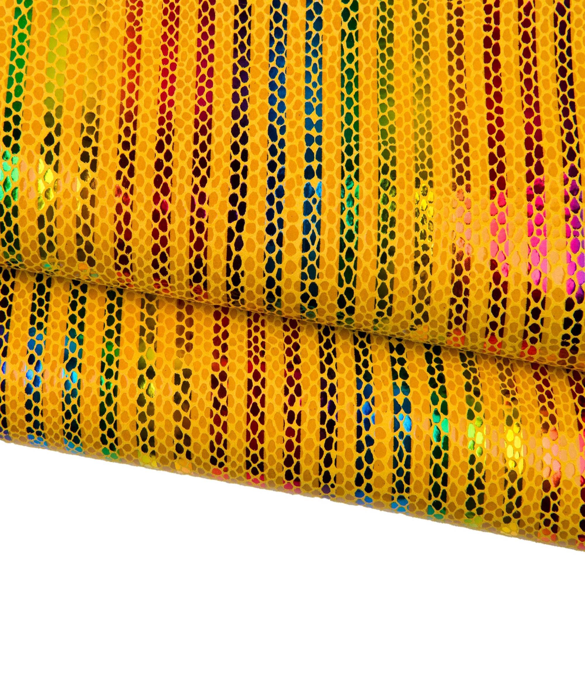 Special multicolor striped printed leather skin, yellow snake textured goatskin, rainbow textured hide for DIY projects.