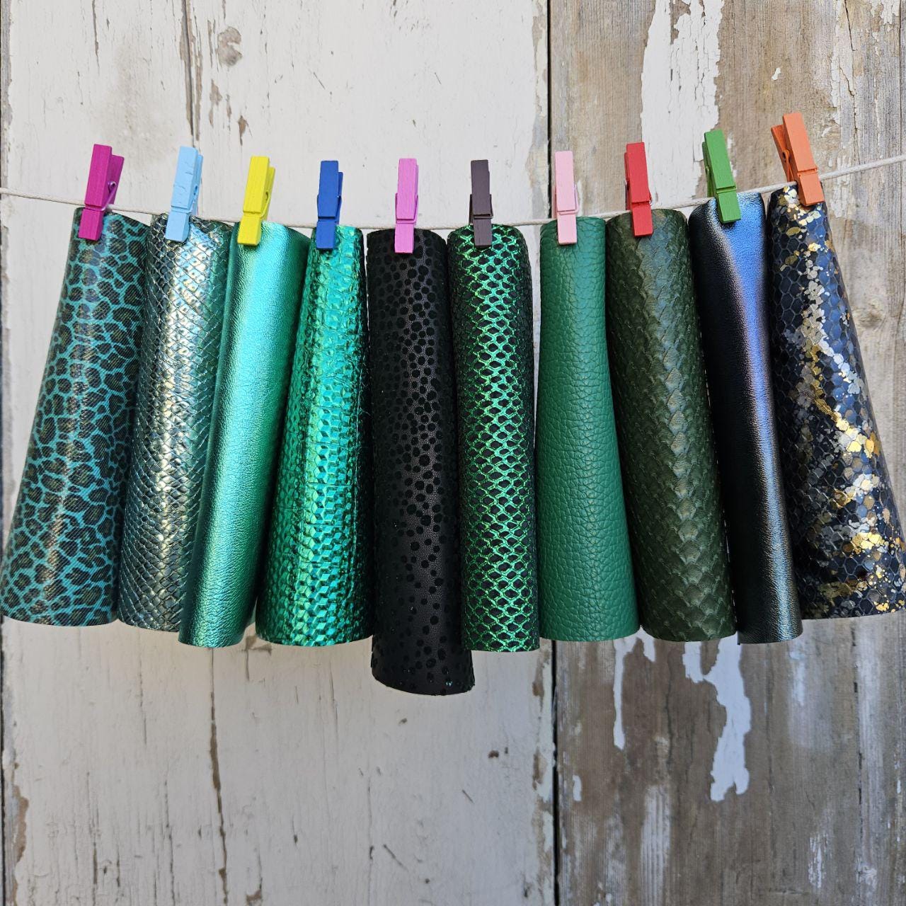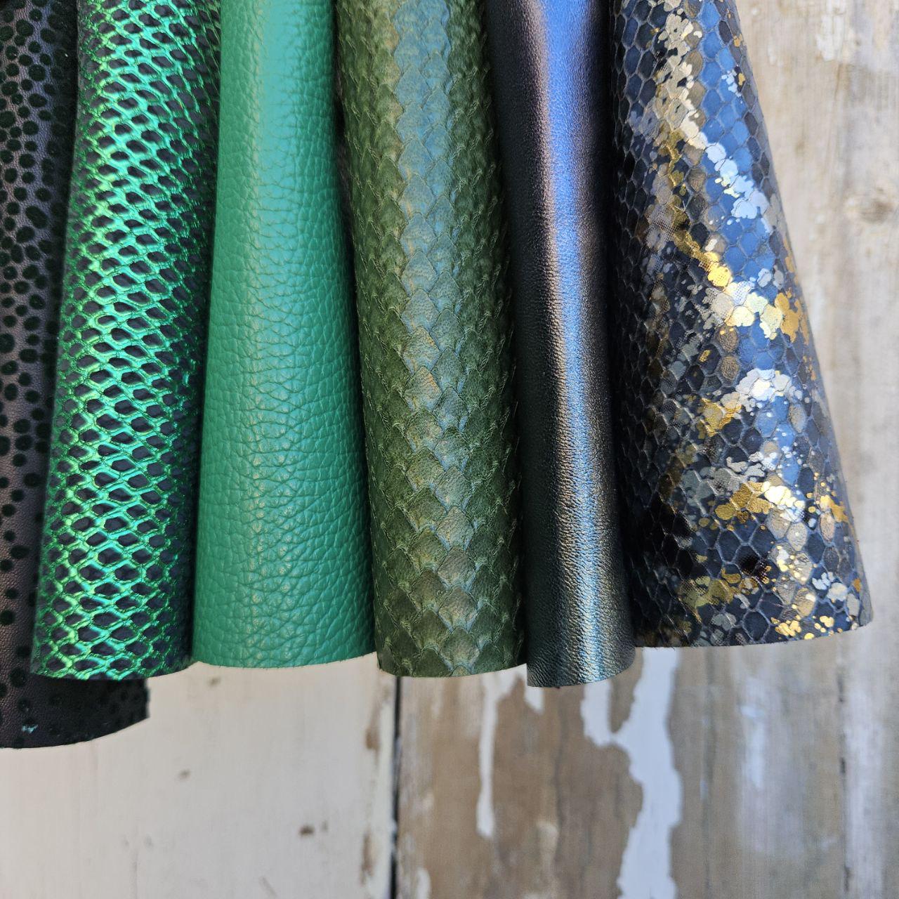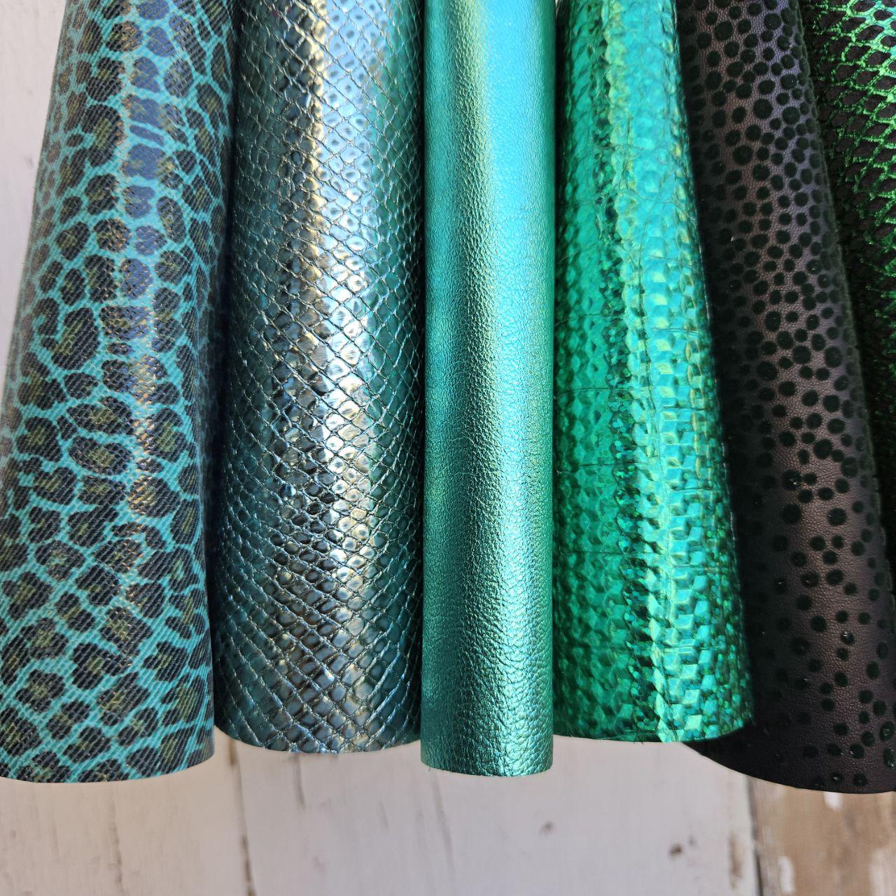 Gorgeous fancy leather pieces for lovers of green tones and python, holographic and abstract textures for your creations!