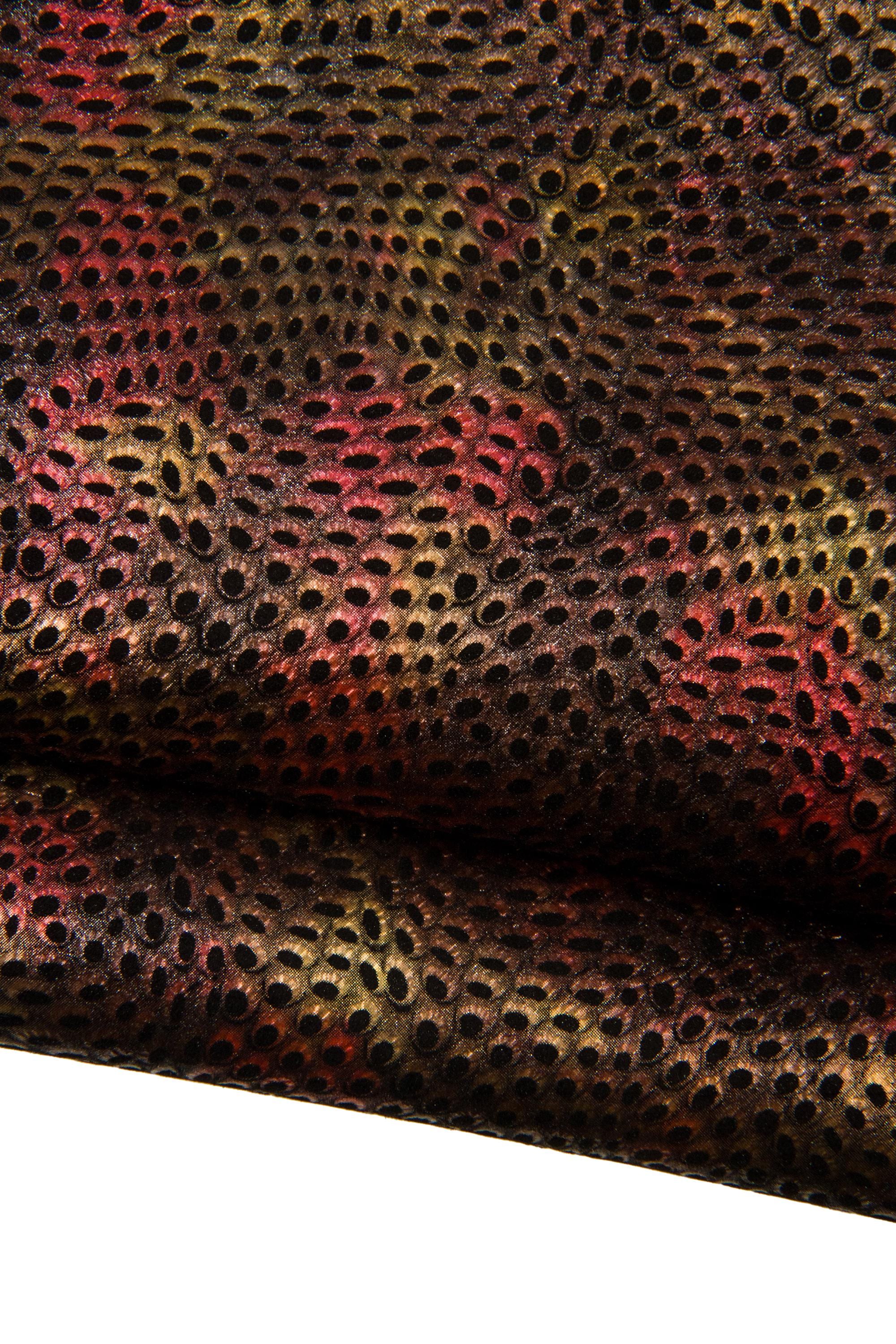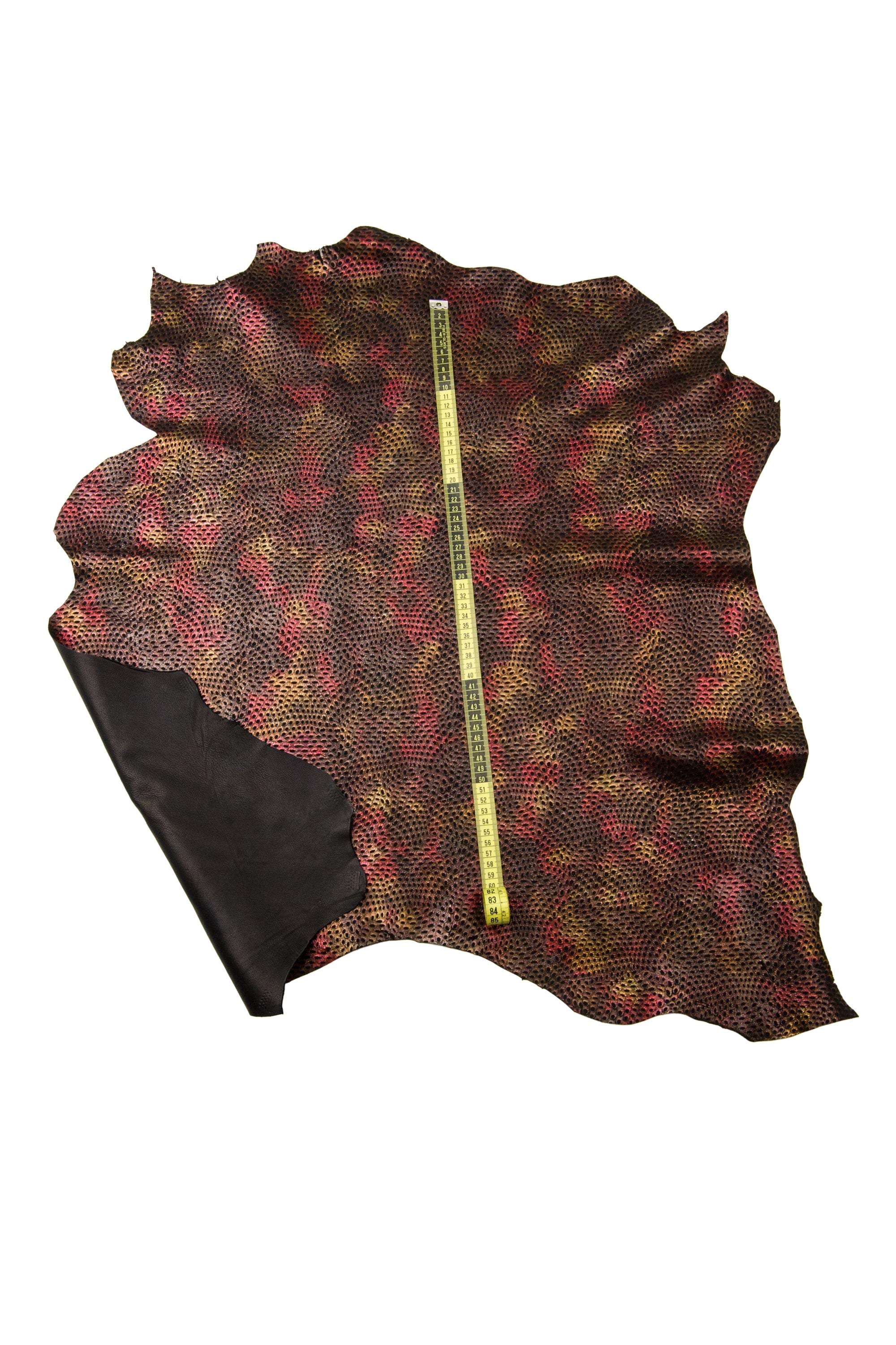 Fabulous metallic textured suede leather skin, yellow - red reptile print on black goatskin, soft ideal for hobbyists.