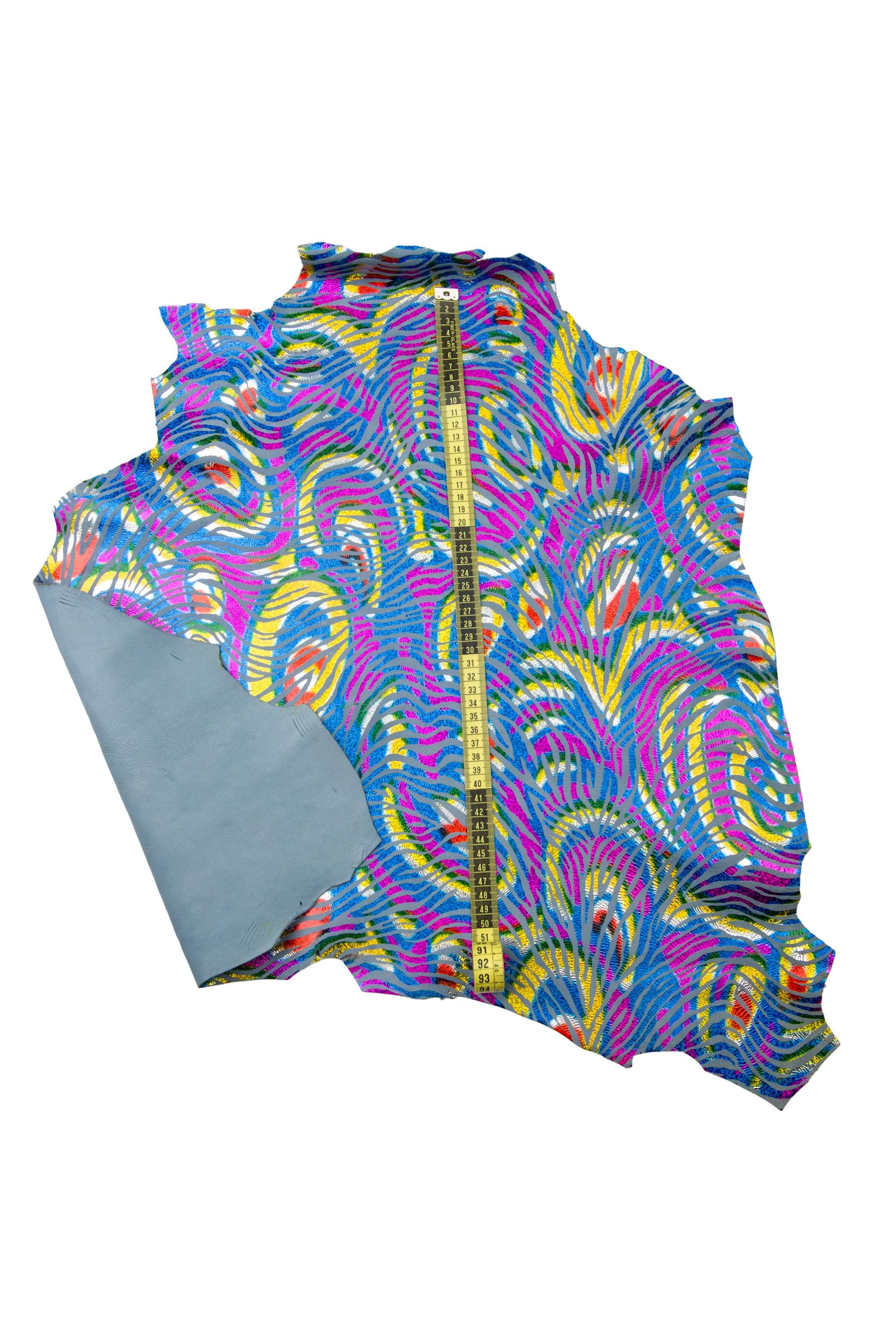 Stunning iridescent multicolor zebra printed leather skin, colorful metallic animal print on grey suede goatskin for crafters.