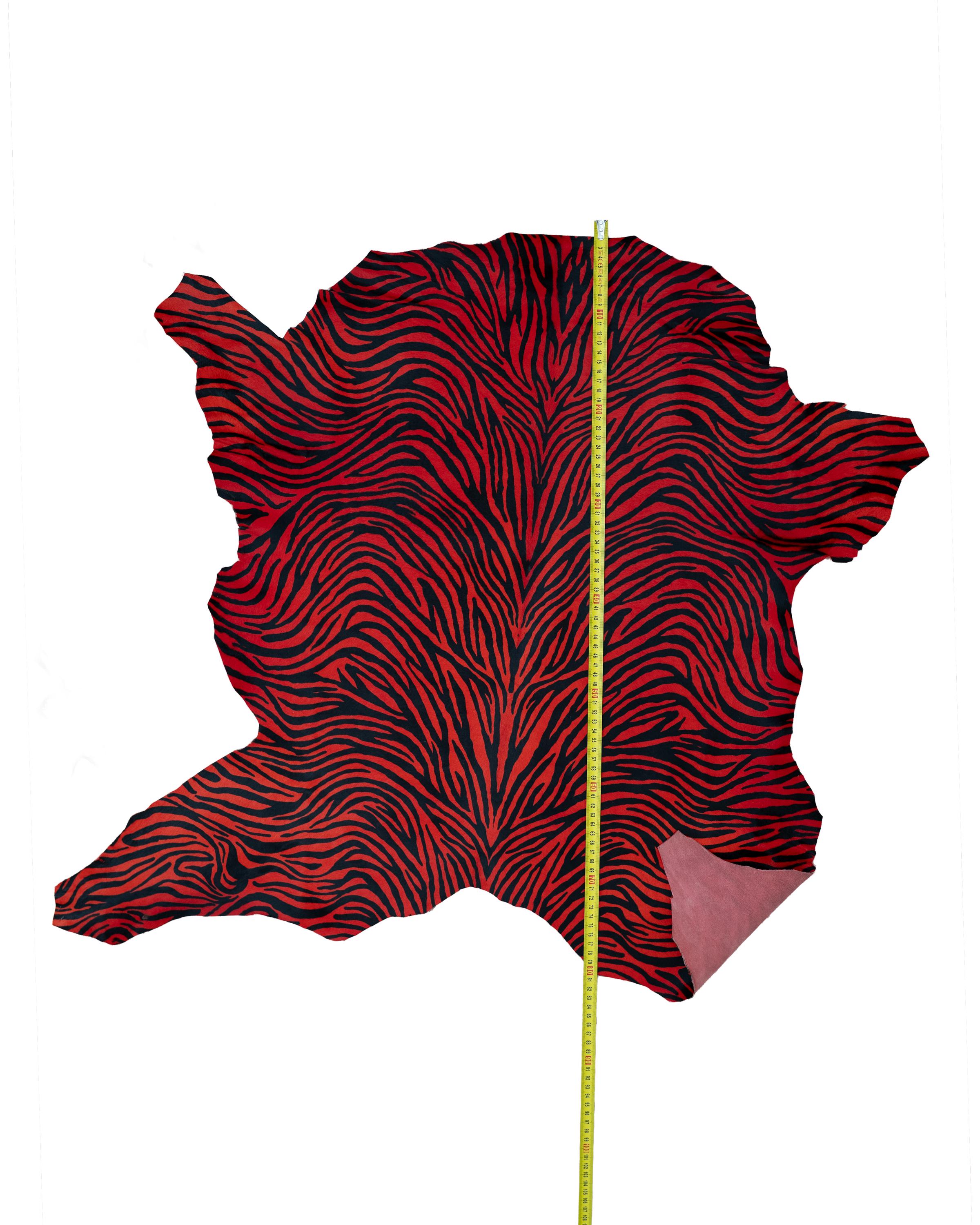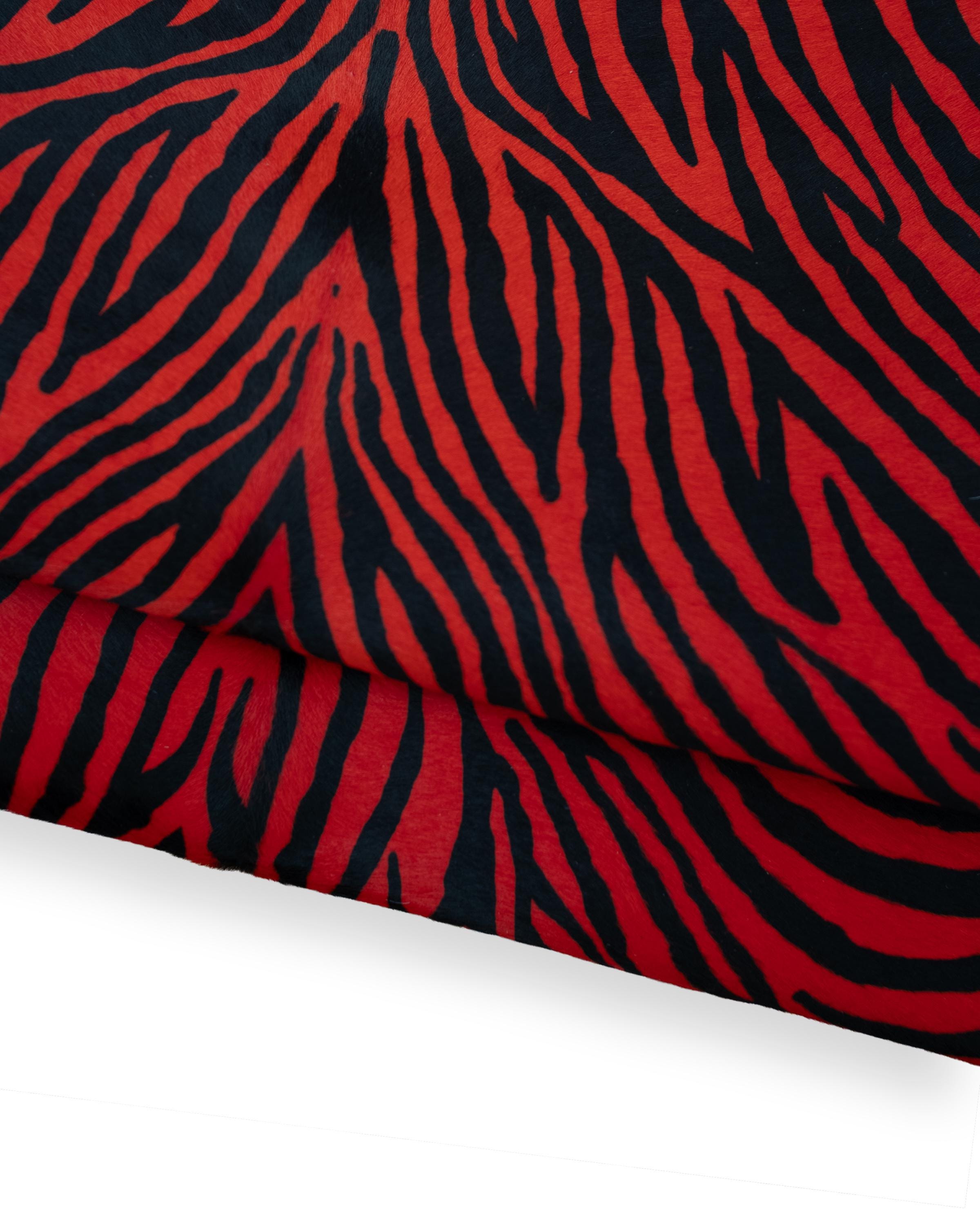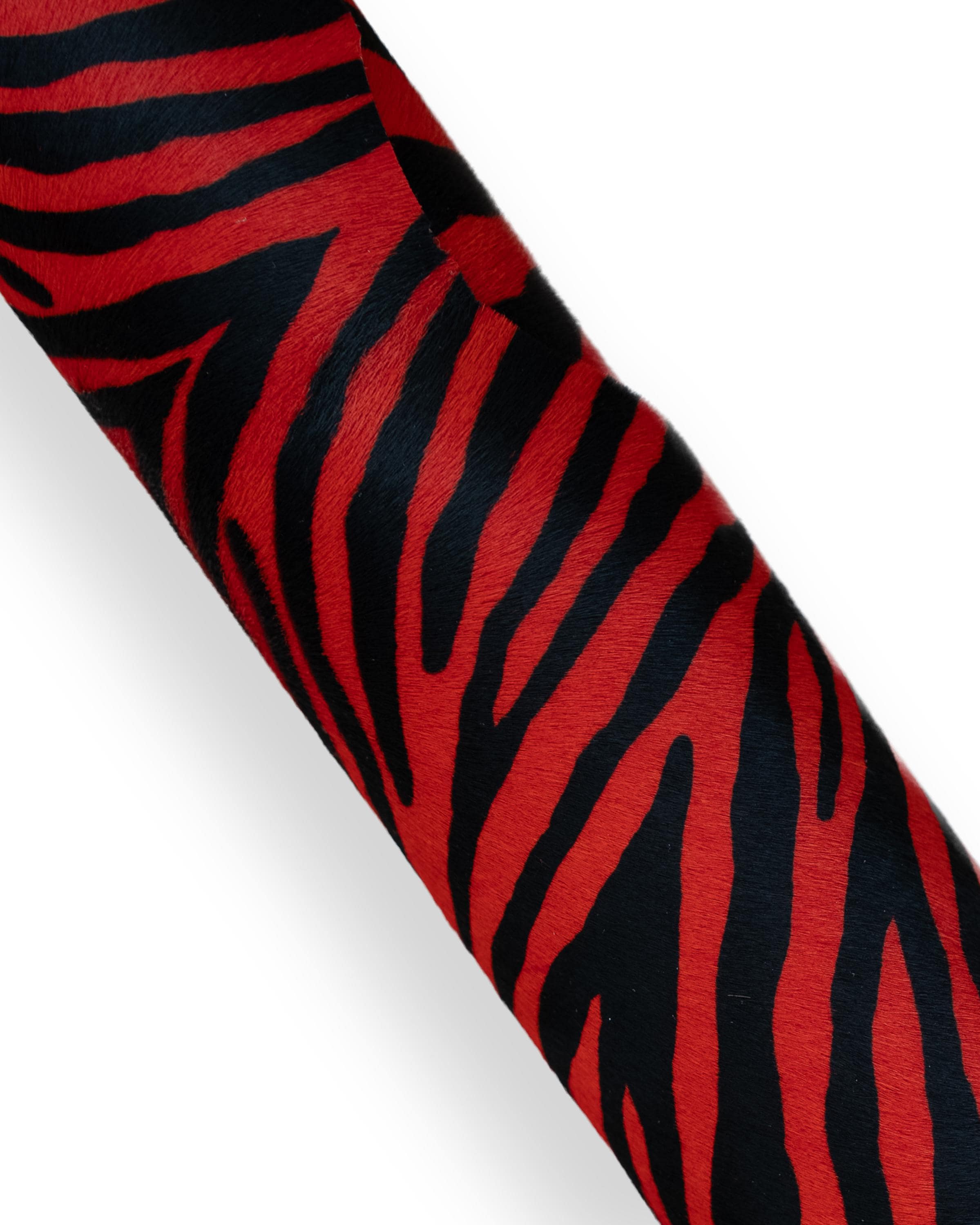 Wonderful zebra textured hair on leather hide, red and black animal print on hairy cowhide, elegant pony leather for crafting.