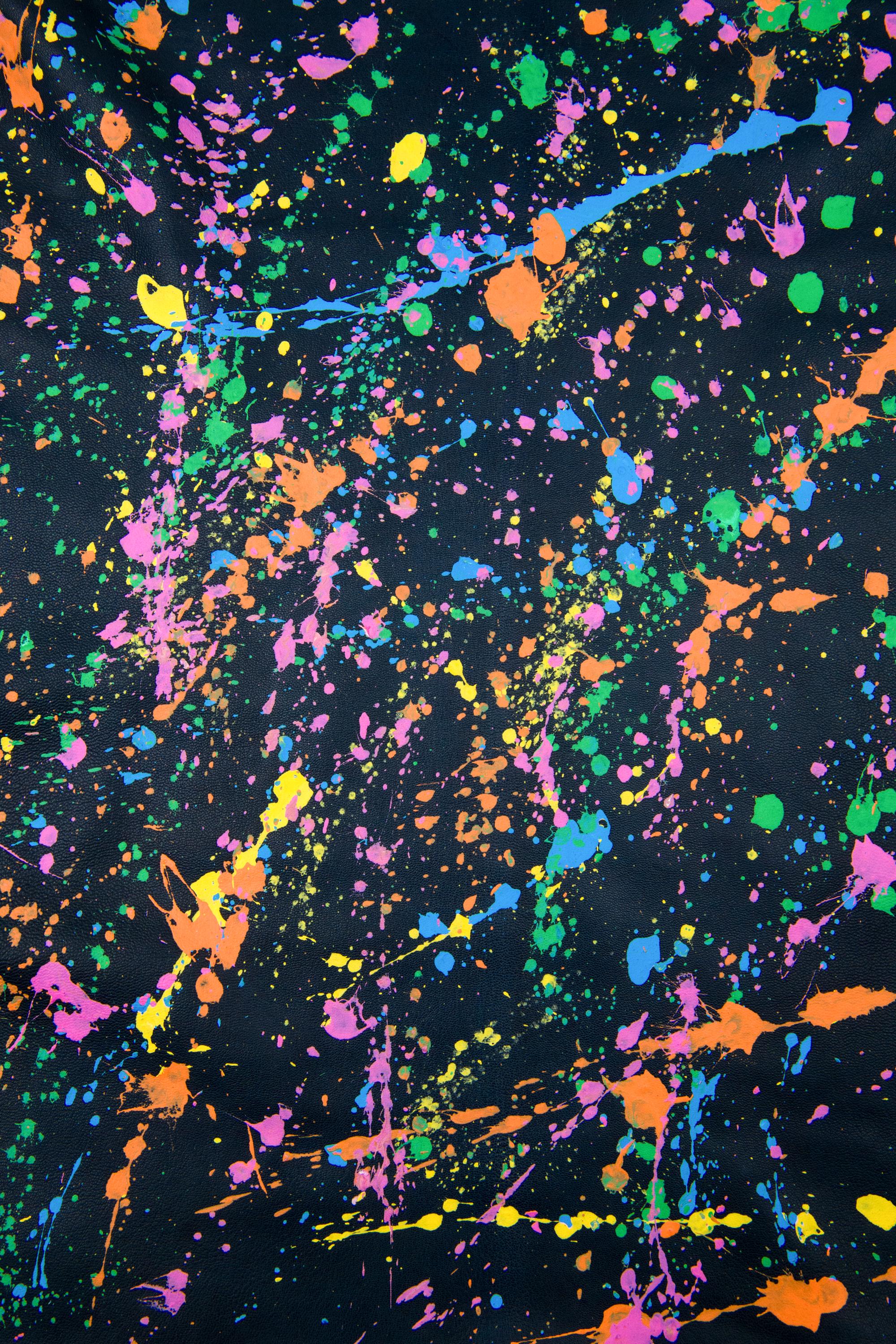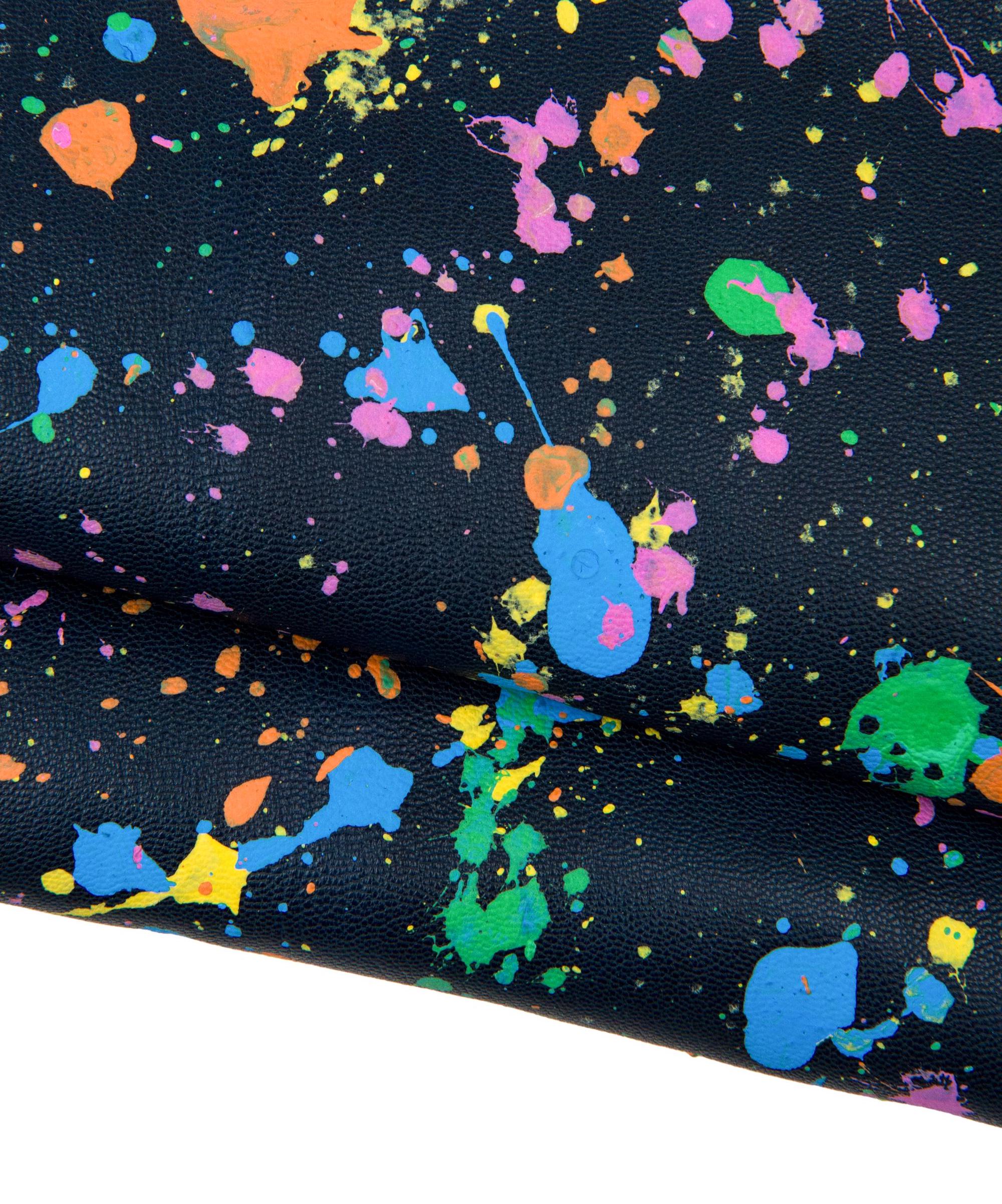 Unique multicolor splash print on black goatskin, pollock pattern, hand painted skin, for hobbyists.