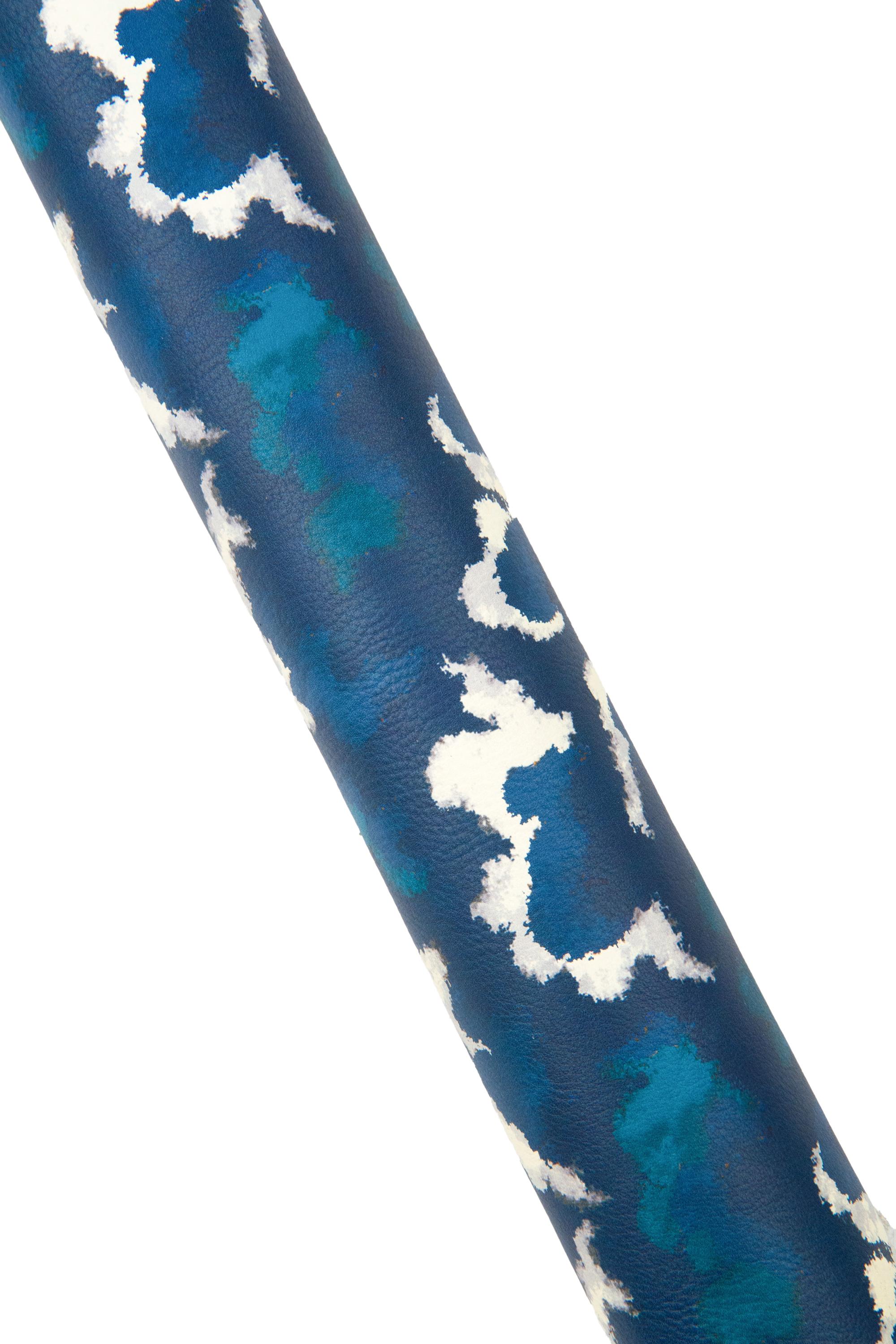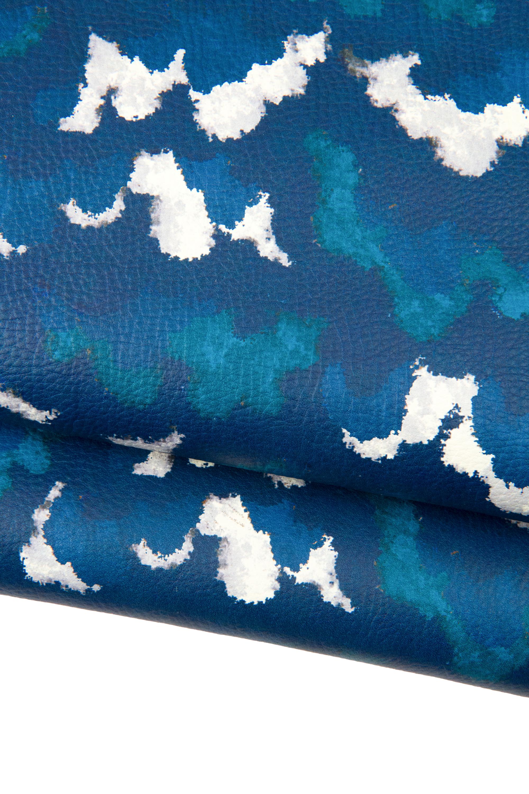 Unique blue printed leather hide, abstract pattern on semi glossy calfskin, grainy cowhide for crafters. Ideal for any kind of handcrafted creations.