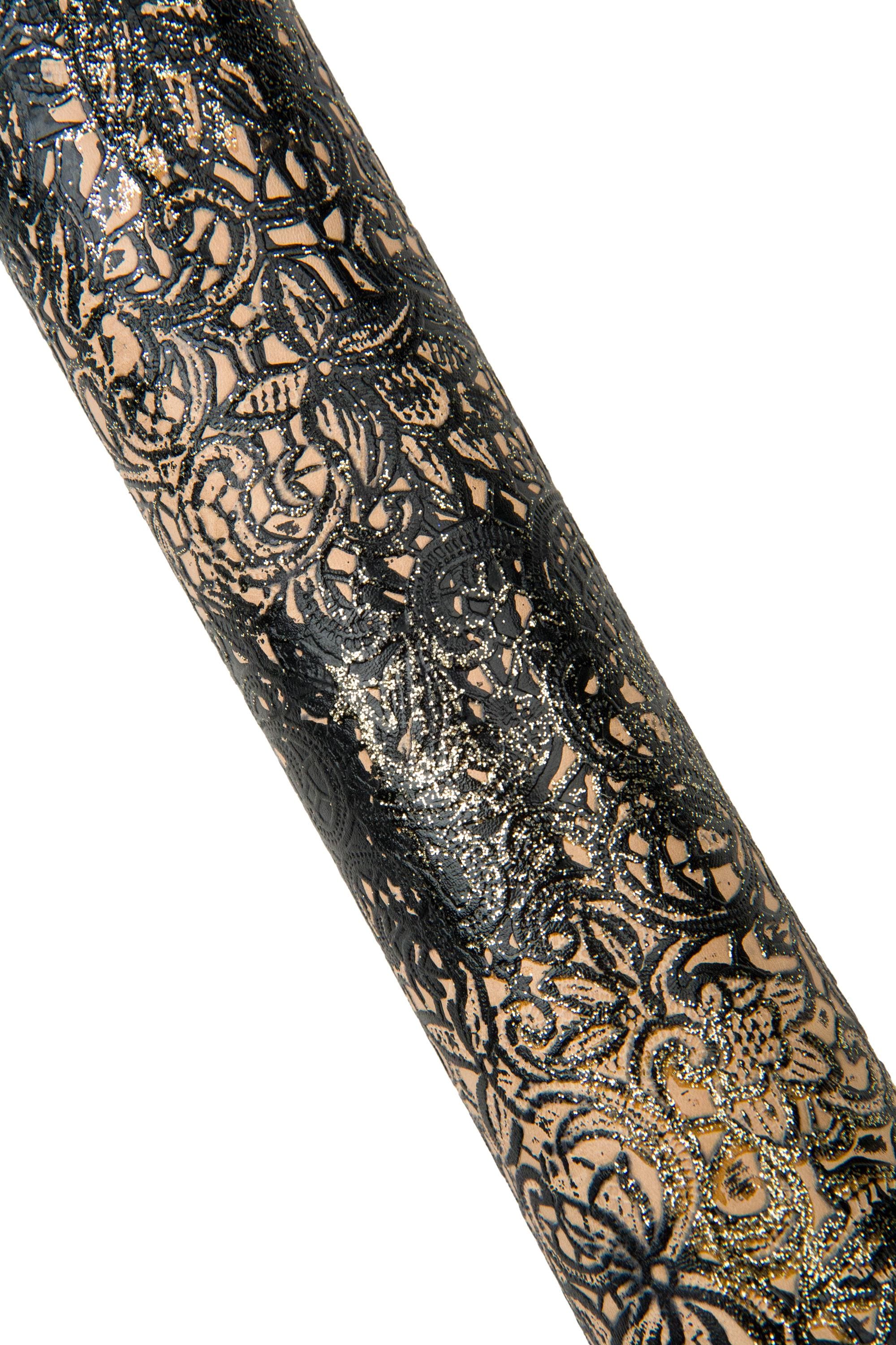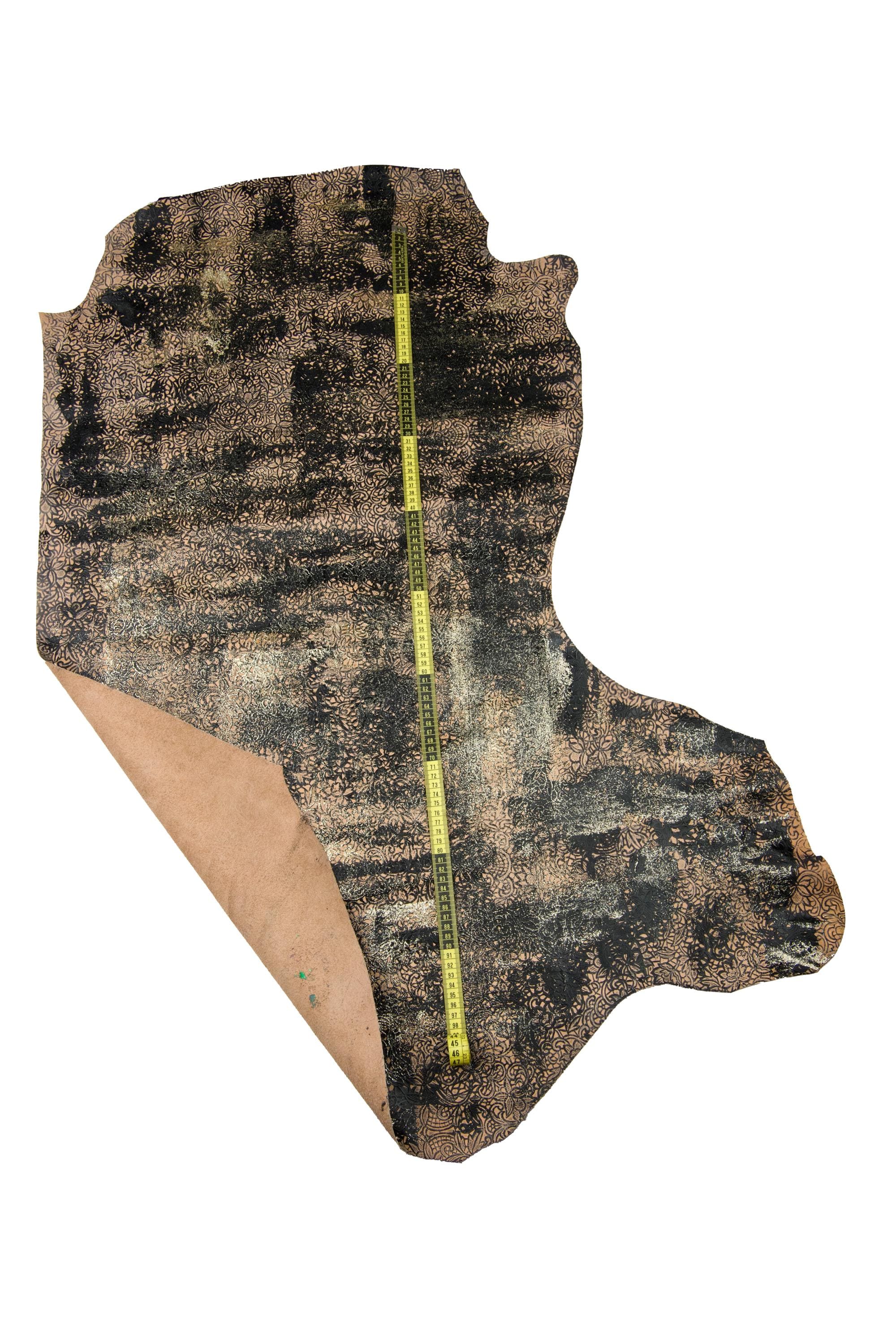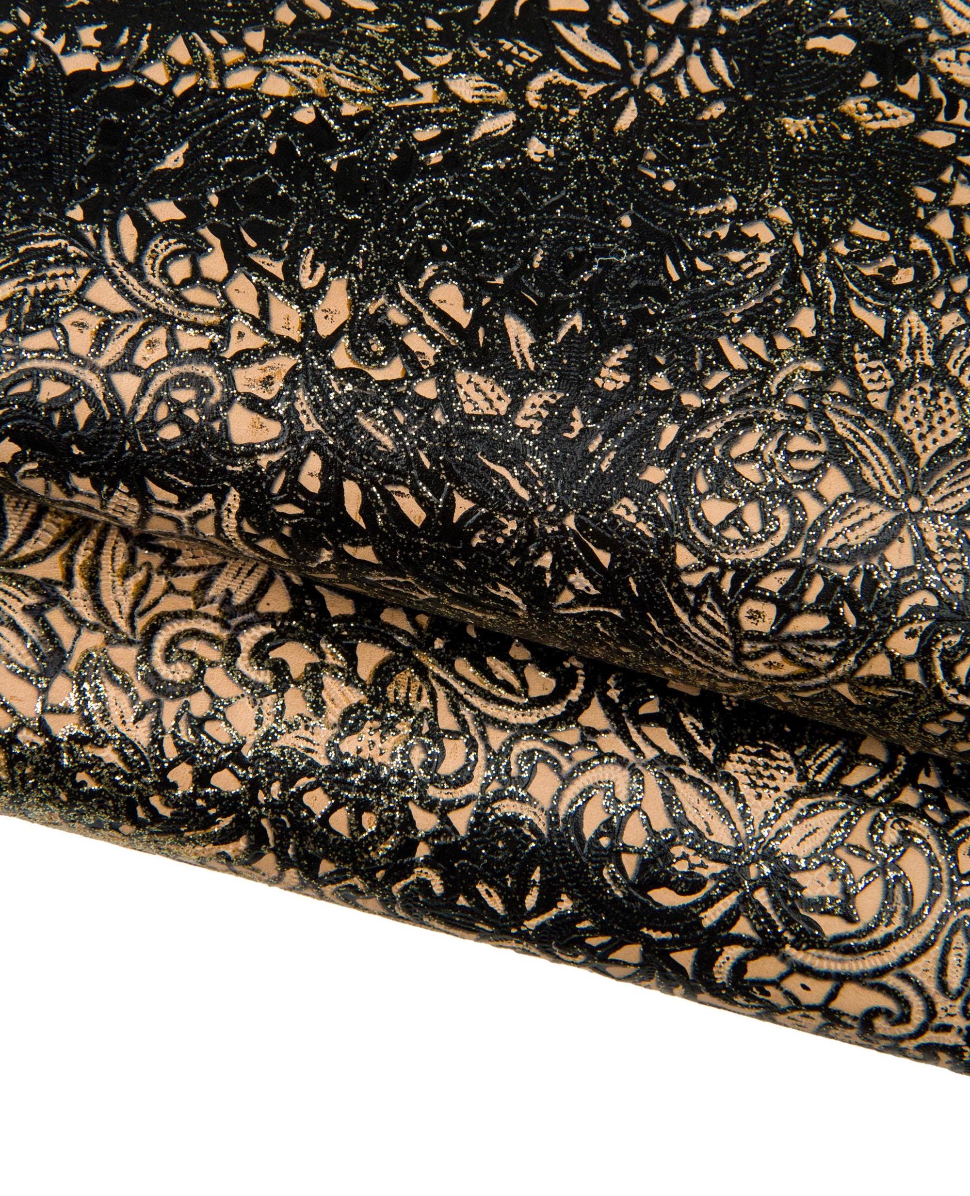 Fabulous floral printed laminated goatskin with beige - black glitter, medium softness for your projects.