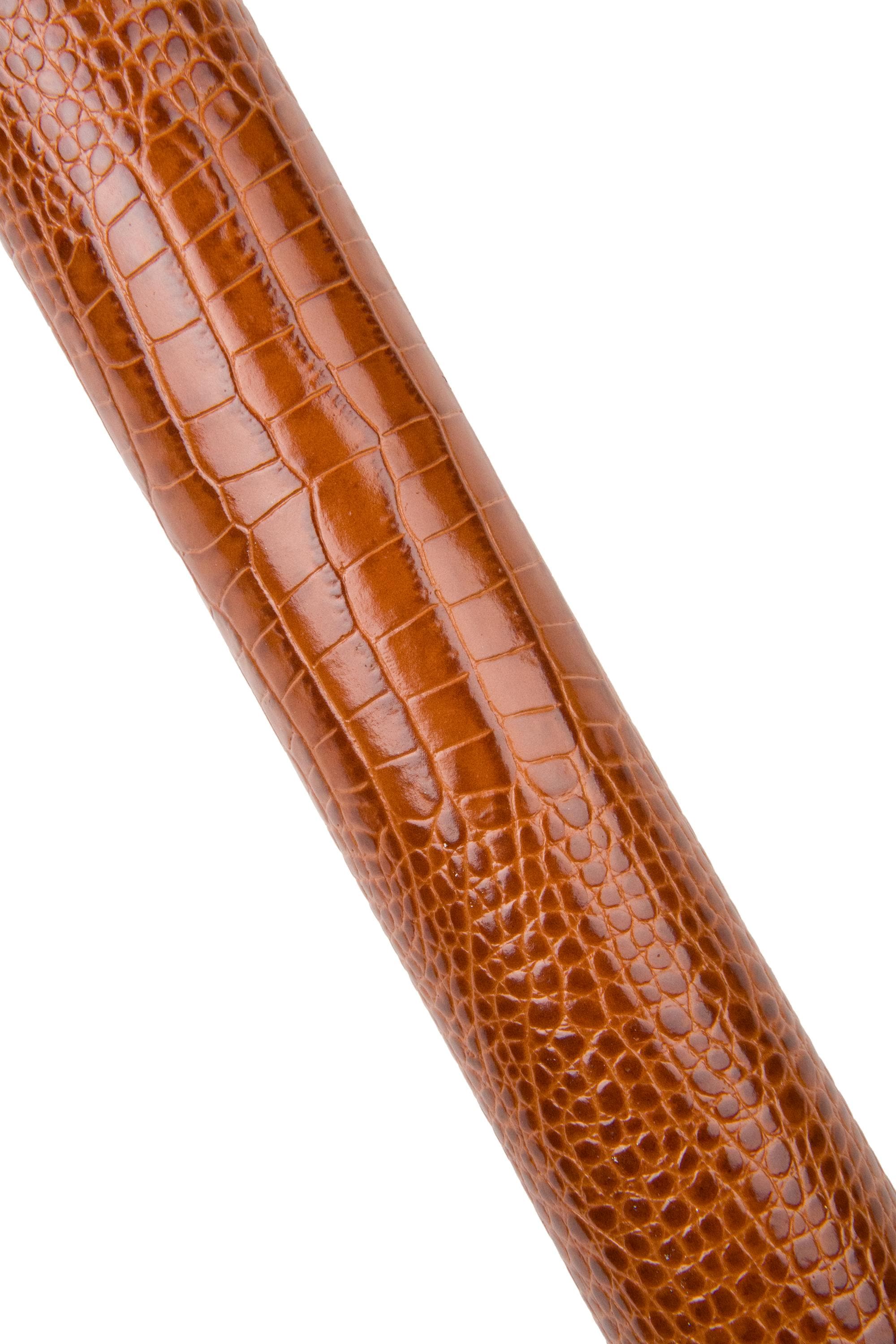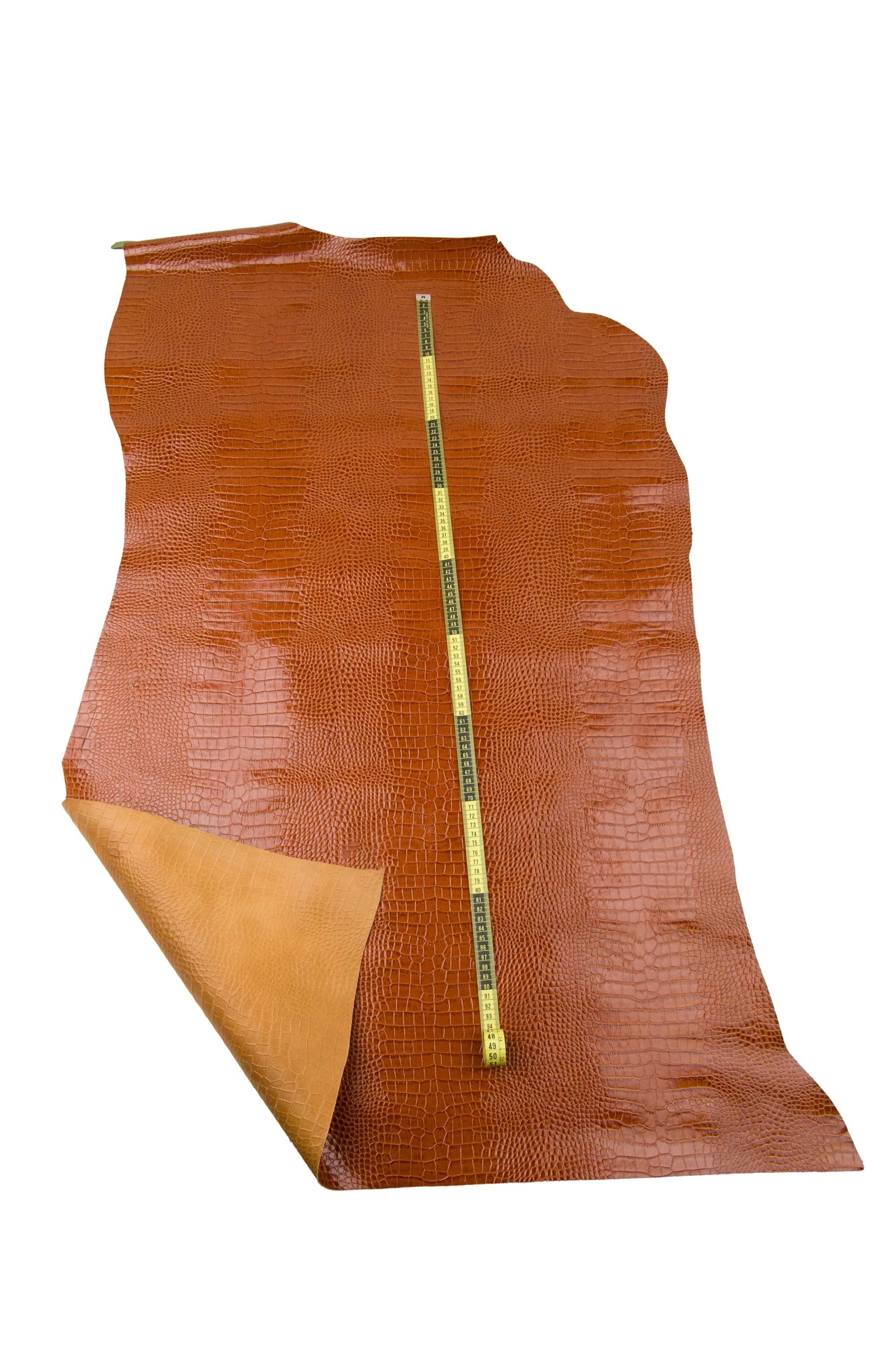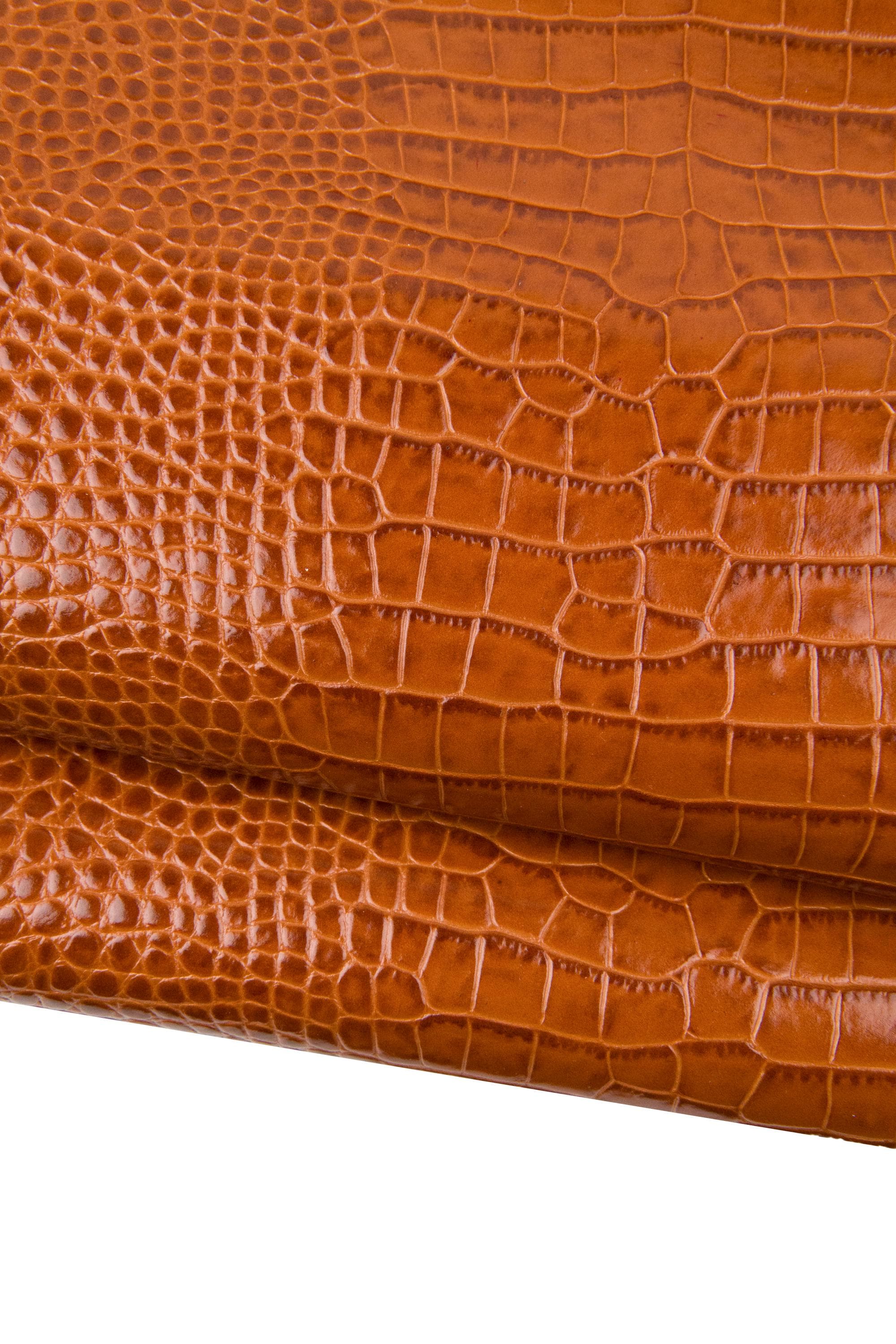 Wonderful tan crocodile embossed leather hide, brown top quality glossy calfskin, alligator printed cowhide. Medium softness. Ideal for bags, purses, wallest and other handcrafted items.