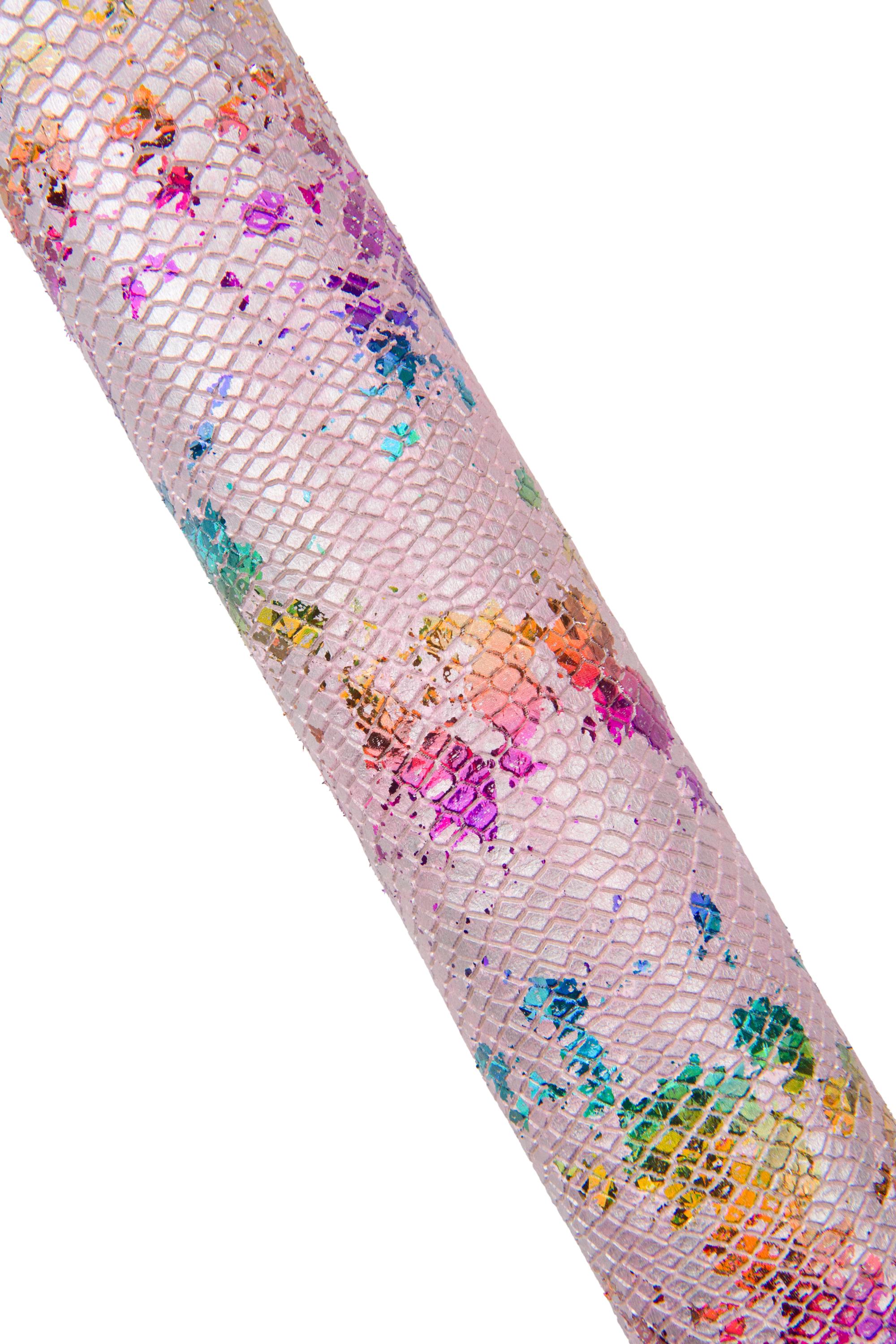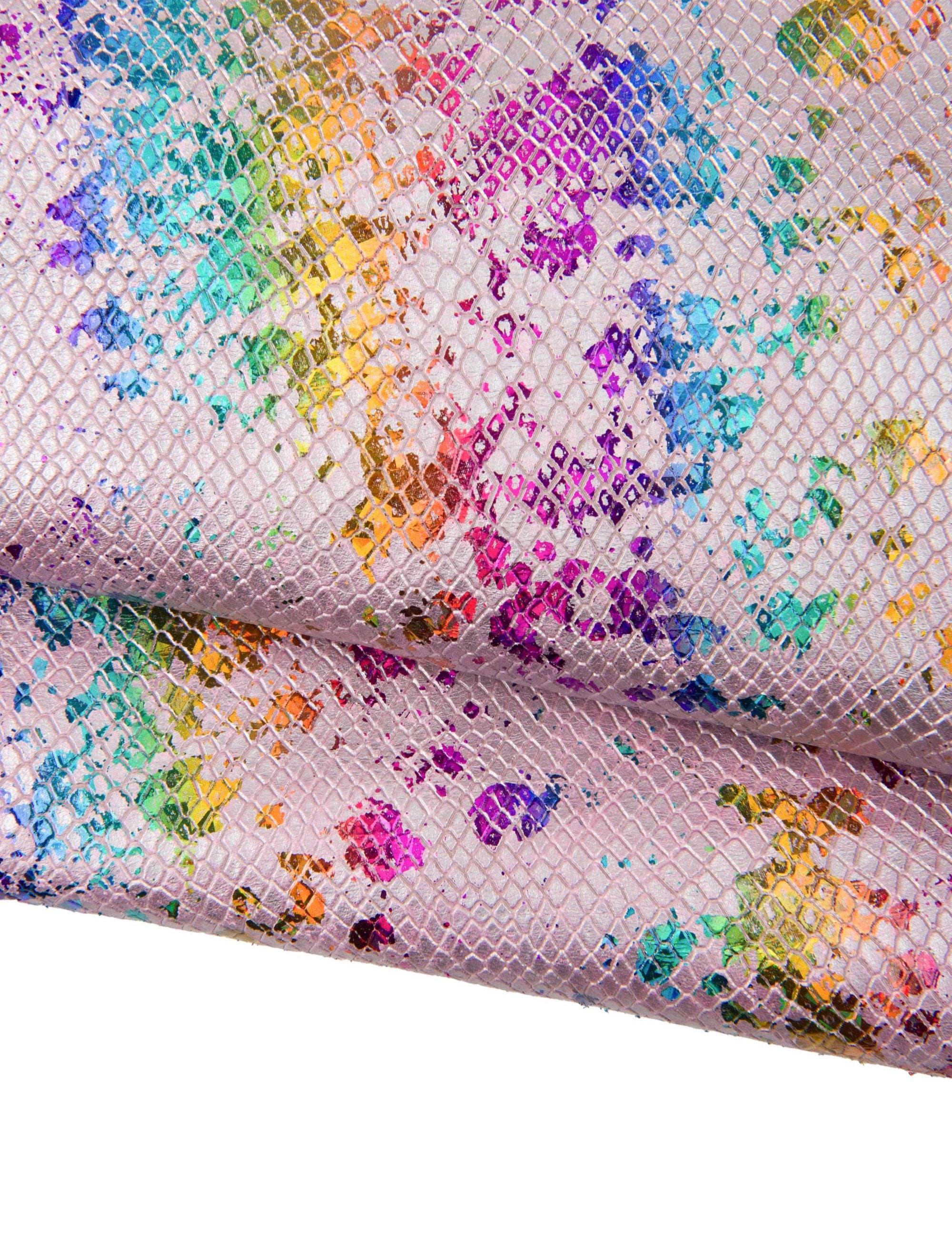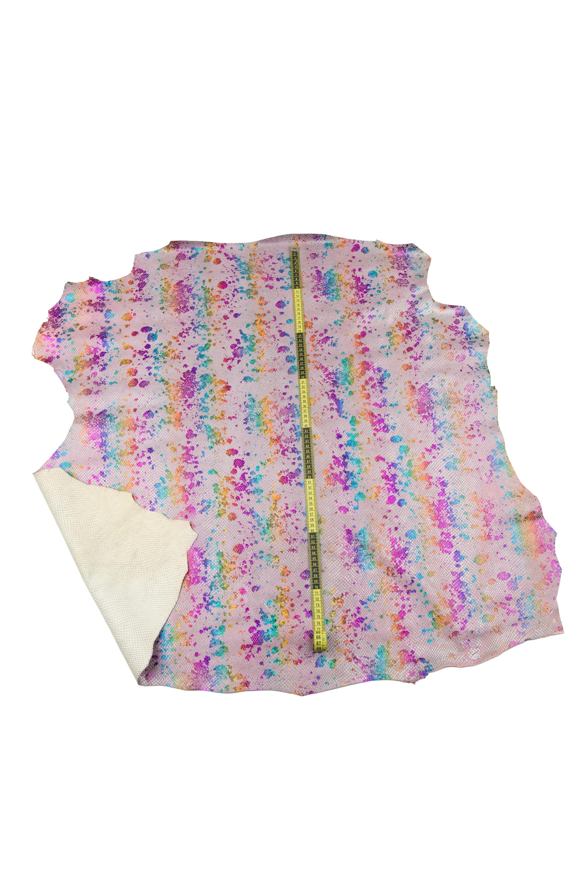 Stunning multicolor holographic metallic snakeskin, splash print on pink python textured goatskin, soft metallic hide for hobbyists.