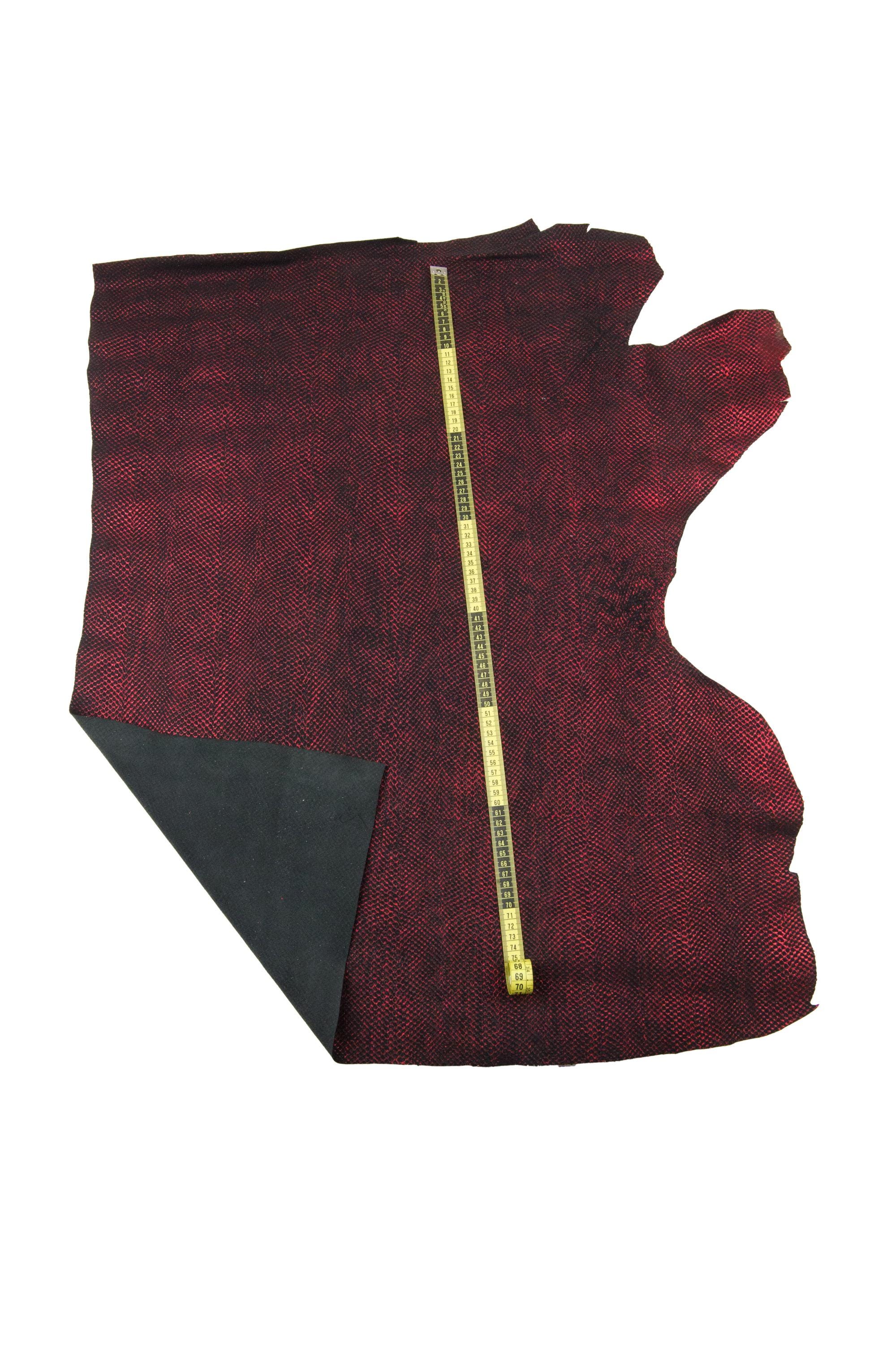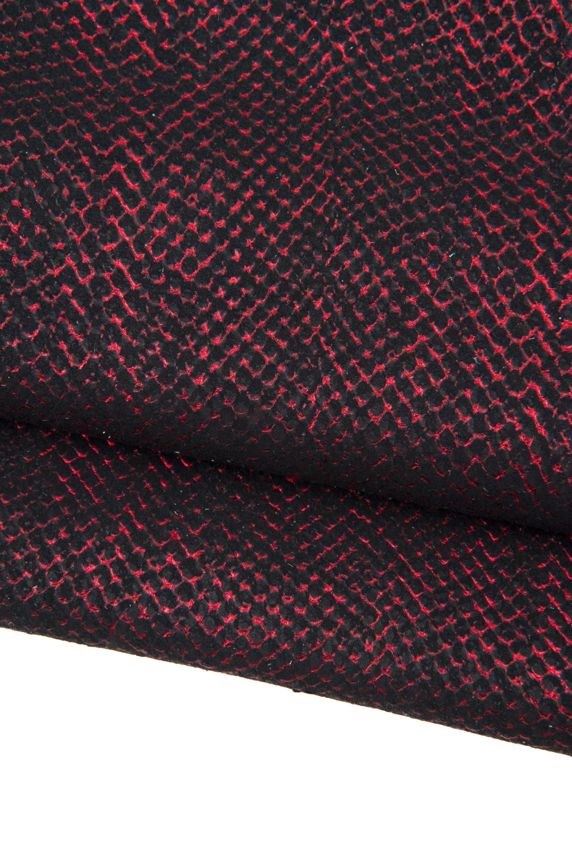 Stunning snake textured leather hide, black - red metallic calfskin, soft suede printed calfskin for crafting.