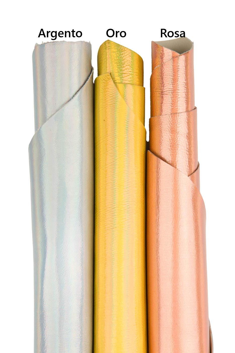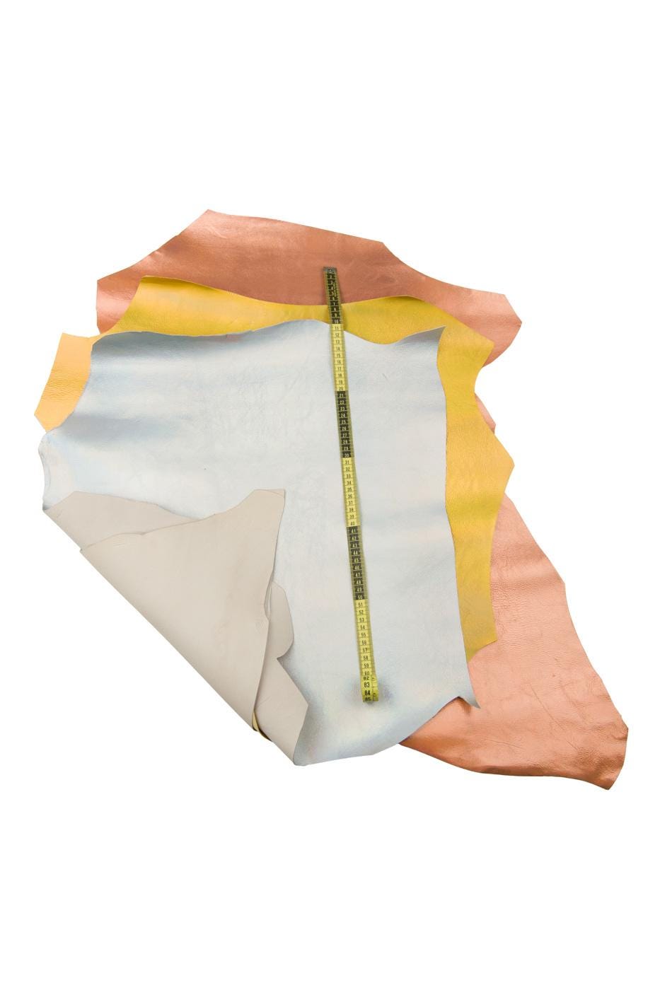 Amazing iridescent metallic leather skin, silver, gold, pink bright sparkle goatskin, soft wrinkled hide. Ideal for DIY projects.