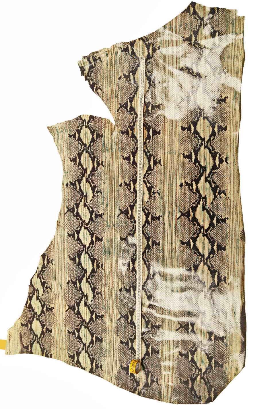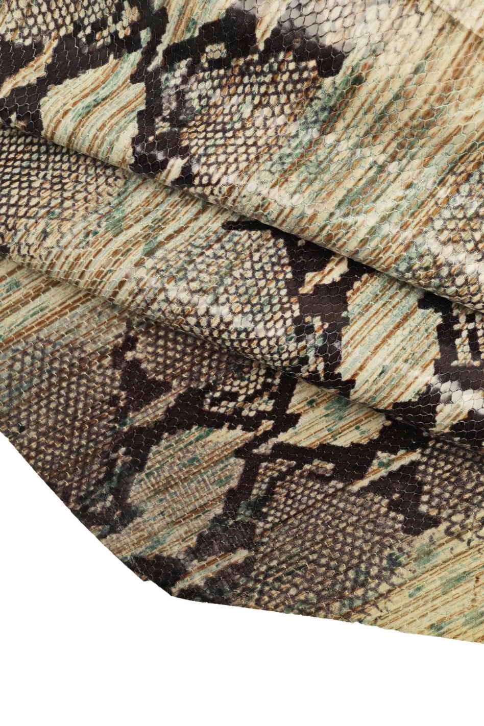 Genuine leather hide calfskin, python snake textured calfskin, multicolor stripe print cream/ brown/ green italian skin for crafting.