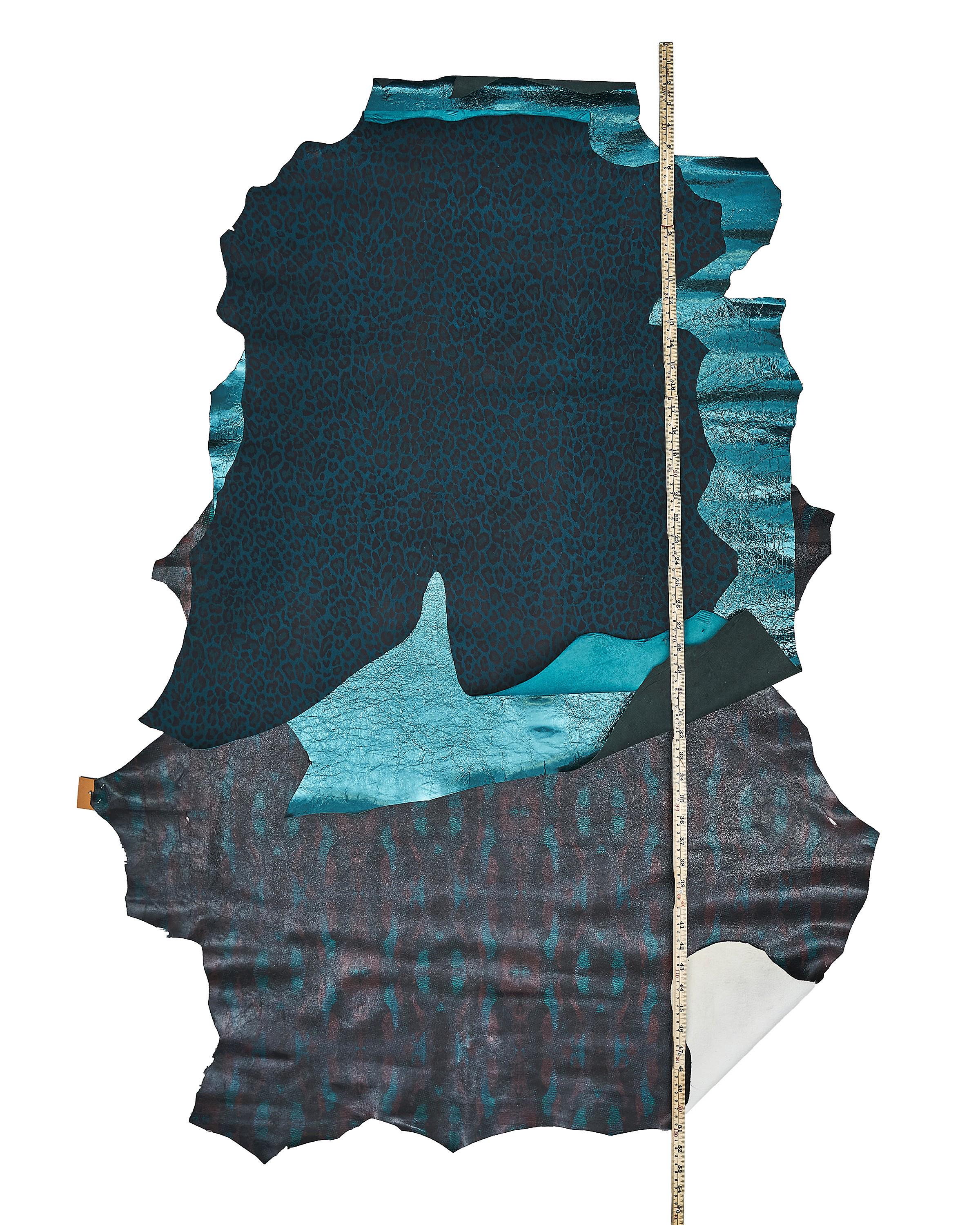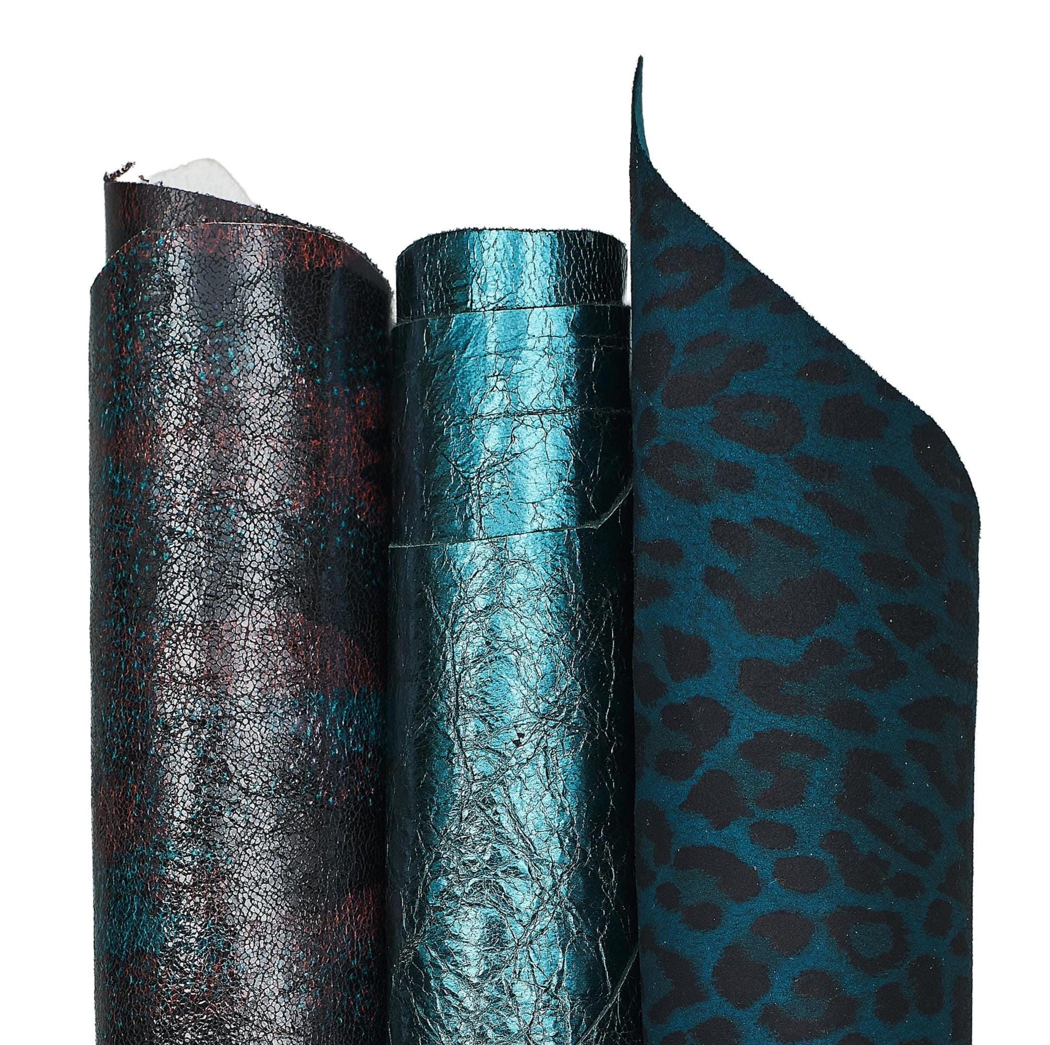 Wonderful set of 3 green petrol and black metallic leather skins, leopard printed goatskins, for your creations.