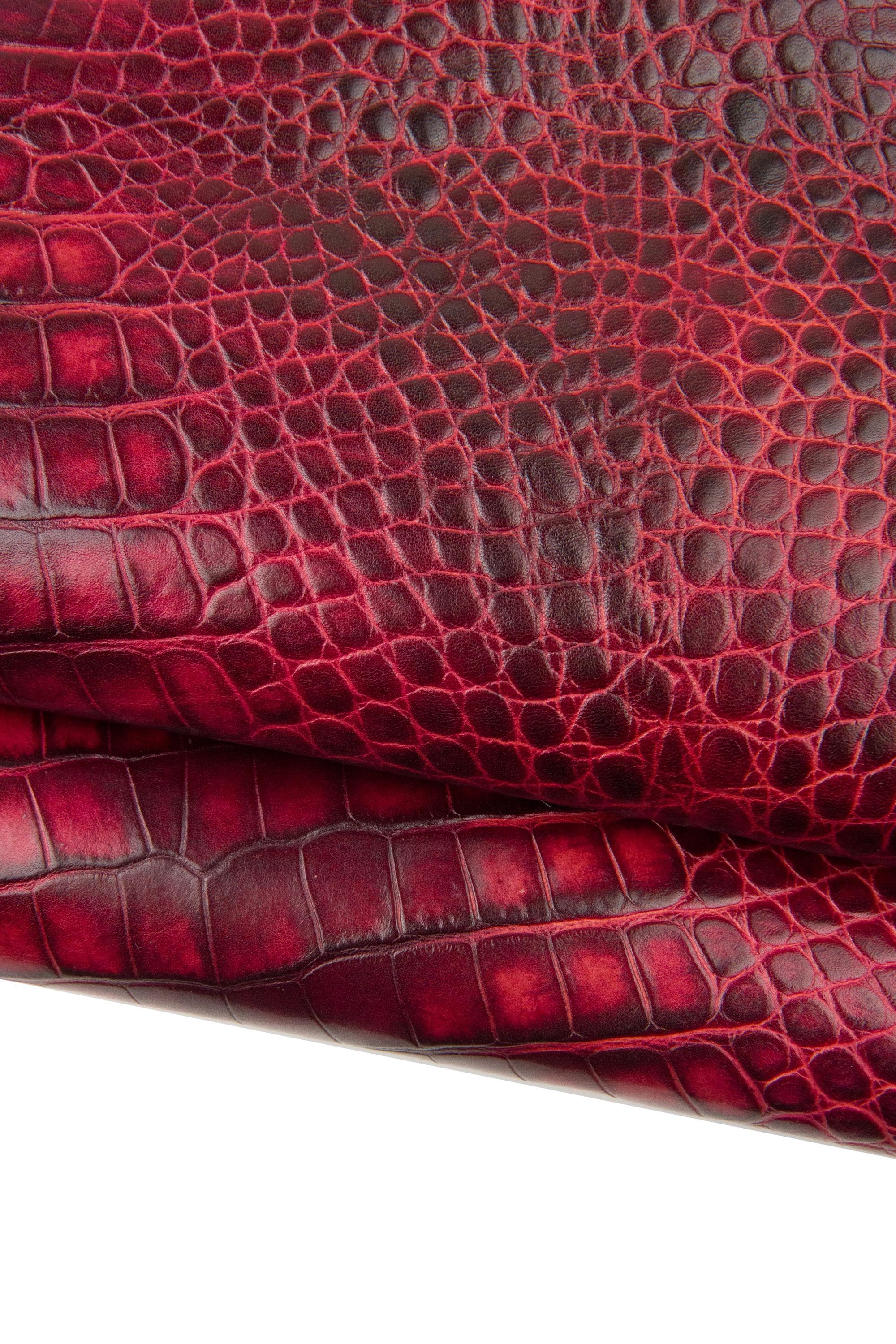 Stunning dark red crocodile embossed leather hide, alligator print on glossy shaded cowhide, standard temper. Ideal for elegant crafted creations.