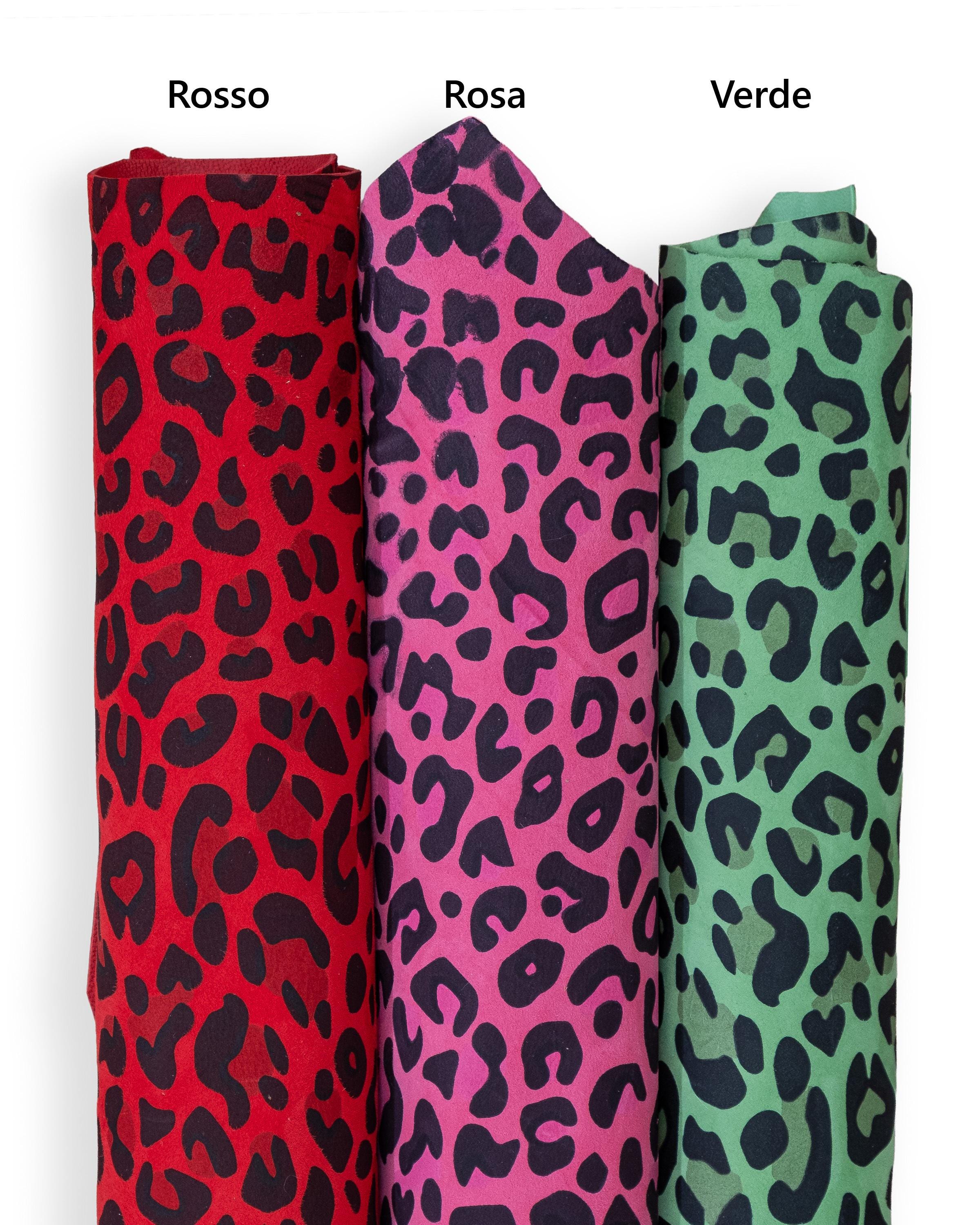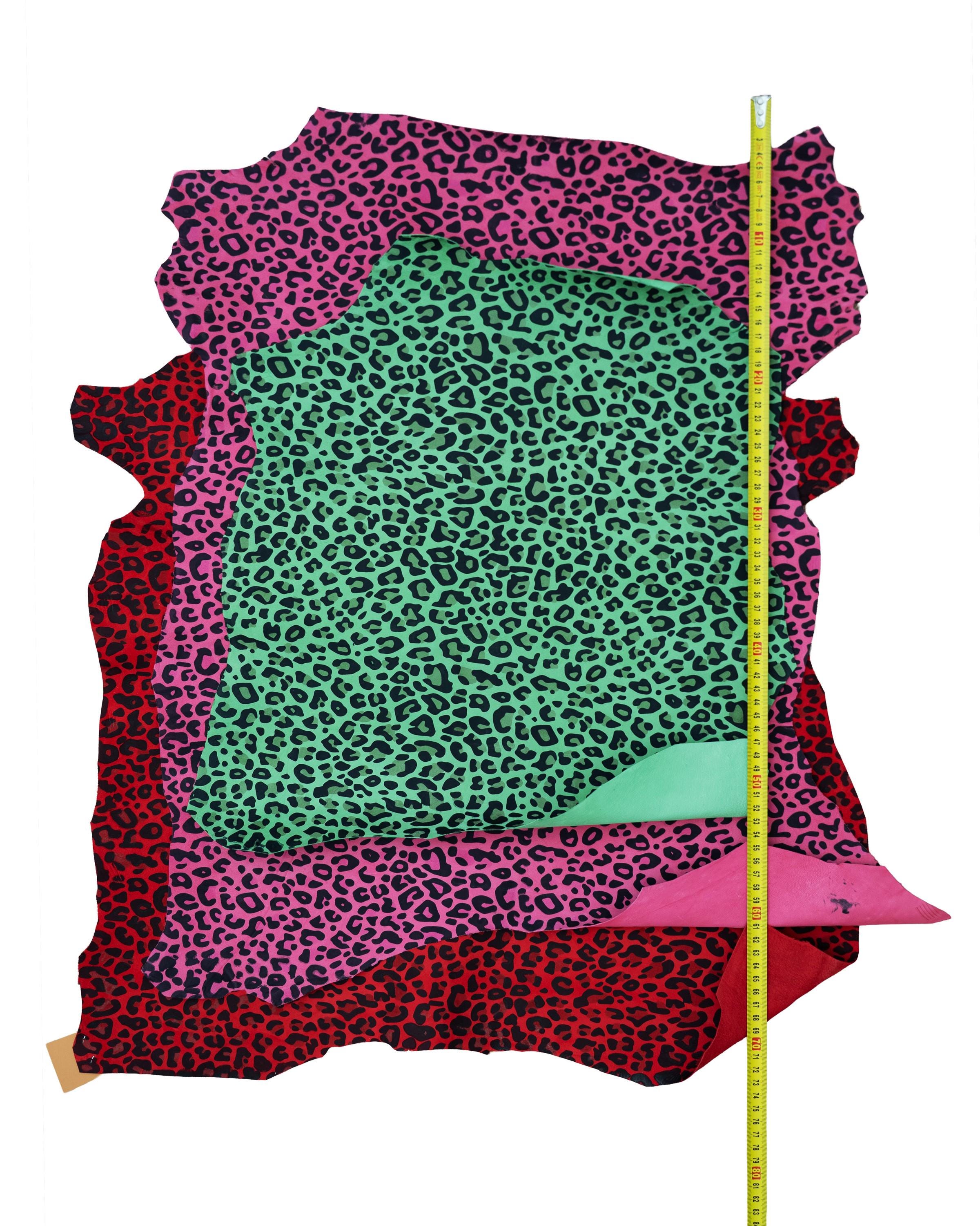 Stunning leopard textured leather skin, animal print suede goatskin, cheetah pattern on red - pink - green soft skin.