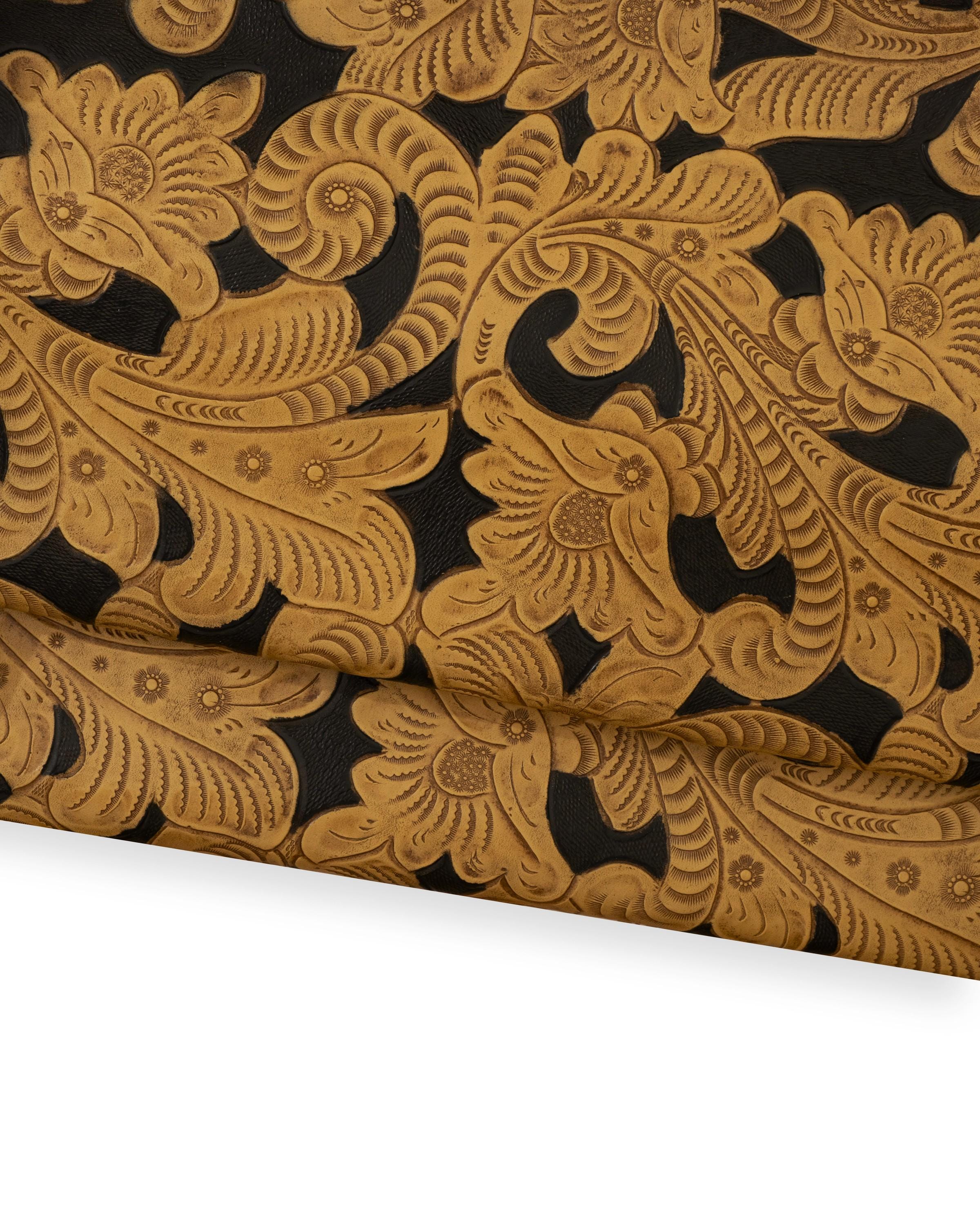 Incredible floral printed leather hide, brown - beige embossed cowhide, flower pattern on stiff calfskin. Ideal for crafters.