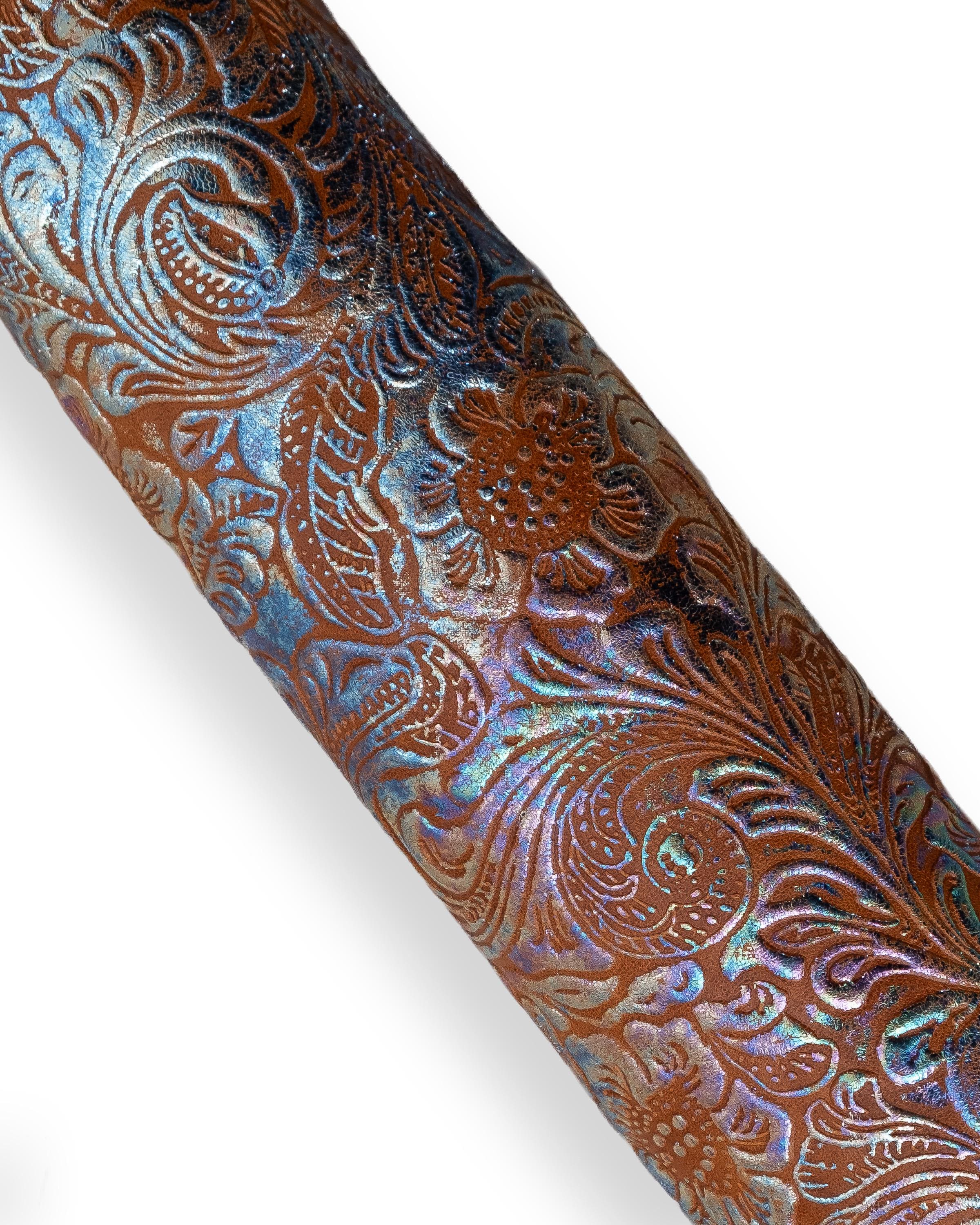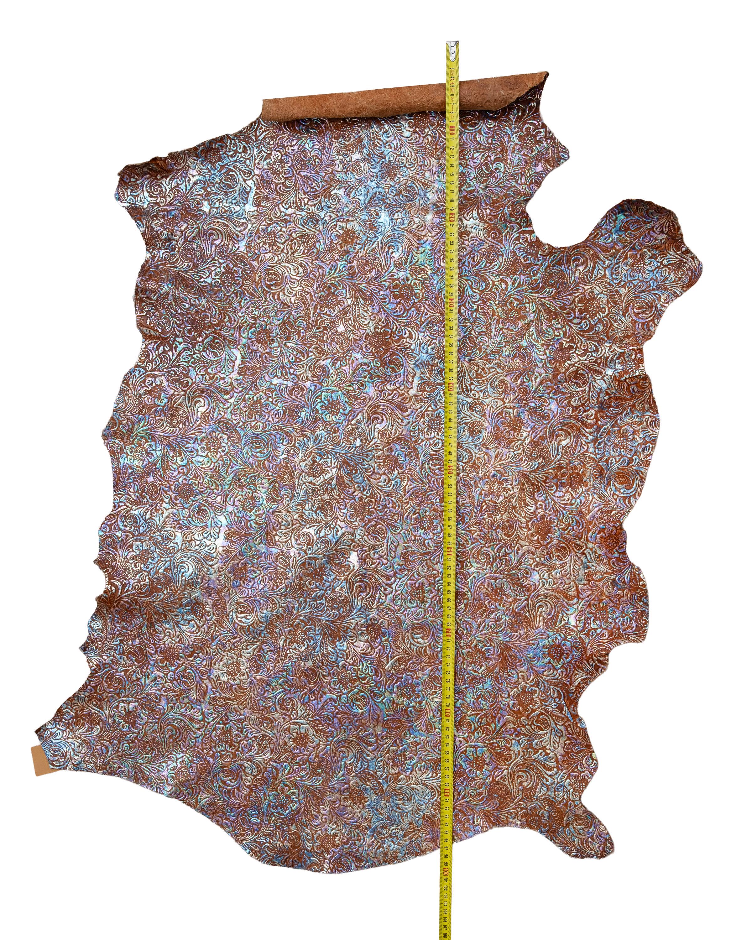 Wonderful iridescent floral printed goatskin, light browh metallic charro embossedcalfskin leather for your creations