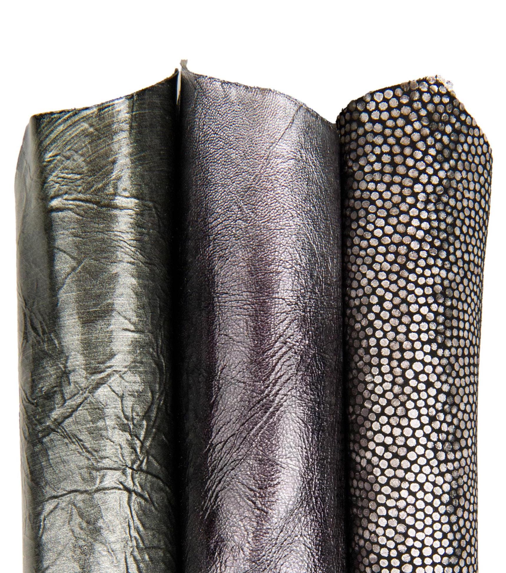Wonderful set of 3 grey, steel leather skins, assortment of metallic printed textured goatskins as per pictures.